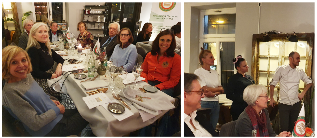 A Francoforte si è celebrato il tema dell‘anno "La tavola del contadino, il campo, il cortile, la stalla nella cucina della tradizione regionale" con un menu di 5 portate preparato da Massimo Sparaco, cuoco e titolare del ristorante “Il Tempaccio”, sostenitore da sempre di una cucina legata al territorio, alla natura ed ai suoi prodotti ma anche aperto ad una sana contaminazione delle tradizioni. La serata, accuratamente organizzata dalla Delegata Laura Melara-Dürbeck, ha visto la partecipazione di tantissimi Accademici e amici. Per il benvenuto sono state servite una cipolla ripiena su crema di `nduja e pane con crescione e crunch di olive. A seguire una minestra di orzo perlato e tortelli di zucca su fonduta di formaggio d’Alpe con schiuma alla noce moscata. Graditissimo da tutti i commensali il secondo: suprema di faraona con polenta e zabaione saltato. La serata si è chiusa con due dolci: un dessert al formaggio contadino e pere e deliziose frittelline di mele servite al cartoccio. Ottimi i vini trentini e piemontesi. Al termine della serata gli Accademici e il titolare de Il Tempaccio hanno ricevuto la pubblicazione accademica annuale, dedicata al tema dell’anno 2022.