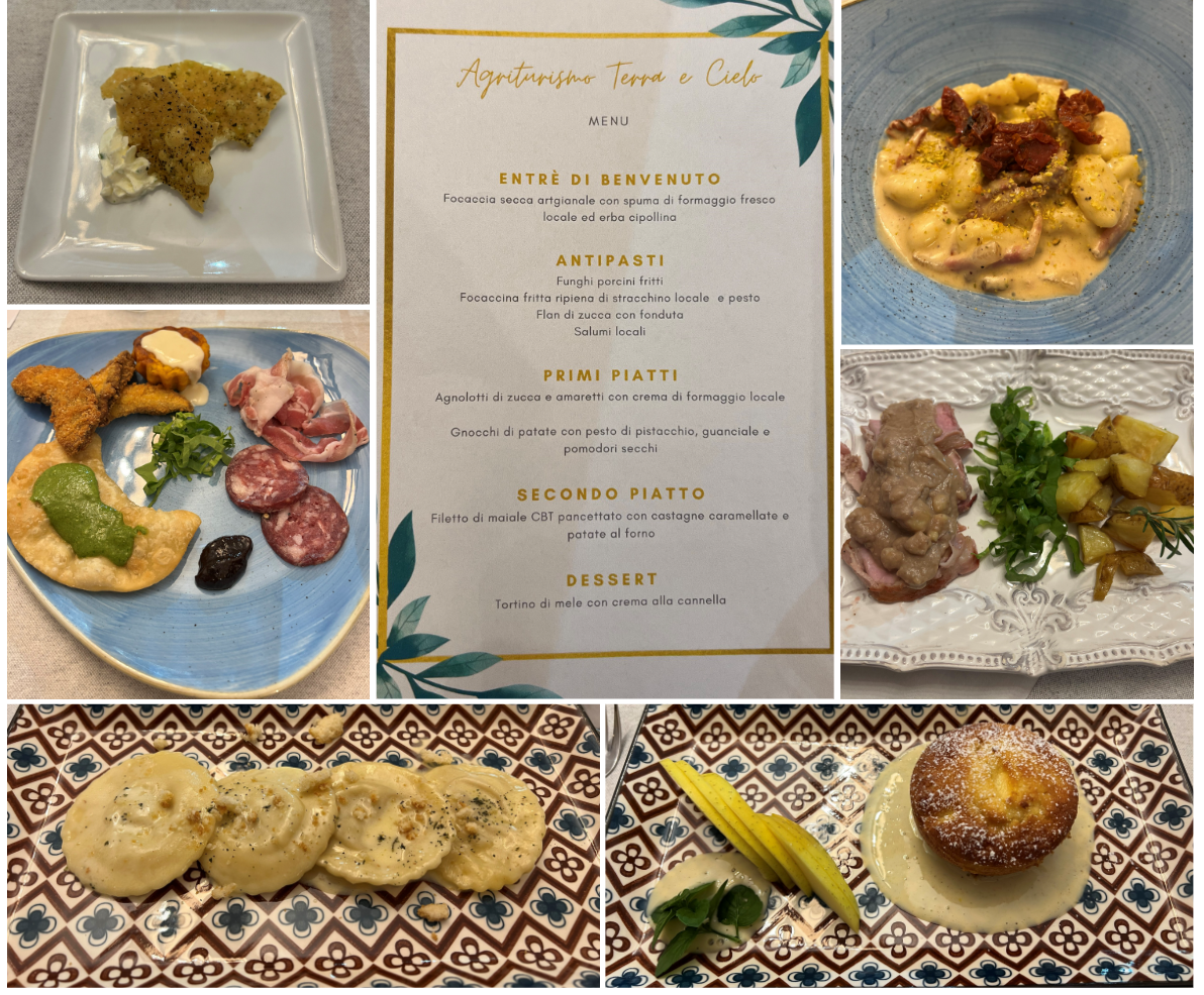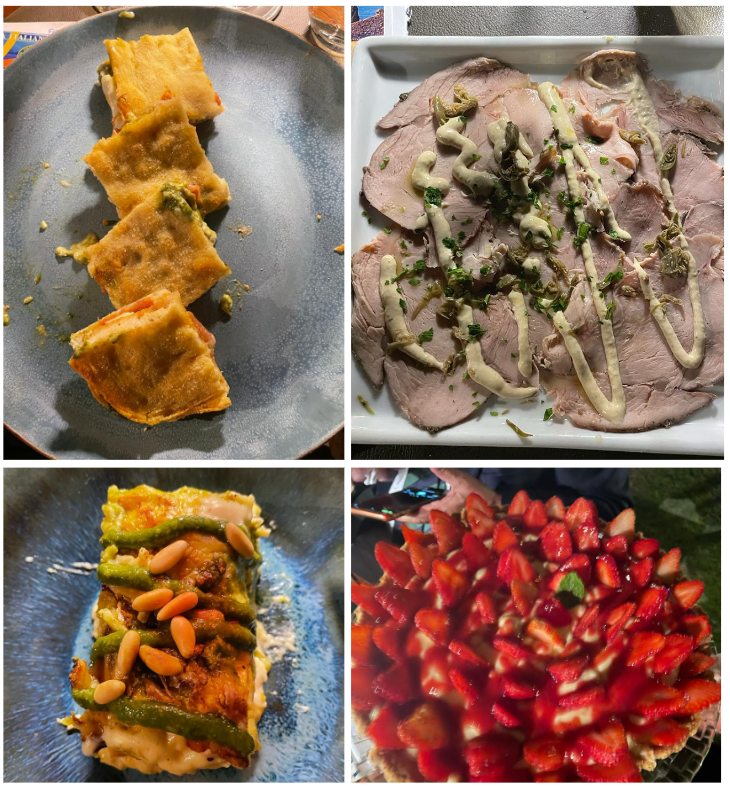 L’agriturismo Terra e Cielo è situato sulle alture genovesi a 20 Km dal centro di Genova. Si trova nella natura ma soprattutto la ama e la rispetta. Qui viene proposta una cucina basata sulla collaborazione tra due generazioni: un connubio perfetto tra tradizione e innovazione dato dall’esperienza apportata dalle nonne unita alla tanta voglia di fare dei giovani presenti. Nei piatti, prodotti coltivati nei loro orti e frutteti e provenienti dai loro animali (uova, carni). Durante la conviviale ecumenica gli Accademici Valentina Caratto e Alfredo Guazzone di Passalacqua hanno relazionato sull'argomento annuale "La Tavola del Contadino, Il campo, il cortile, la stalla nella cucina della tradizione regionale” (foto 1 e 2). Le portate (foto 3), assolutamente pertinenti, sono state molto gradite dai commensali, come il servizio garbato e puntuale dei due giovani addetti alla sala. Foto 4. Accademici.