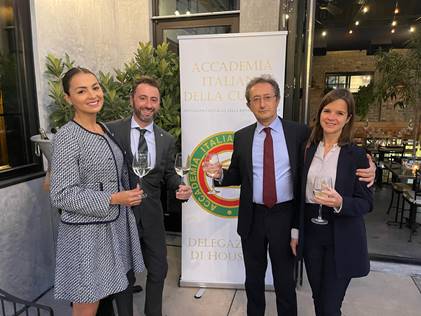 Cena Ecumenica al ristorante “Ostia” di Houston con ospite d'onore il Console Generale per il Texas, Oklahoma, Arkansas e Louisiana Mauro Lorenzini. Serata accademica in cui il tema dell'anno "La tavola del contadino" è stato interpretato all'insegna della sostenibilità, convivialità ed innovazione per potersi connettere ed integrare con l'imminente Settimana della Cucina Italiana nel Mondo. Prodotti sostenibili del campo e della stalla sono stati serviti "Family Style" per accentuare la convivialità tra gli Accademici ed enfatizzare il senso intrinseco della tavola contadina. Molto apprezzato l'intervento del Console Generale che ha sottolineato l'importanza dell’attività di divulgazione culturale dell'Accademia Italiana della Cucina all'estero,