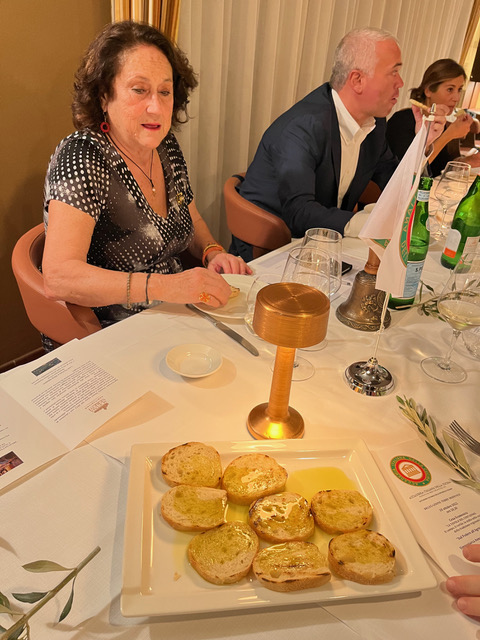 Simposiarca dell’annuale convivio sul tema “La Tavola del contadino” è stata Anna Maria Costanzini che ben conosce l’Agriturismo e Acetaia Sereni di Marano sul Panaro. Visitandolo, conoscendone i prodotti (le paste e i dolci sono fatti in casa, le verdure e le erbe aromatiche provengono dagli orti distanti qualche metro dai tavoli, l’olio extravergine di oliva è autoprodotto nell’Azienda Agricola così come l’aceto balsamico di Modena proposto in tanti diversi invecchiamenti e fragranze) è nato spontaneo un sottotitolo che in due parole indica un ideale e impegnativo percorso da conoscere e sottolineare “Dal podere all’agriturismo”. L’Accademico Luca Pizzirani (1) ha relazionato su usi e costumi storici della coltivazione dell’olivo nelle colline di Campiglio. Una degustazione su bruschetta calda con olio appena franto (foto 2) guidata dai proprietari Sereni, ha introdotto all’assaggio di piatti tradizionali riproposti in attualità con il piacere di tutti (foto 3). A conclusione della gradevole serata è stato distribuito agli Accademici il tradizionale e apprezzatissimo libro sull’argomento dell’anno e la Delegata Rosalba Caffo Dallari ha consegnato il meritato guidoncino e la rivista al titolare e agli chef dell’agriturismo (foto 4).
