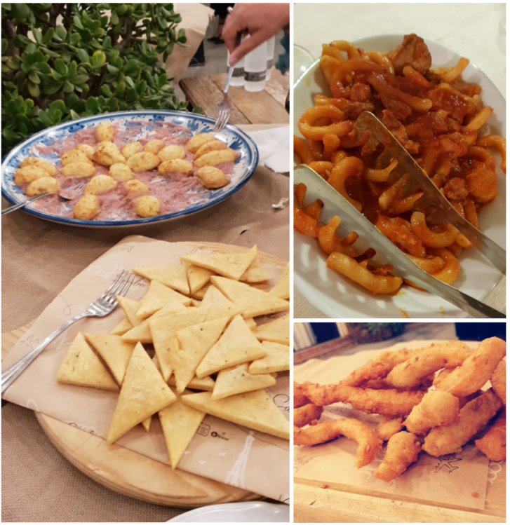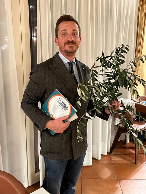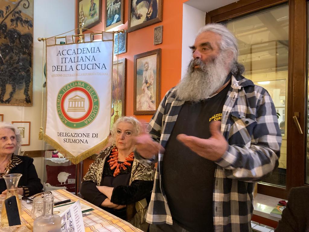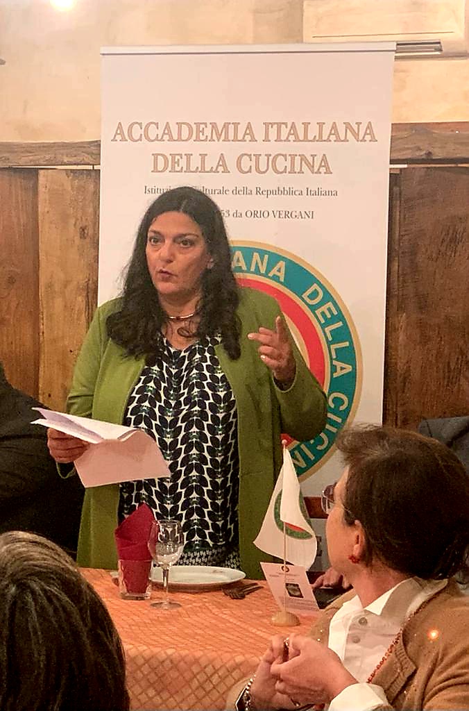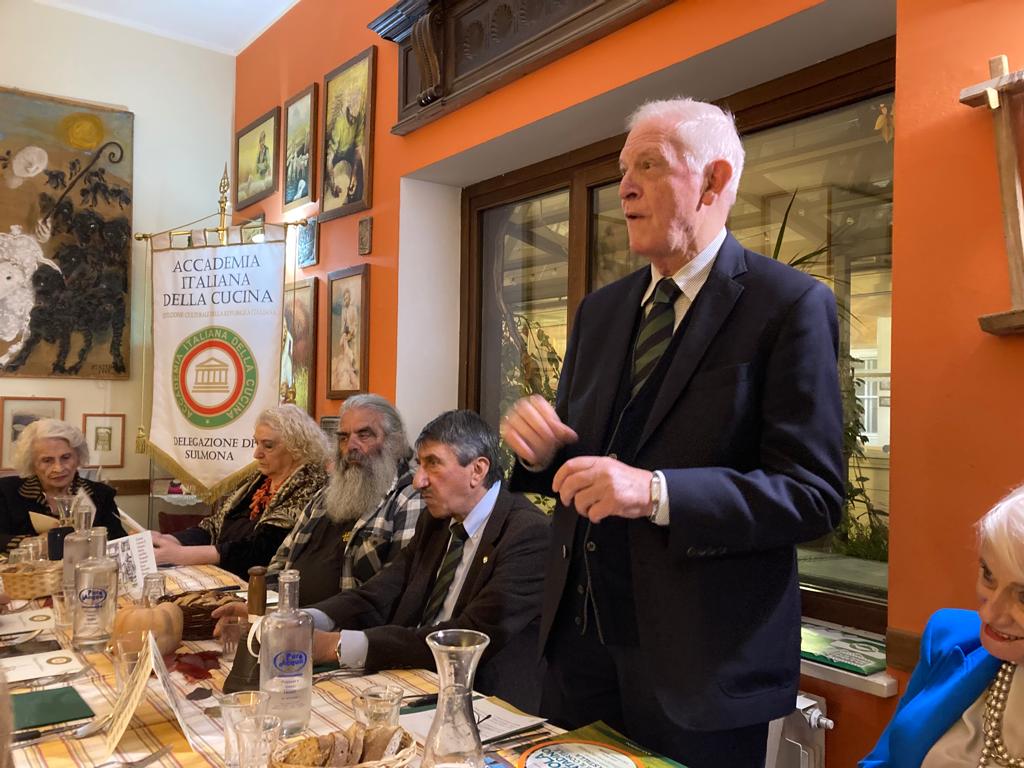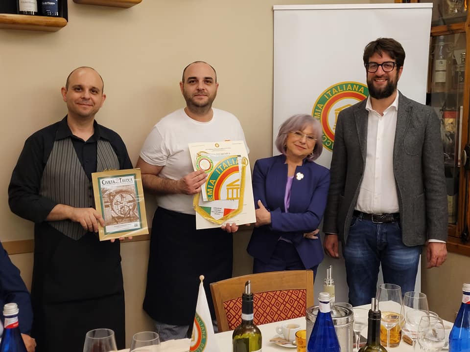 Conviviale Ecumenica presso il ristorante Locanda Novecento di Rieti. La Simposiarca Valeria Lettera (foto 1), che ha anche contribuito alla redazione del volume “La tavola del contadino”, ha brillantemente illustrato il tema della serata, svoltasi alla presenza di numerosi Accademici, autorità locali e importanti ospiti (foto 2). Molto apprezzato il menu, sapientemente preparato dalla cuoca Sabrina Paleotti, mentre la sala è stata gestita dalla sorella Simona. La scelta del locale non è stata affatto casuale: la cucina della Locanda Novecento riporta alla mente le nonne di una volta che gestivano la cucina di casa, trasformando le ricchezze della terra in cibi gustosi. Da non dimenticare, le tante contaminazioni culinarie evidenti nel reatino derivate dagli scambi tra gli abitanti delle pianure e colline e quelli dei monti che, anticamente, ricorrevano spesso al baratto. Tipico era lo scambio tra olio e patate o legumi, per i quali addirittura ogni anno capitava fossero localmente fissati i rapporti di cambio. È stato volutamente inserito nel menu un risotto, cucinato con una erba spontanea, la pastinaca, a ricordare che molta della popolazione reatina è originaria del Veneto, da dove si è trasferita ad inizio novecento quando fu aperta la SNIA Viscosa. Sabrina ha voluto regalare agli Accademici e agli ospiti due pizze tipiche delle case contadine di una volta, la pizza somma e la pizza ’nfrasca, entrambe molto gradite. In foto 3. Il Delegato Francesco Maria Palomba.
