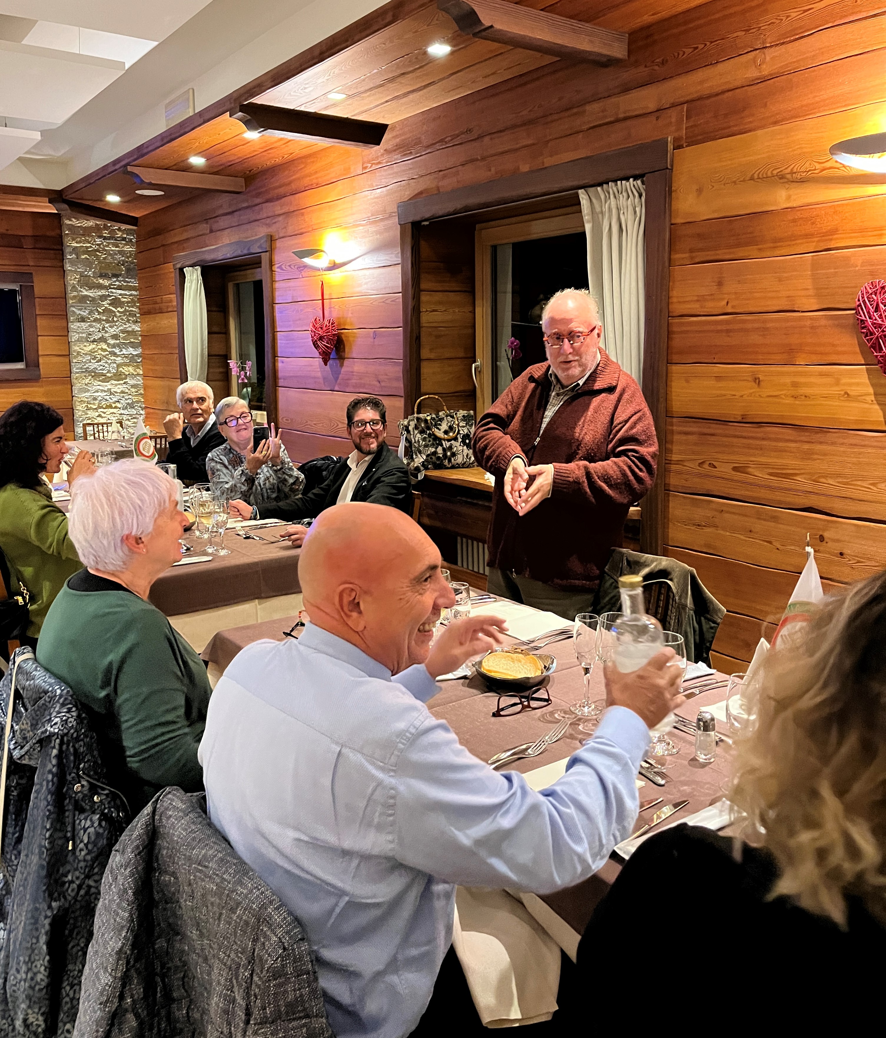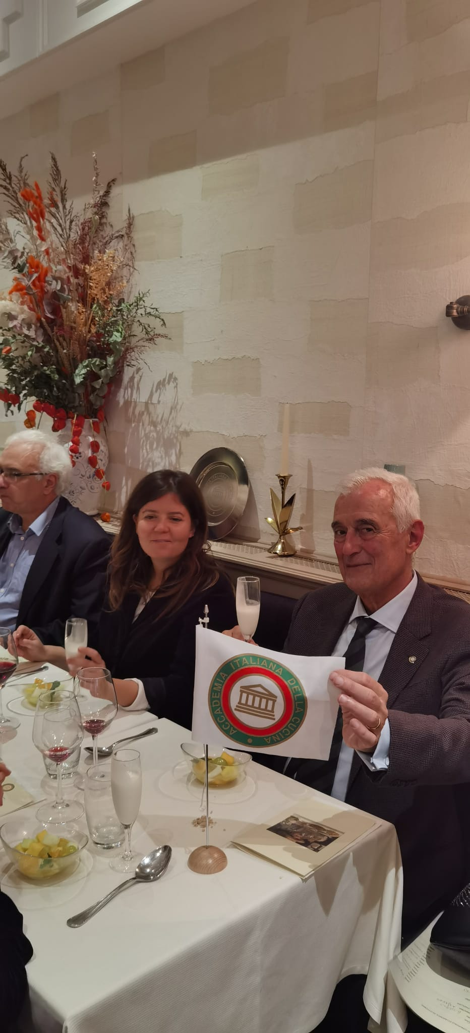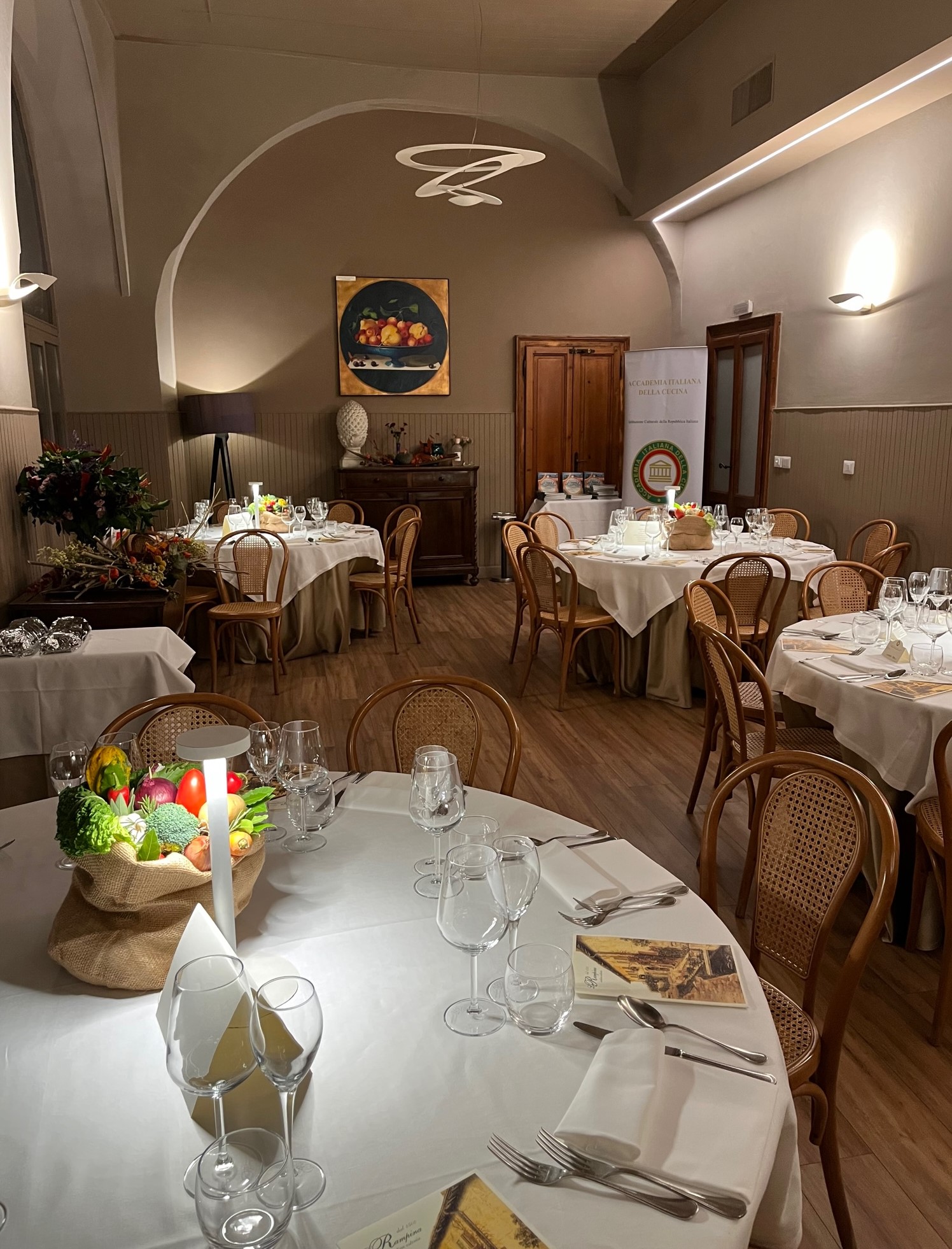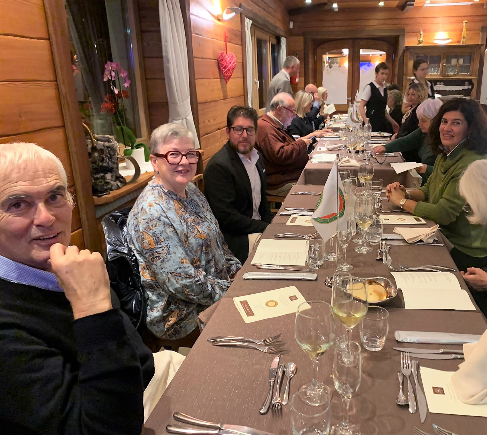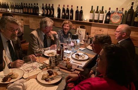 Sotto la guida del Simposiarca Rob Cozzi, la cena ecumenica 2022 è stata celebrata presso un ristorante visitato per la prima volta dagli Accademici di Utrecht. Angelo Sciacchitano, patron e chef del ristorante Retrogusto, seguito dal suo staff, ha confermato con la sua bravura la scelta giusta del locale per questo importante evento. Lo chef, di origine siciliana, è riuscito a portare ad alto livello piatti essenzialmente semplici con un servizio veramente impeccabile. Eccellente lo stuzzichino di caponata siciliana con, a seguire, una polenta ben arrostita con salsiccia siciliana ineccepibile. Come primo è stato servito un delizioso risotto alla zucca servito perfettamente al dente. Il secondo ha anche ottenuto dei grandi consensi: guance di maiale ai funghi porcini accompagnate da un indimenticabile purè di patate. A chiusura, una torta caprese fatta in casa così come anche la focaccia perfetta ad inizio pasto. Gli ottimi vini serviti in perfetto abbinamento al menu servito.