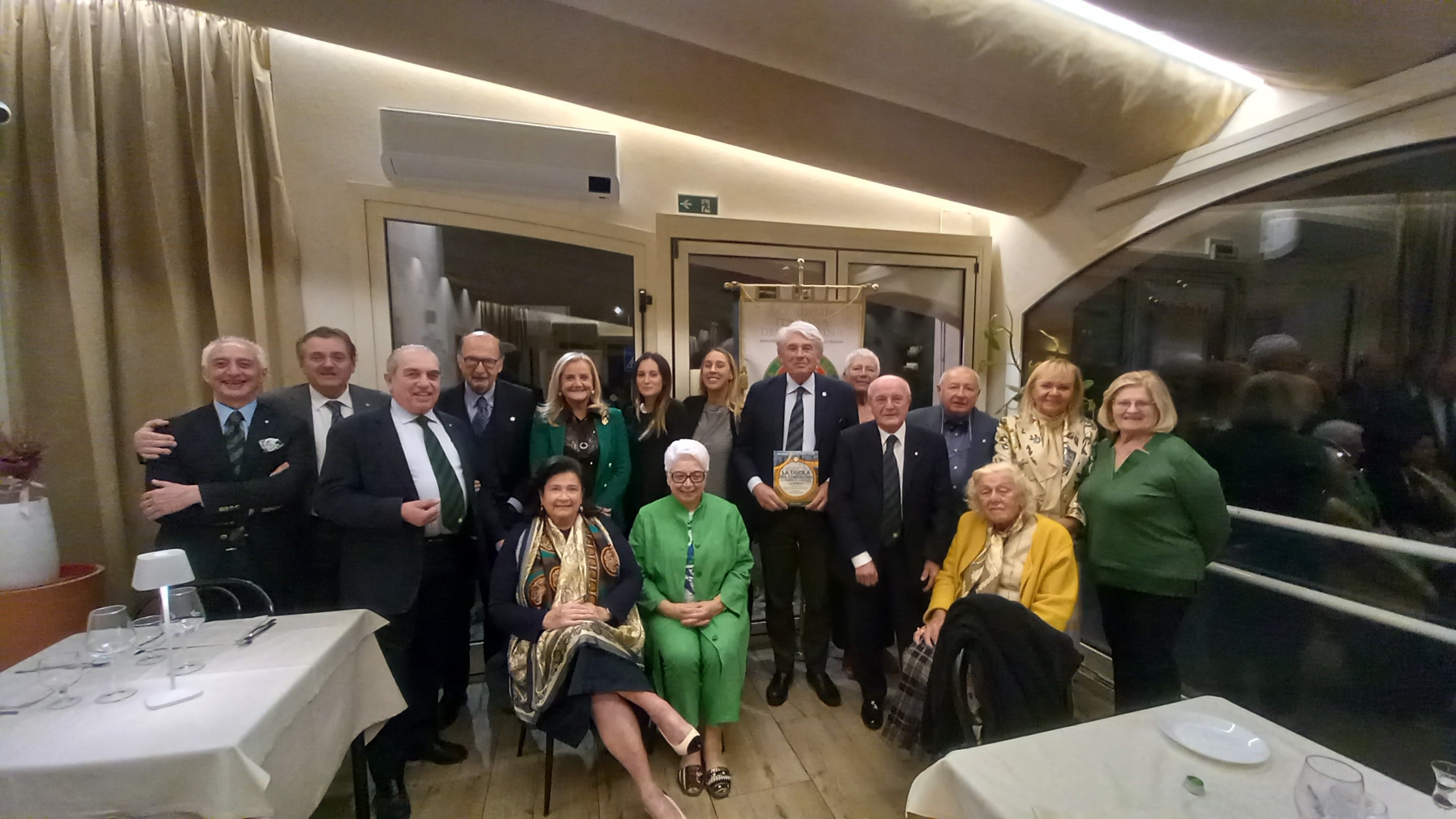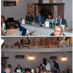 Nel verde della campagna polesana da 53 anni si trova la trattoria “alla Rosa” gestita dalla famiglia Rigoni e il locale si è rivelato la scelta giusta per sviluppare al meglio il tema della cena ecumenica. Il menu, scelto dal Simposiarca Giovanni Battista Scarpari su proposta della signora Maria Romana Rigoni ed arricchito dall’ interessantissima relazione del prof. Paolo Rigoni, è stato molto apprezzato fin dall’inizio con la riproposta di un piatto dimenticato, la “formaiella con cipolla”, che costituiva la cena del contadino accompagnata dai “coari” con i formaggi, dei piccoli pani fritti che ne costituivano la merenda. Poi sono seguiti i cappellacci con verze e pancetta, la faraona coi funghi e l’anitra arrosto. Varie verdure, sempre presenti nelle tavole di campagna, hanno accompagnato le carni e quindi la cena si è chiusa con alcuni dolci di stagione come la “fugassa”, la “pinsa de patate mericane” e i classici “sugoli” preparati con il mosto di uva fragola. Nel suo commento finale il Delegato Golfetti ha elogiato la fedeltà alla tradizione e l’impegno con cui è stato affrontato l’argomento della cena, per cui meritatissimi applausi hanno accompagnato la consegna del libro sul tema dell’anno al relatore Rigoni e quella del piatto dell’Accademia alla signora Maria Romana.