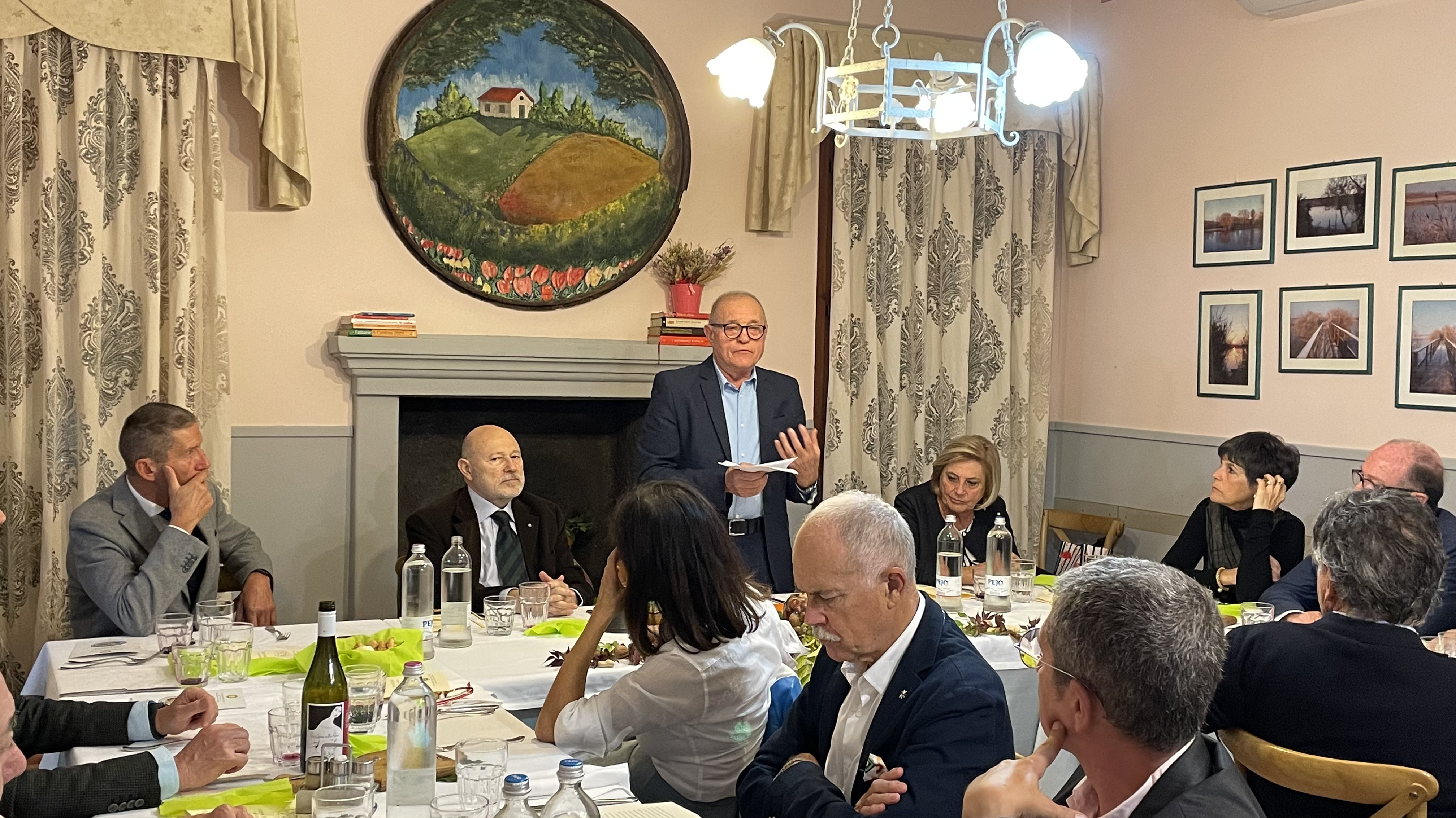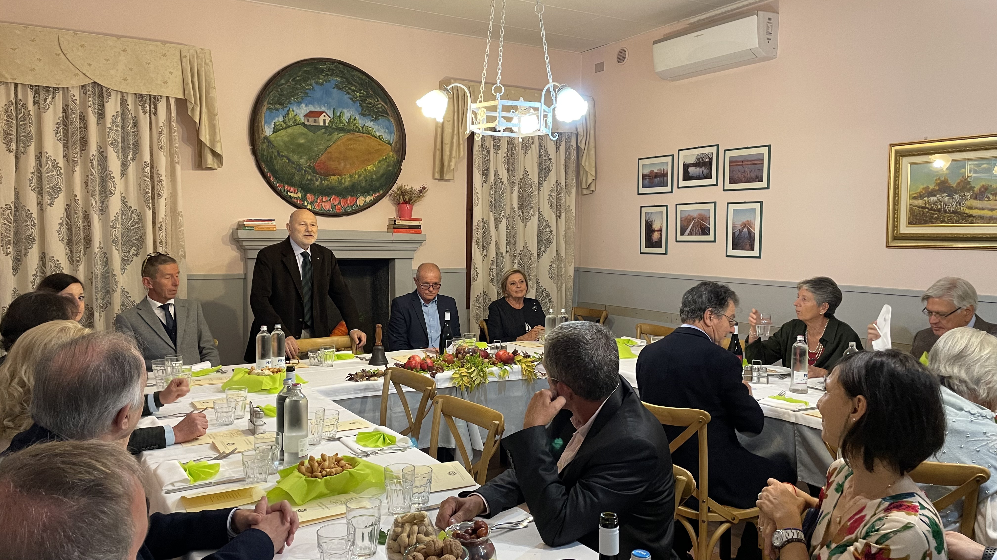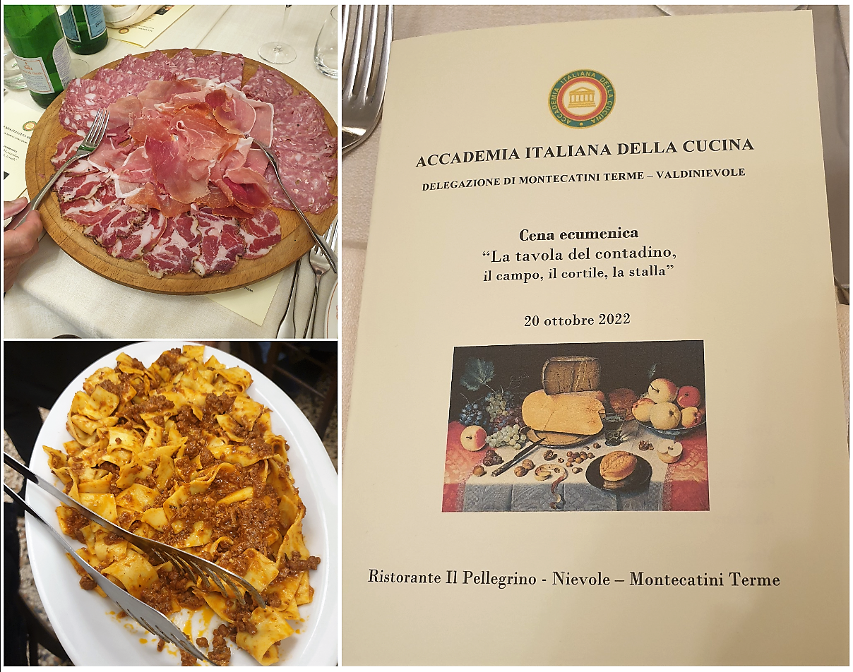 Convincente risultato dell’Ecumenica 2022, per la quale la Delegazione è tornata dopo molti anni al ristorante "Il Pellegrino" notandone un sensibile miglioramento. Il menu, definito nel rispetto del tema proposto e della tradizione locale, ha riscosso generale soddisfazione. Buone, ricche e apprezzate tutte le portate, con un particolare elogio per l’ottimo primo; gradito il vino a tutto pasto proposto. Un cenno di merito al servizio, semplice, ma curato e professionale. Distribuito il volume dell’Accademia, il Delegato Giovannini ha ricordato la varietà dell’alimentazione popolare del territorio: castagne sulla montagna, pesce nella zona umida (il Padule), soffermandosi su quella dei contadini (di solito mezzadri), legata al “sistema chiuso” del podere (autoproduzione e autoconsumo), regime alimentare “frugale e salutevole” secondo P. Artusi, ma l’inchiesta Jacini ne dà un quadro meno idillico. Un mondo basato sul pane, nei suoi variati usi (minestre, zuppe, fettunta); tutto il resto, “companatico” appunto, assai modesto, con l’eccezione del maiale: rito, festa e quasi unico apporto proteico. Dopo la chiacchierata, il Delegato ha ringraziato ristoratori e Accademici, dando appuntamento alle prossime conviviali in preparazione.