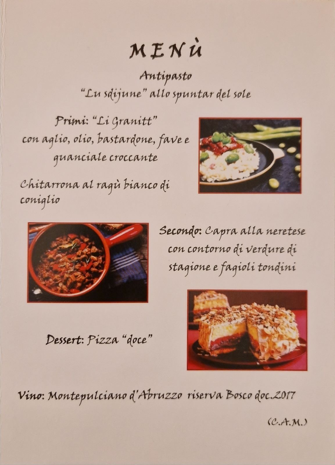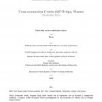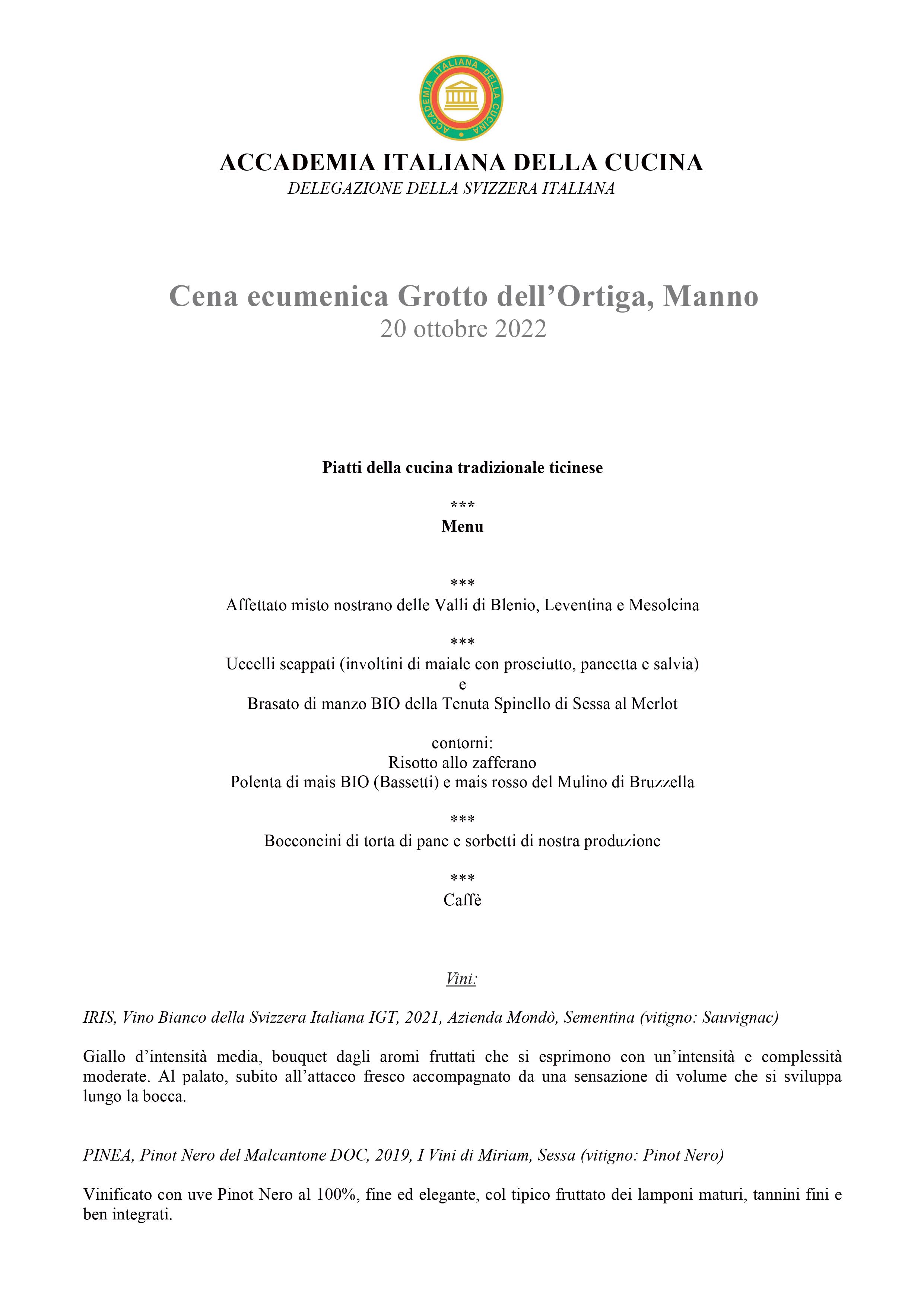 Il Grotto dell’Ortiga della famiglia Mazzoleni a Manno ha accolto la Delegazione per la cena ecumenica 2022. Il menu è stato studiato dalla Consulta con il Simposiarca Davide Barca, prestando particolare attenzione ai prodotti di prima qualità del territorio. Ospite della serata il Dr. Ing. Agr. ETH Sem Genini, Responsabile dell’Unione Contadini Ticinesi (UCT) che ha parlato con grande competenza dei temi: L’agricoltura ticinese e il Centro di Competenze Agroalimentari Ticino. La serata ha riscosso un grande successo tra gli Accademici presenti. Foto 1. Da sinistra, Il Simposiarca Davide Barca, l’ospite Sem Genini e il Delegato Emilio Casati. Foto 2. Il menu. Foto 3. Uccelli scappati con Risotto allo zafferano. Foto 4. Brasato di manzo BIO della Tenuta Spinello di Sessa al Merlot con Polenta di mais BIO (Bassetti) e mais rosso del Mulino di Bruzzella.