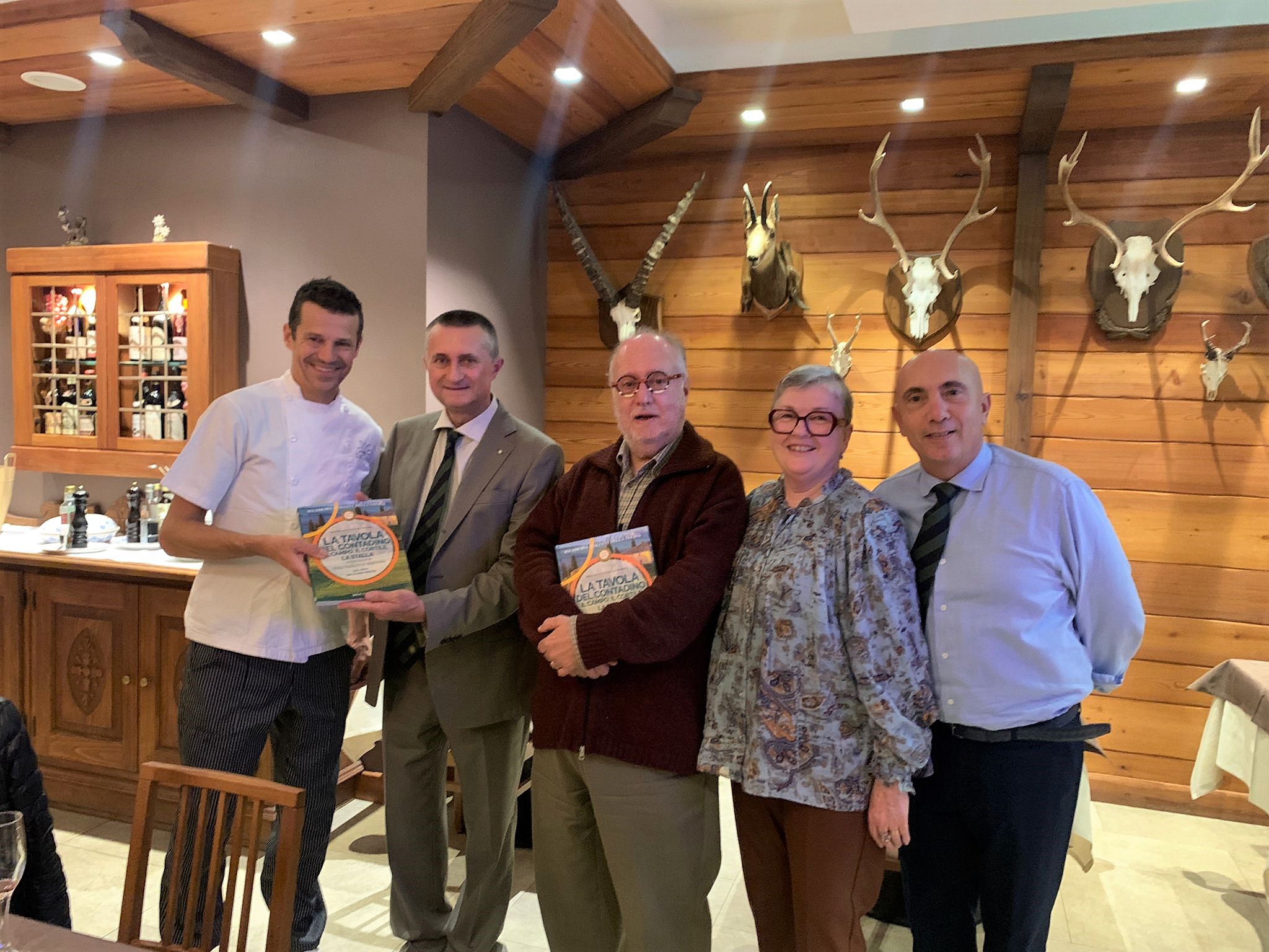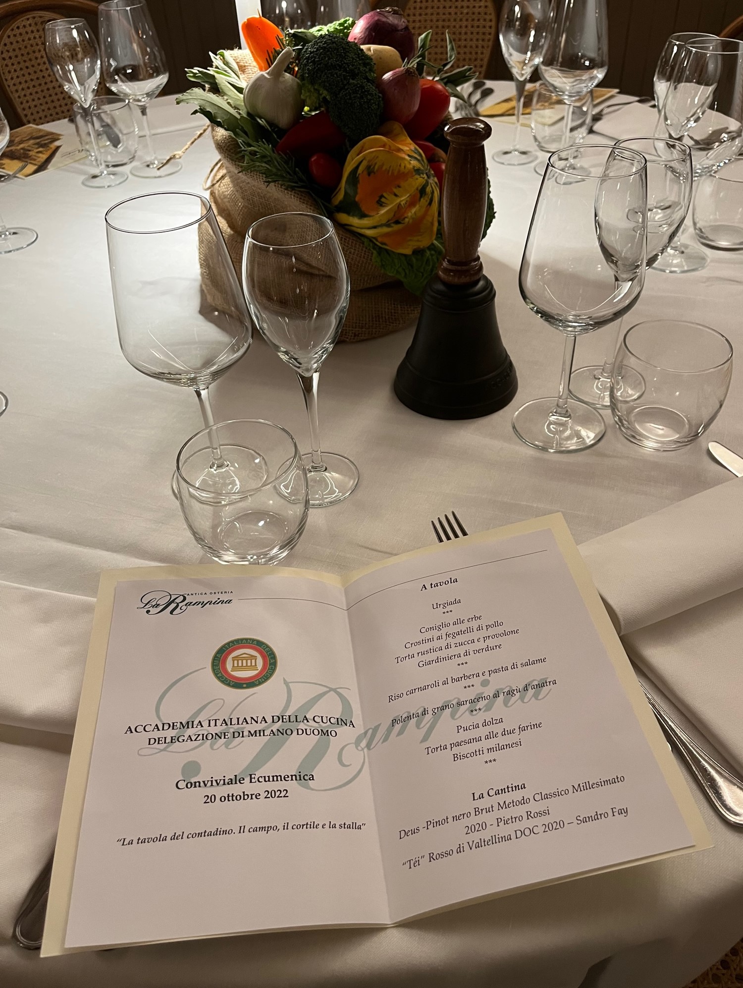 Per la Cena Ecumenica la Delegazione di Milano Duomo si è ritrovata, come è ormai tradizione, al ristorante “Antica Osteria La Rampina” di San Giuliano Milanese (Foto 1 e 2), accolti con la consueta cordialità e amicizia da Lino Gagliardi e dai figli Luca e Lorenzo. Prima di iniziare la cena, la Delegata Maria Luisa Mandelli, Simposiarca della serata con Anna Mattioli e Marisa Zipoli, ha presentato il nuovo Accademico Matteo Tanteri proveniente dalla Delegazione di Pechino (in foto 3 con la Delegata) e ha introdotto la serata con un intervento sul volume dedicato alla “Tavola del contadino”. Il menu ha interpretato in maniera perfetta il tema della serata: è iniziato con l’urgiada (minestra d’orzo alla milanese), seguita da una serie di antipasti (coniglio alle erbe, torta rustica di zucca e provolone e una squisita giardiniera di verdure preparata dallo chef con le verdure del suo orto), cui sono seguiti un ottimo risotto al barbera e pasta di salame e una polenta di grano saraceno al ragù d’anatra; per chiudere la tradizionale pucia dolza (crema di mascarpone). A fine serata, il consueto saluto e applauso a Lino ed ai suoi figli e la consegna del piatto commemorativo del tema ecumenico 2022 (in foto 4 le Simposiarche con il titolare e cuoco).