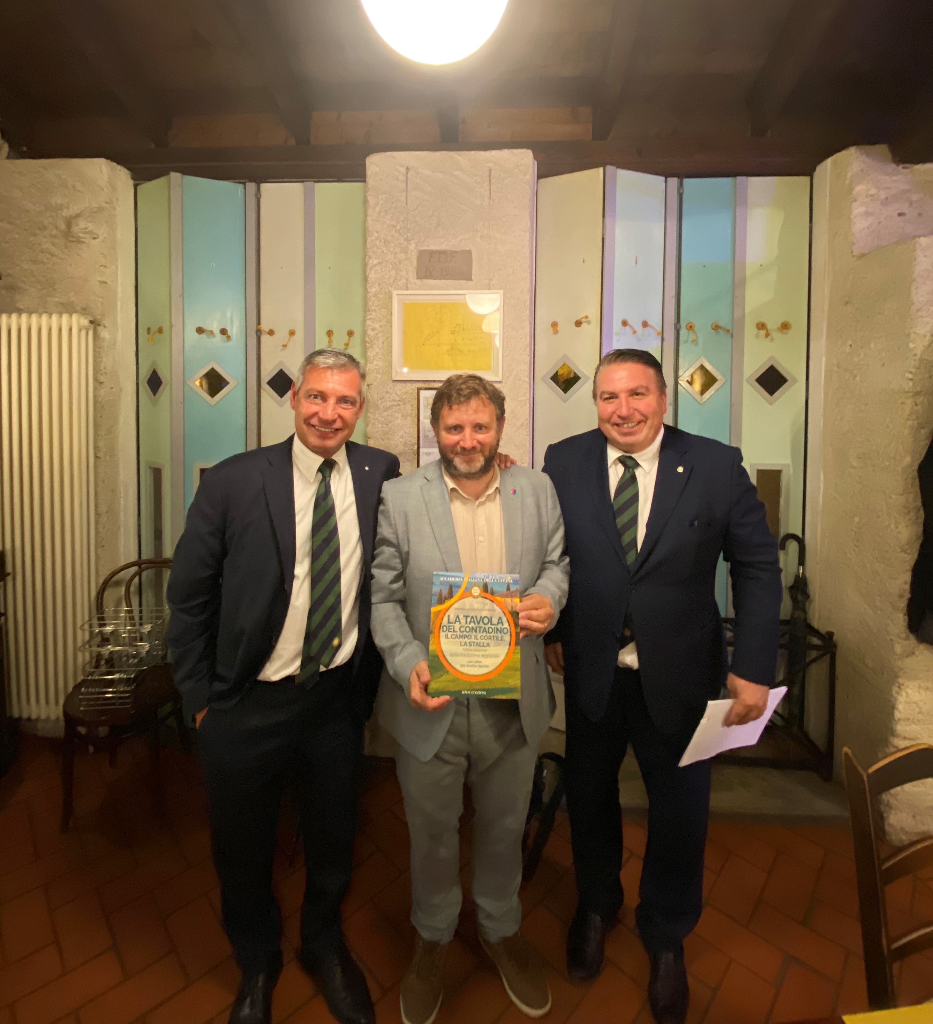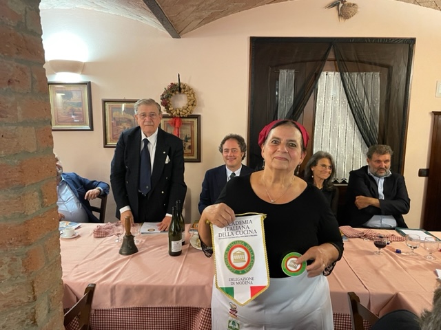 La Delegazione di Modena si è trovata presso l’agriturismo La Volta delle Rondini a Formigine (Modena) per la Cena ecumenica 2022. Dopo i saluti iniziali del Delegato Mario Baraldi (foto 1), il Segretario Marco Righi ha distribuito a tutti gli Accademici presenti il volume sul tema dell’anno” La Tavola del contadino - Il campo, il cortile, la stalla nella cucina della tradizione regionale”. Il Delegato ha poi passato la parola all’Accademico Augusto Ascari, membro del Centro Studi Territoriale Emilia, per una breve presentazione della pubblicazione. A fine serata il Delegato Baraldi ha fatto dono di una copia del volume alla signora Anna e al signor Mirko e ha consegnato la meritata vetrofania dell'Accademia (foto 2).