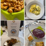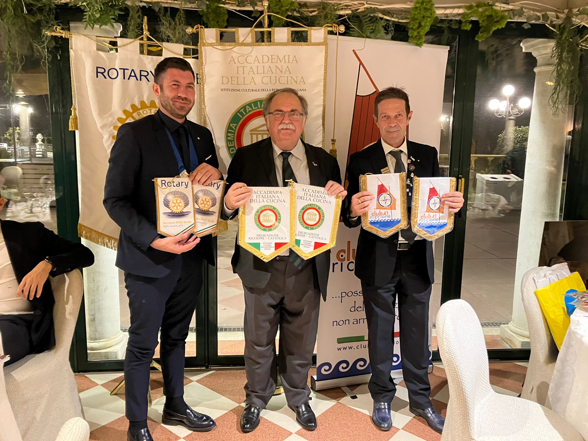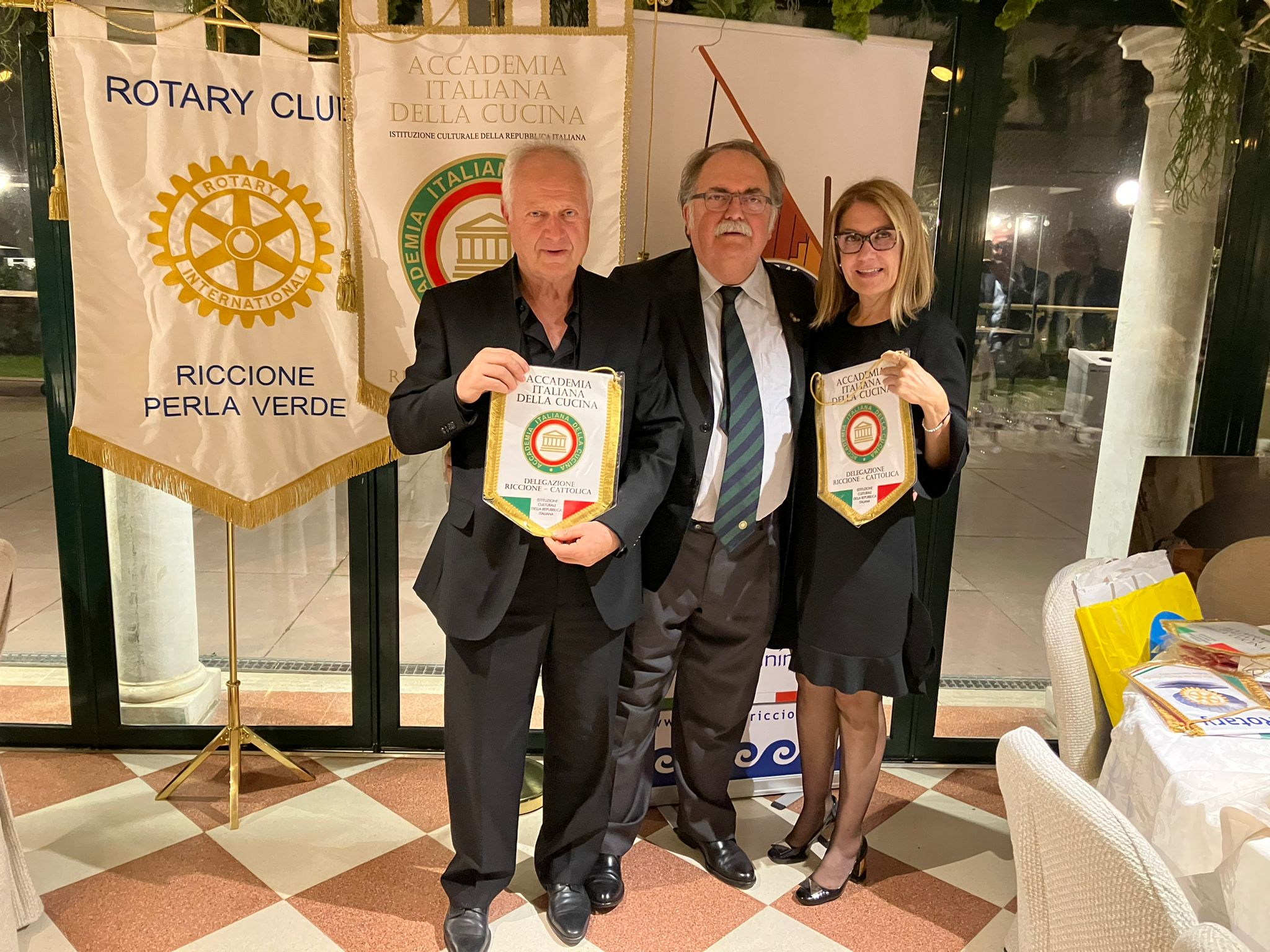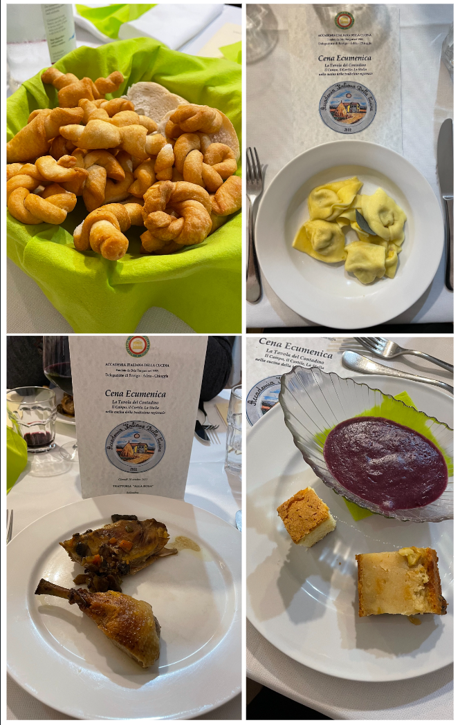 La Delegazione di Riccione-Cattolica ha condiviso la Cena Ecumenica 2022 con il Rotary Club Riccione Perla Verde e il Club 41 n° 26 di Riccione presso il ristorante “Il Mulino” di Misano Adriatico (foto 1 il Delegato Fabio Giavolucci con i presidenti delle due Associazioni). Oltre 90 persone, in un clima di allegria e festa, hanno partecipato alla cena (foto 2). Obiettivo della serata pienamente raggiunto: divulgare la conoscenza dell’Accademia, lo spirito e le finalità della Cena Ecumenica, proporre un menu interpretativo della cultura della civiltà contadina romagnola che si è trasferita dalle campagne alla costa adriatica negli anni 50 e 60 del 900. La serata si è aperta con una pièce teatrale “Volti e Voci della mia Gente” di e con Orietta Zamagni e Giancarlo Frisoni (foto 3) che ha raccontato e rappresentato le storie e le immagini delle persone dell’entroterra negli anni dal 40 ad oggi. Il menu è stato preparato dallo chef Pier Giorgio Parini e ha soddisfatto tutti gli intervenuti (foto 4, le portate). Sempre efficiente e professionale il servizio del ristorante per una serata molto intensa. Strepitosa e geniale la frittata con stridoli e cipollotti brasati e buonissimo il maialino in doppia cottura. Buonissima la zuppa inglese tradizionale.