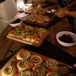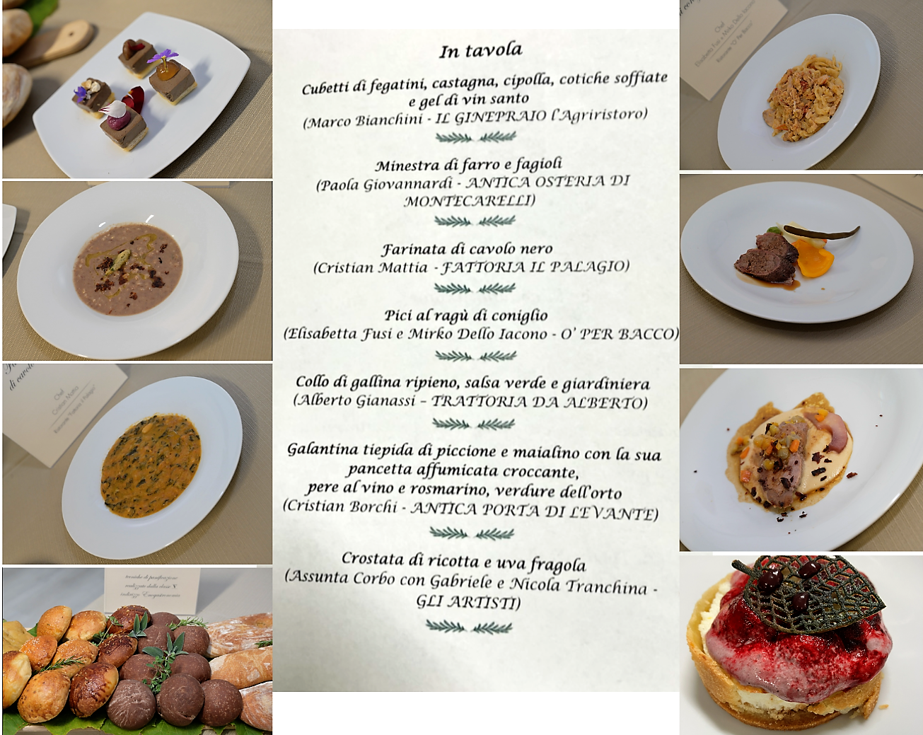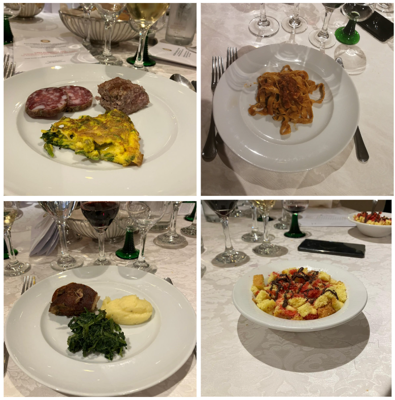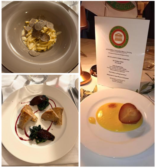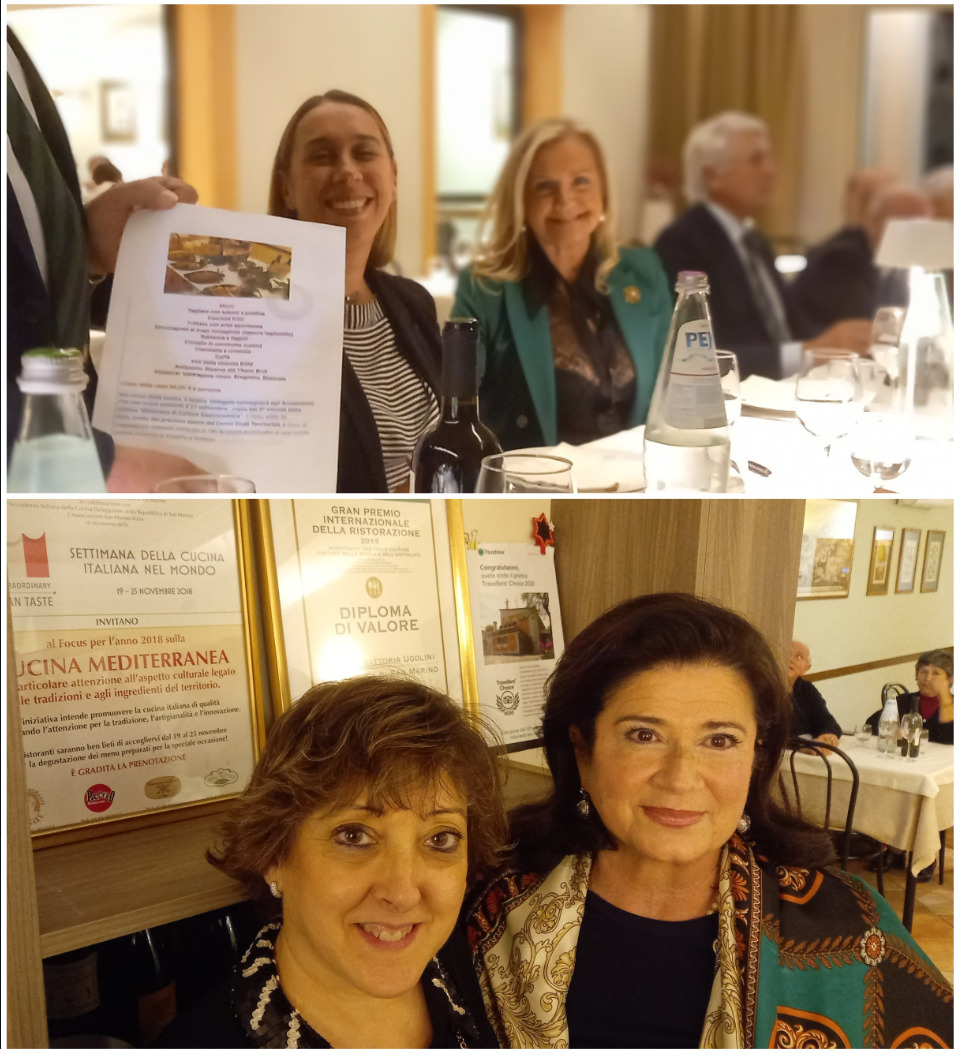 Il Delegato di San Marino Andrea Negri e i Simposiarchi Stefano Piva e Cesare Tabarrini, con Maria Quadrelli titolare dell'Antica Trattoria Ugolini - già nota per i suoi menu legati alla tradizione - hanno saputo ben interpretare il tema della cena ecumenica, molto apprezzata dagli Accademici presenti. La serata, come sempre trascorsa in un clima di sincera amicizia, è stata caratterizzata dal rinnovarsi dei ricordi, delle memorie di un passato che la cucina contadina, nata povera, nella sua semplicità ha saputo inventarsi con ingegno e tanta fantasia così come testimoniano le ricette pubblicate nell'ultimo volume della Biblioteca di cultura gastronomica. Foto 1. Consulta della Delegazione con Accademica Ilaria Cecere. Foto 2. In alto, Accademiche Maria Teresa Muscioni e Biancamaria Toccagni; in basso, Maria Quadrelli dell'Antica Trattoria Ugolini con Segretario Elisabetta Righi Iwanejko. Foto 3. Delegato Negri e Accademici. Foto 4. I piatti serviti.