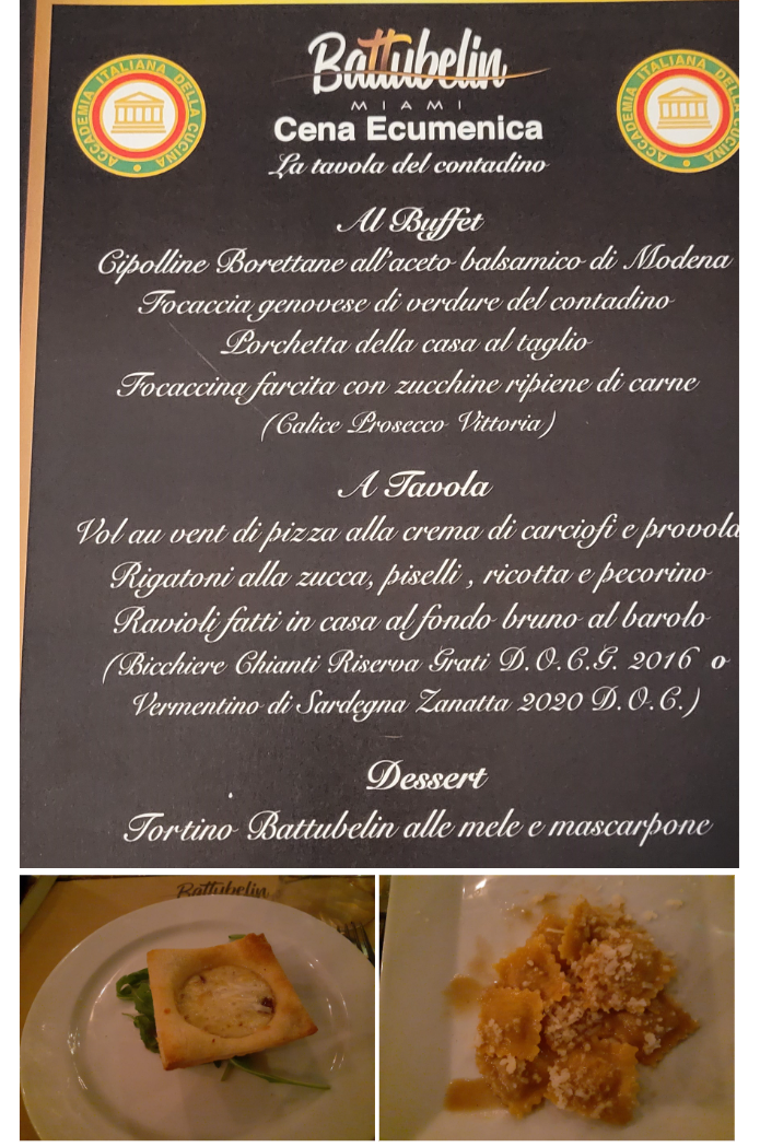 La Delegazione di Miami ha celebrato la cena ecumenica presso il ristorante Battubelin di Miami, situato nel Business District. Il locale gode di un ampio patio coperto circondato da vegetazione tropicale, ideale per godersi il clima mite dell'inverno a Miami. Il ristorante si ispira prevalentemente alla cucina ligure e offre un'ampia scelta di pizze e pinse. La cena dedicata alla tavola del contadino è stata molto apprezzata dagli ospiti; molto gradito il ricco buffet di antipasti e i ravioli al brasato, specialità della casa.