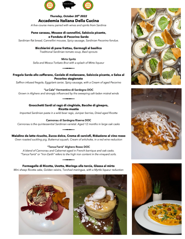 La scelta del locale per la cena ecumenica della Delegazione di New York è ricaduta su un ristorante a Brooklyn gestito dallo chef sardo Raffaele Solinas e focalizzato sulla cucina sarda, quindi particolarmente adatto al tema accademico dell’anno: "La Tavola del Contadino: il campo, il cortile, la stalla." Giustamente Brooklyn, una “contea” di New York che si riallaccia alle radici del nome “contadino”, in un locale dall’atmosfera giusta che ha ospitato l’evento nel “cortile” del ristorante, con tavola unica e comunale. L’Accademico Eugenio Perrier, anche lui sardo, ha relazionato sulle influenze storiche dell'isola con multiple occupazioni straniere, sulle origini gastronomiche della regione determinata più dall' entroterra che dal mare. Ogni piatto è stato accompagnato da un vino tipico sardo. Il Console Generale di New York Fabrizio Di Michele e signora hanno apprezzato molto la serata per l’ambiente altamente culturale e conviviale nel suo contesto tematico. Foto 1. Accademico Eugenio Perrier, chef Raffele Solinas, Console Generale Di Michele, Delegata Roberta Marini de Plano, Simposiarca Lucy Falcone. Foto 2. Momenti conviviali nel cortile. Foto 3. Roberta Marini de Plano con Kristen Baldeschi, sotto a destra Livia Baldeschi e a sinistra Cristiana Baldeschi. Foto 4. Menu e piatti.