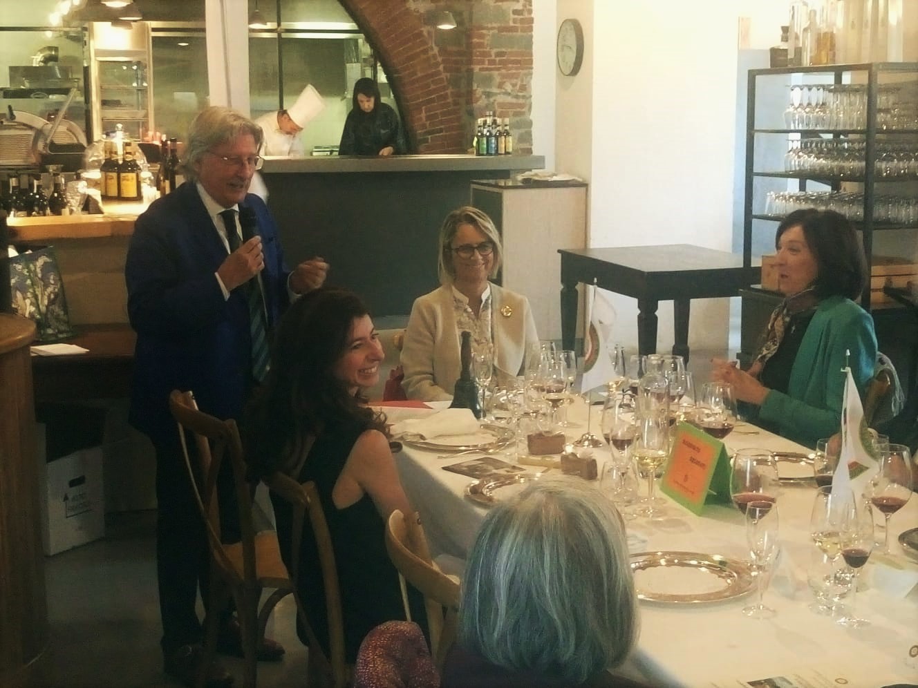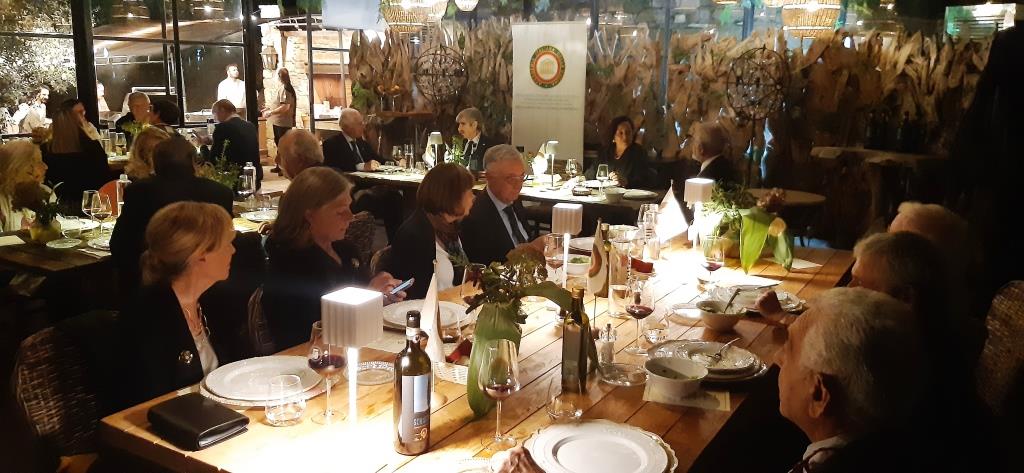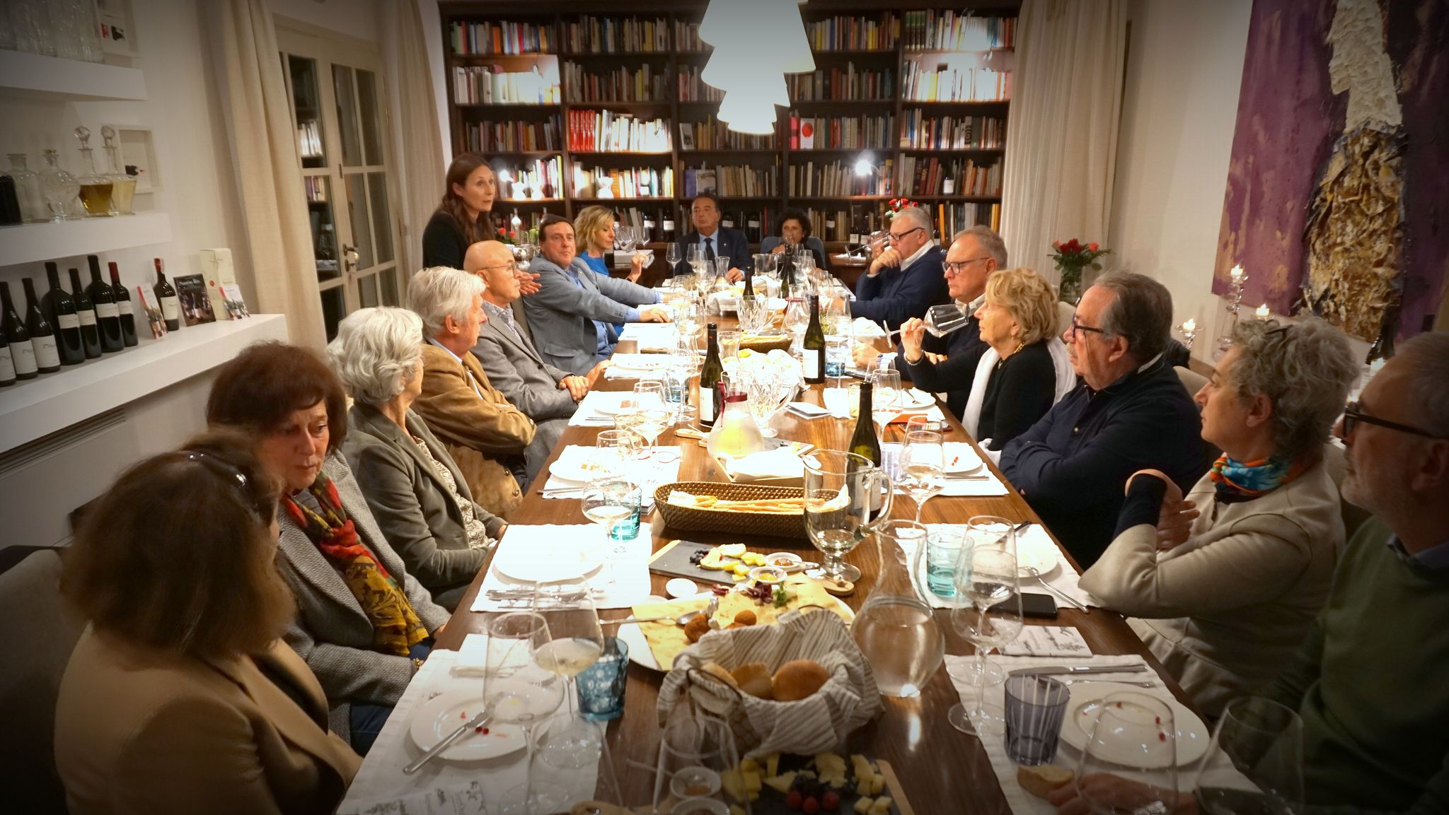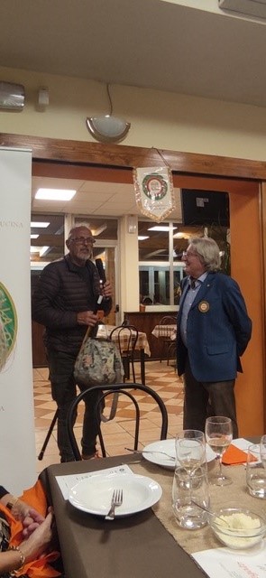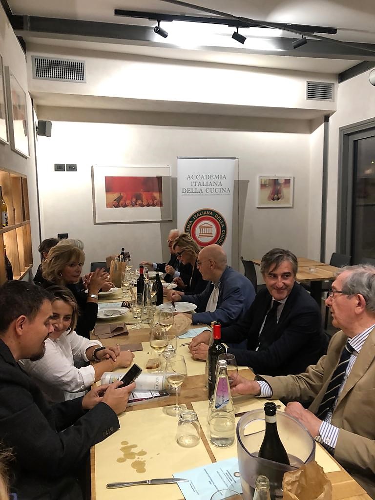 Convivio ecumenico presso l’Agriturismo Terre di Baccio in Greve in Chianti, nella suggestiva “Orangerie” dove, insieme agli Accademici del Valdarno Fiorentino, hanno preso posto ai tavoli anche la titolare Lara Gasperini con alcuni suoi ospiti che, durante la serata, hanno ricordato simpatici momenti di vita della tradizione contadina del territorio. Tutto ciò ha contribuito ad una accoglienza della Delegazione molto calorosa e familiare. La serata è stata brillantemente curata dal Simposiarca Max Ferranti, che ha commentato con dovizia di particolari i piatti scelti. Dal collo ripieno servito con salsa verde ad una profumata minestra di pane con le verdure dell’orto cui è seguito il piatto forte, pollo alla cacciatora accompagnato da rape saltate. Per dessert, delicate frittelle di castagne con ricotta. Tutto il menu, cucinato in modo impeccabile dal cuoco Gentian Muca, coadiuvato per l’occasione dal cuoco Stefano Bertini dell’Oliostreia “La Terrazza” di Greve in Chianti, ha ottenuto una valutazione ottima. Al termine della serata il Delegato Sandro Fusari e il Simposiarca Max Ferranti hanno voluto ringraziare la titolare e gli chef con il piattino ricordo del decennale della Delegazione e con la pubblicazione sul tema dell'anno.