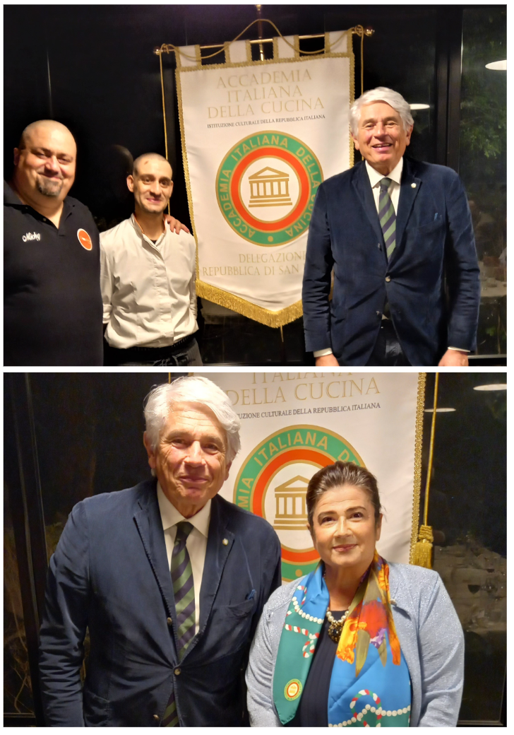 Una bellissima serata per la Delegazione al ristorante “Smaller” di Michele Monteleone, preceduta dalla riunione della Consulta della Delegazione, i cui membri hanno definito gli appuntamenti per l'anno in corso con particolare attenzione alla Cena Ecumenica, alla VII edizione della Settimana della Cucina Italiana nel Mondo e alla riunione conviviale per il Santo Natale. Simposiarchi della serata, Stefano Valentino Piva e Cesare Tabarrini. I piatti proposti dallo chef Andrea De Masi sono stati molto apprezzati per l’originalità degli abbinamenti e la freschezza degli ingredienti. Ancora una volta la buona cucina e la calda atmosfera hanno accolto i partecipanti in un incontro connotato da rinnovato entusiasmo e testimoniato da momenti di sincera emozione, quando il Delegato Andrea Negri ha consegnato, agli Accademici Piero Tonelli e Pier Luigi Ceccoli, l’attestato rispettivamente di trentacinque e di venticinque anni di appartenenza all’Accademia. Foto 1. La consegna degli attestati agli Accademici Tonelli e Ceccoli. Foto 2.Titolare Monteleone, chef De Masi, Delegato Negri; Delegato e Segretario Elisabetta Righi Iwanejko. Foto 3. Il Delegato illustra lo Statuto e il Regolamento aggiornati. Foto 4. Piatti.