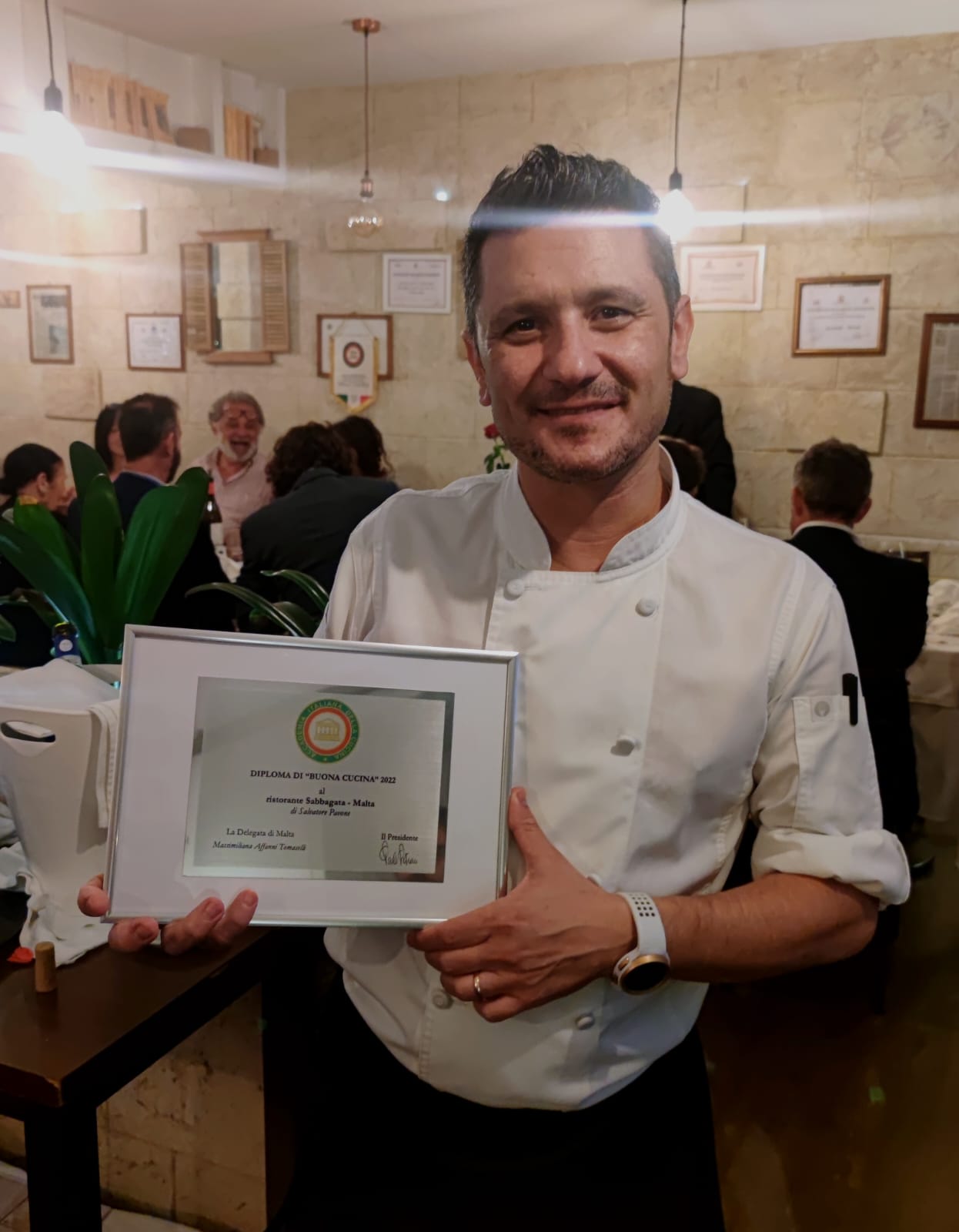 La Delegazione di Malta si è ritrovata al ristorante Sabbagata di St Julian’s per una riunione conviviale molto intensa in cui è avvenuta la consegna del Diploma di Buona Cucina” 2022. La Delegata Massimiliana Affanni Tomaselli ha consegnato l’importante riconoscimento allo chef siciliano Salvatore Pavone, lodandone la serietà, precisione, qualificata preparazione, definendo la cucina del Sabbagata buona, bella e salutare. Una serata emozionante per la consegna del premio e per il ritrovato clima di amicizia dopo tanti mesi di inattività. Protagonista della serata è stato il menu che lo chef ha proposto ai propri commensali.