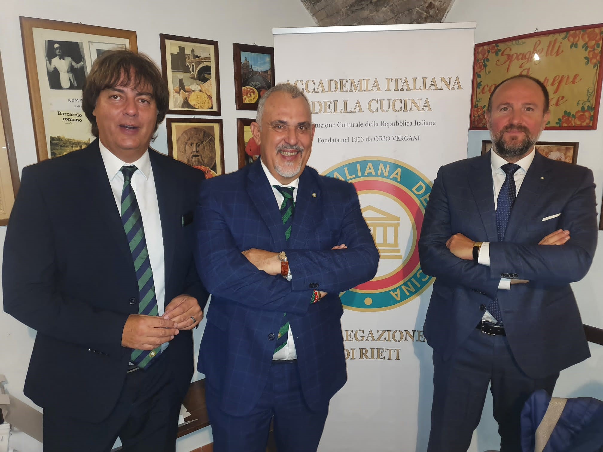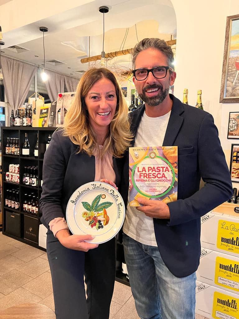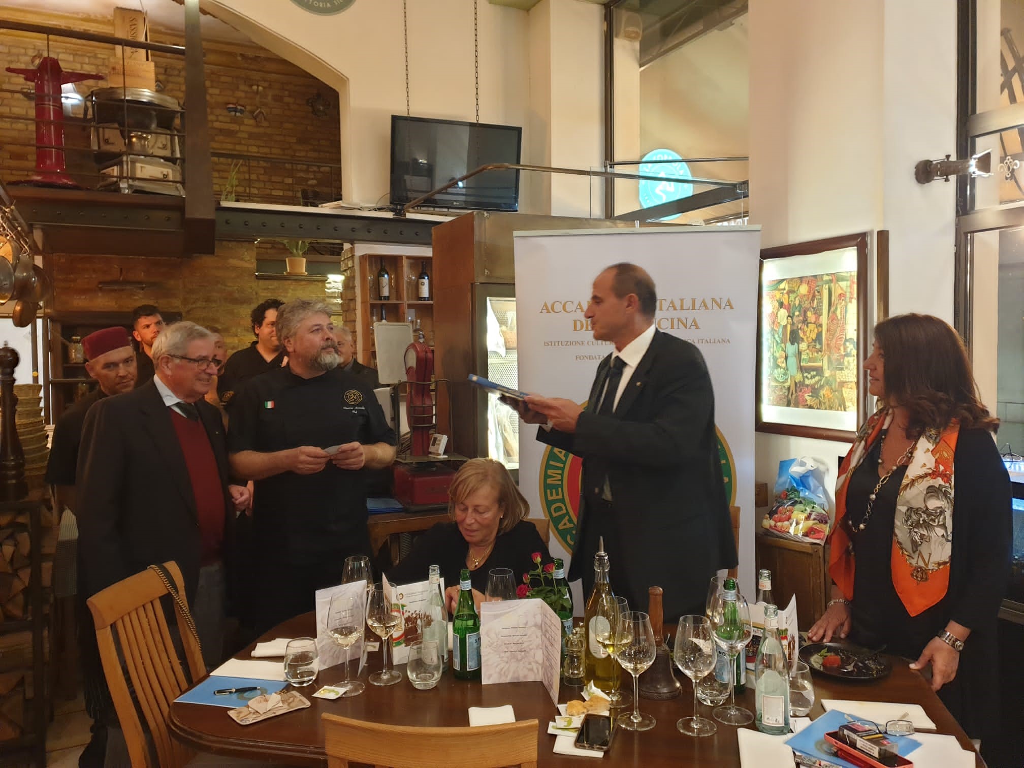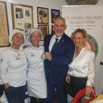 Riunione conviviale di settembre della Delegazione di Rieti presso “L’osteria delle tre sorelle Mancini”. Il ristorante, ormai storico reatino, ha iniziato l’attività nel 1995 con Sergio, padre delle attuali titolari Cristina, Francesca e Maria Sole, che si dividono tra cucina e sala con maestria, competenza e simpatia. Simposiarchi del convivio, Gianluca Di Blasio (foto 1) e il neo Accademico Giuseppe Morgante (foto 1 e 2). La serata è volta via allegramente, nel clima tipico dell’Osteria, allietata dalla lettura di poesie romanesche relative ai piatti degustati, da parte dell’Accademica Giovanna Palomba e dell’Accademico Roberto Giannursini. La Delegazione quasi al completo e i molti ospiti hanno potuto apprezzare un tipico menu romanesco, scelto dai Simposiarchi e dal Delegato. Coratella di abbacchio, tonnarelli cacio e pepe, rigatoni con la pajata, coda alla vaccinara cucinata, come da tradizione, con pinoli, uvetta e cacao amaro seguita dal bollito alla picchiapò, tipico piatto romano del riuso, con contorno di patate alla romana. Il dolce servito, eccezionale nella sua semplicità, è stata una mousse di ricotta condita con miele, noci e rum. La serata, che è stata una piacevole conferma, si è chiusa con la consegna da parte del Delegato Francesco Maria Palomba della vetrofania dell’Accademia alle tre sorelle Mancini (foto 2), con l’auspicio di rivedersi di nuovo quando sarà tempo di carciofi e puntarelle.