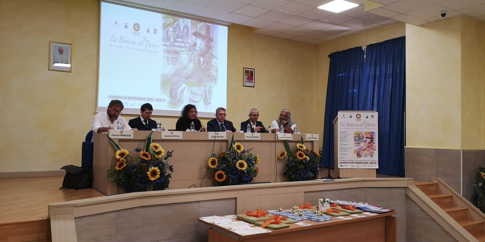 Il 22 settembre a Sulmona si è tenuto il convegno dal titolo "La bistecca del pastore: pane, formaggio e Dieta Mediterranea nell’Abruzzo interno". Nelle foto 1e 2, i relatori del convegno; una panoramica della sala. Al convegno è seguita la riunione conviviale al ristorante Villa Elena di Sulmona. In foto 3. Il Vice Presidente vicario Mimmo D’Alessio, il Vescovo di Sulmona-Valva Mons. Michele Fusco e alcuni ospiti. In foto 4. Il Delegato Giovanni Maria D’Amario con due gentili ospiti.