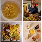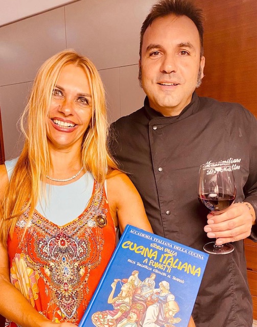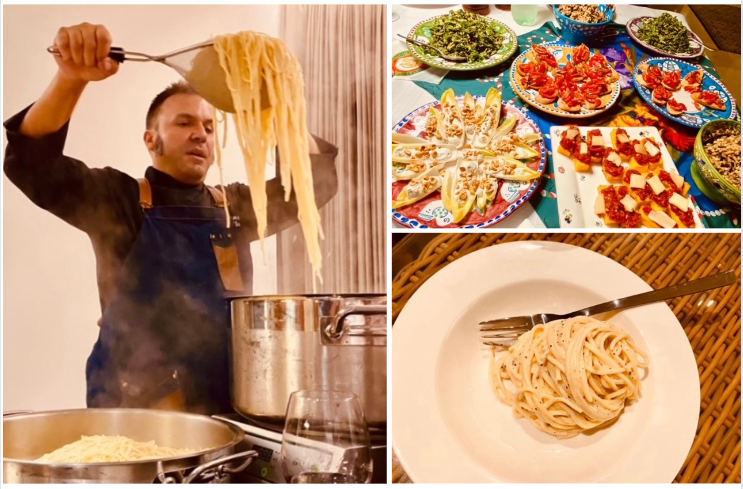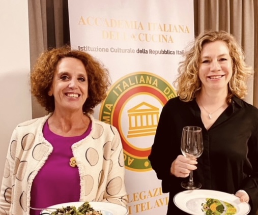 Riunione conviviale al “Blue Project Canada Israel” degli Accademici di Tel Aviv per il brindisi prima delle Feste Ebraiche. La cena è stata preparata e cucinata magistralmente dal vincitore di “Masterchef Israele” Massimiliano Di Matteo che riesce sempre con i suoi piatti speciali estremamente italiani e prelibati a riscuotere un grandissimo successo. Il menu è stato scelto dallo chef insieme alla Delegata Cinzia Klein, Simposiarca della serata. All’evento, molto riuscito e gustoso, hanno partecipato S.E. l'Ambasciatore d'Italia Sergio Barbanti con la moglie Laetizia Maraini, Accademica Onoraria, il Primo Segretario dell'Ambasciata Sara Castellani, il Console di Tel Aviv Emanuele Orlani e varie figure di spicco della società israeliana. In foto 1. Da sinistra, l'Accademica Onoraria Laetizia Maraini, Accademica Luisa Grego, S.E. l'Ambasciatore Sergio Barbanti, la Delegata Cinzia Klein. Foto 2. La Delegata consegna allo chef Di Matteo il volume sulla cucina italiana a fumetti. Foto 3. La vice Delegata Sabrina Fadlun e l’ospite Joelle Inowlocki. Foto 4. Preparazione delgli spaghetti alla chitarra cacio e pepe; antipasto.