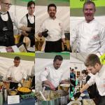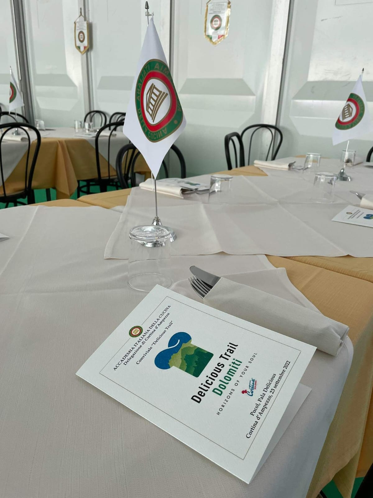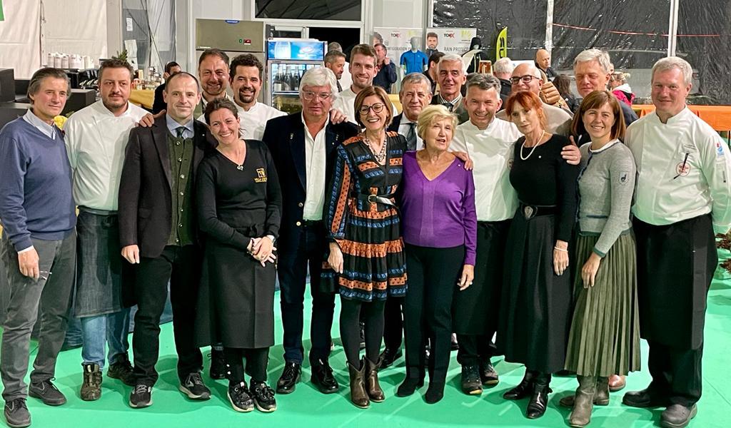 L’incontro conviviale di settembre della Delegazione di Cortina d’Ampezzo si è tenuta nell’ambito della Delicious Trail Dolomiti, la famosa gara che si svolge tra il centro di Cortina, Pocol, Croda da Lago, 5 Torri, Nuvolau, Lagazuoi e Passo Falzarego, attraversando i musei all’aperto della Grande Guerra. Ciò che rende unico nel proprio genere questo evento è la valorizzazione dell’aspetto enogastronomico, in quanto è ben nota l’alta qualità della cucina e la cura del servizio presentate dagli organizzatori. Venerdì 23 settembre a Pocol, presso il Pala Delicious (foto 1) allestito per l’occasione a fianco dell’Hotel Villa Argentina, la Delegazione si è ritrovata per degustare le proposte di cinque ristoranti e di una pasticceria di Cortina: Baita Fraina con Luca Menardi, Villa Oretta con Luigi Anzanello, Tivoli con Graziano Prest, Lago Scin con Carlo Festini Cucco, Al Camin con Fabio Pompanin, Pasticceria Alverà con Massimo Alverà (foto 2, i cuochi al lavoro). Un’occasione unica per vedere riuniti all’opera tutti insieme i cuochi del territorio che hanno cucinato a vista all'interno del tendone, componendo un menu gustoso e calibrato (foto 3, le pietanze servite). Gli Accademici hanno trascorso una serata originale che ha saputo esaltare la cucina tradizionale del territorio (foto 4. Accademici e cuochi).