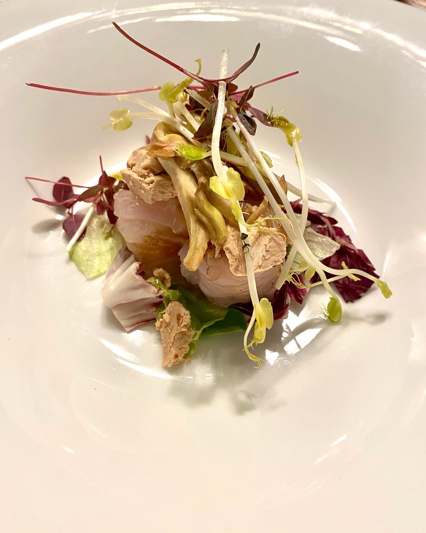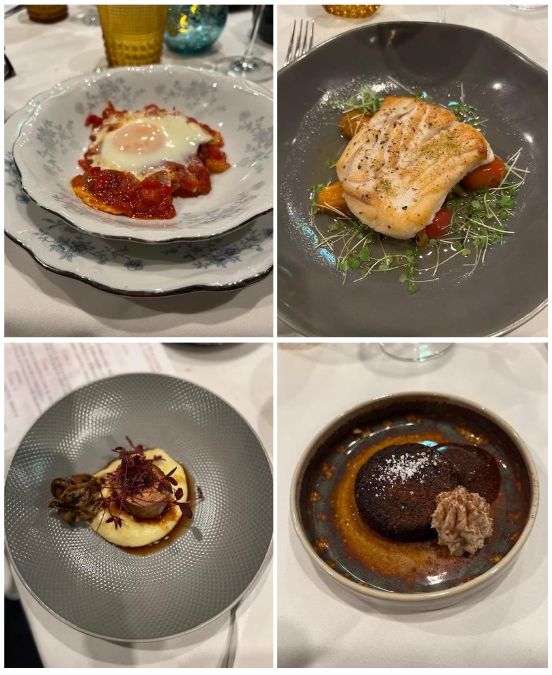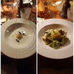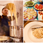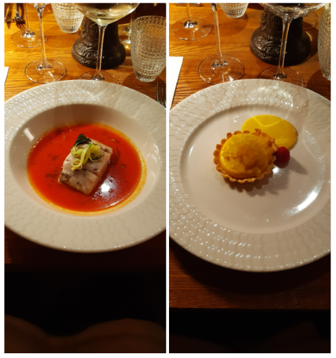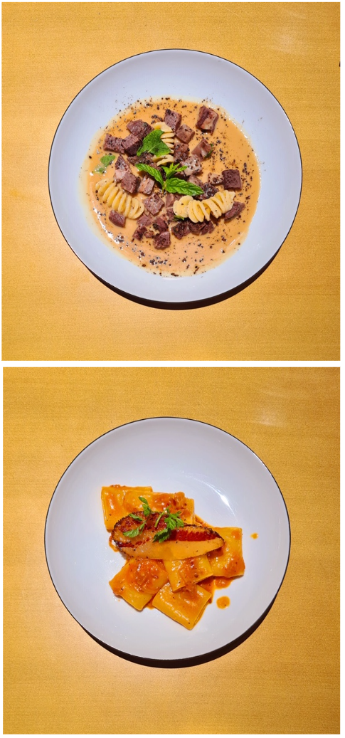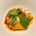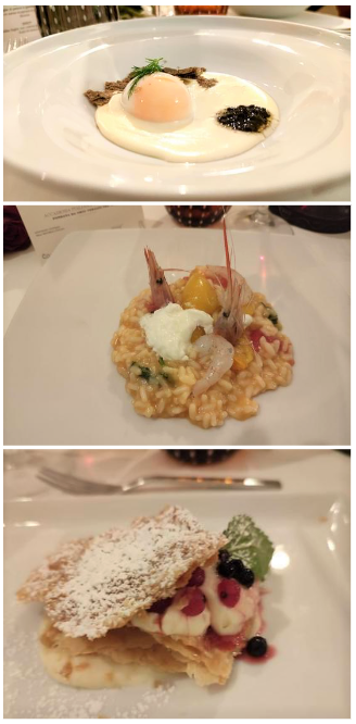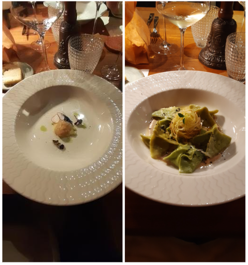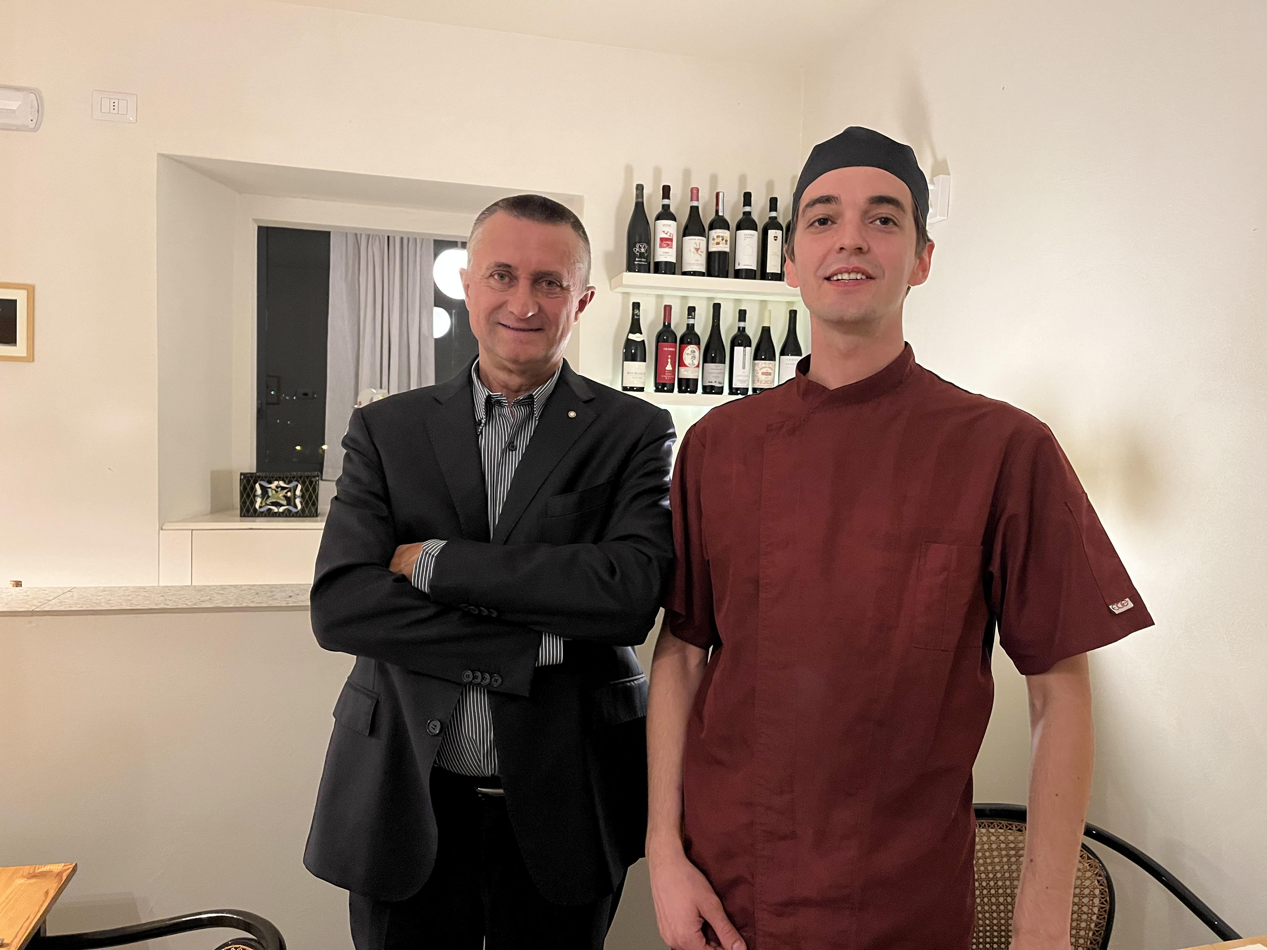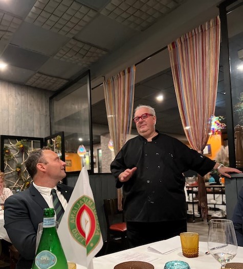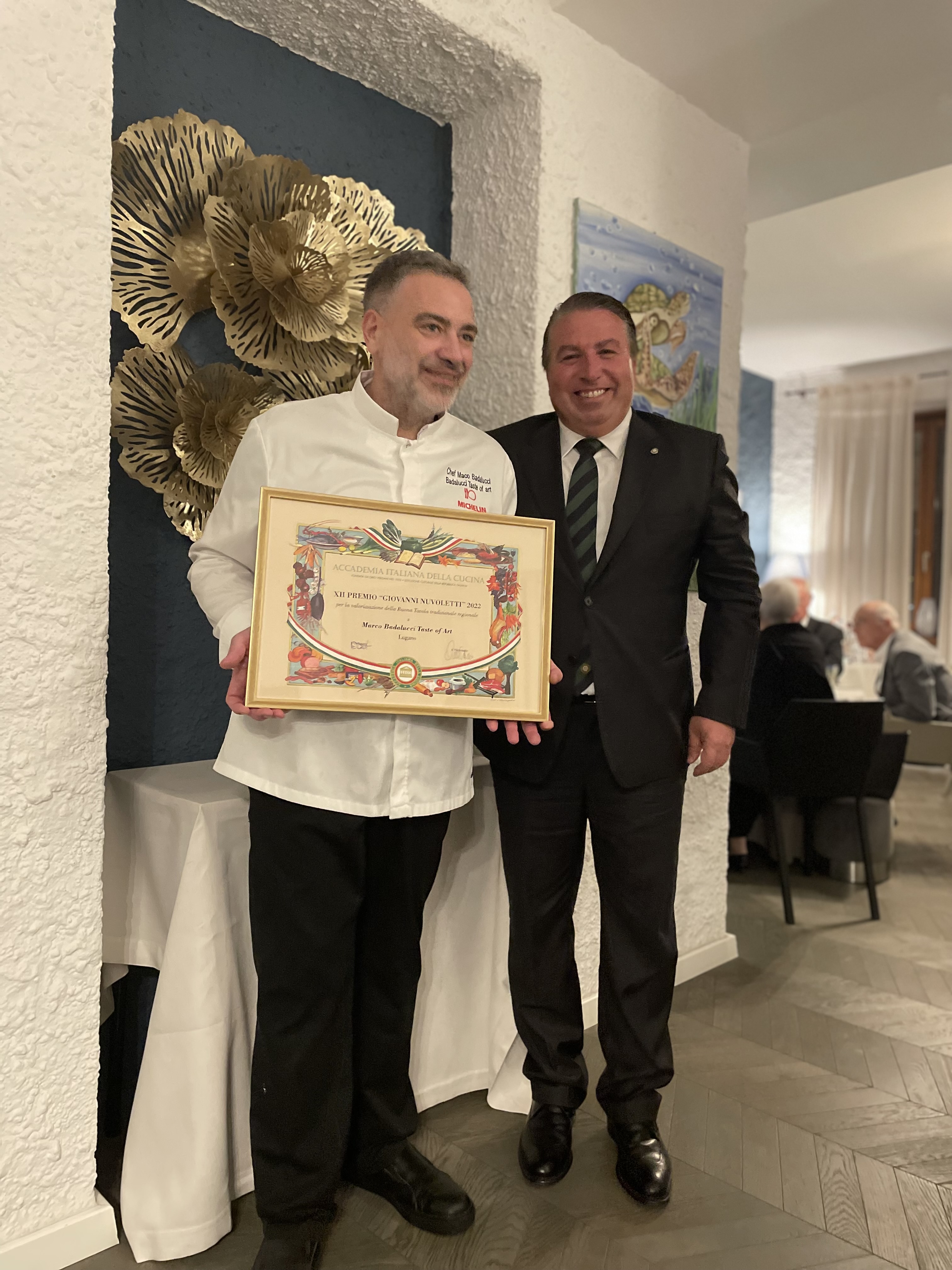 La Delegazione della Svizzera Italiana si è ritrovata presso il ristorante Badalucci “Taste of art” di Lugano. Una serata di particolare importanza per la consegna allo chef Marco Badalucci del premio “Giovanni Nuvoletti” (2022). Badalucci è nato a Procida, eletta “capitale italiana della cultura per il 2022”. Il Simposiarca Angelo Bondi ha letto alcune poesie tratte dall’antologia di Giulio Badalucci, padre dello chef, che raccoglie pensieri ed emozioni di una vita. Un convivio che ha soddisfatto tutti i 41 partecipanti per la qualità del menu, dei vini in accompagnamento e per lo spirtito di partecipazione. Foto 1. Da sinistra, chef Marco Badalucci e il Delegato Emilio Casati. Foto 2. Da sinistra, il Simposiarca Angelo Bondi e Arthur Bolliger. Foto 3 e 4. Paccheri con salsa ai crostacei, ricci di mare e burrata; millefoglie di spigola e foie gras, insalata di carciofi e gel di aceto balsamico.