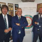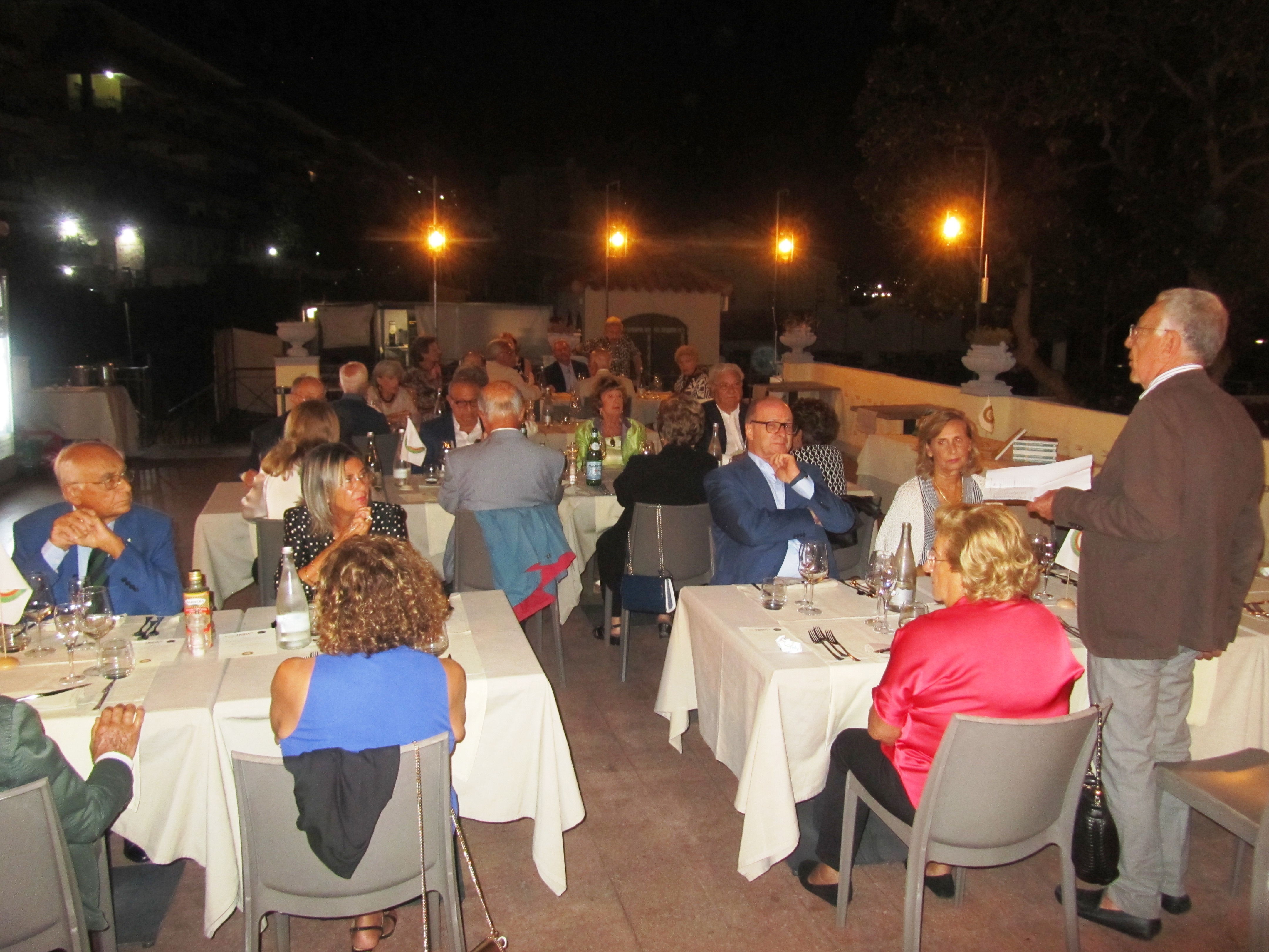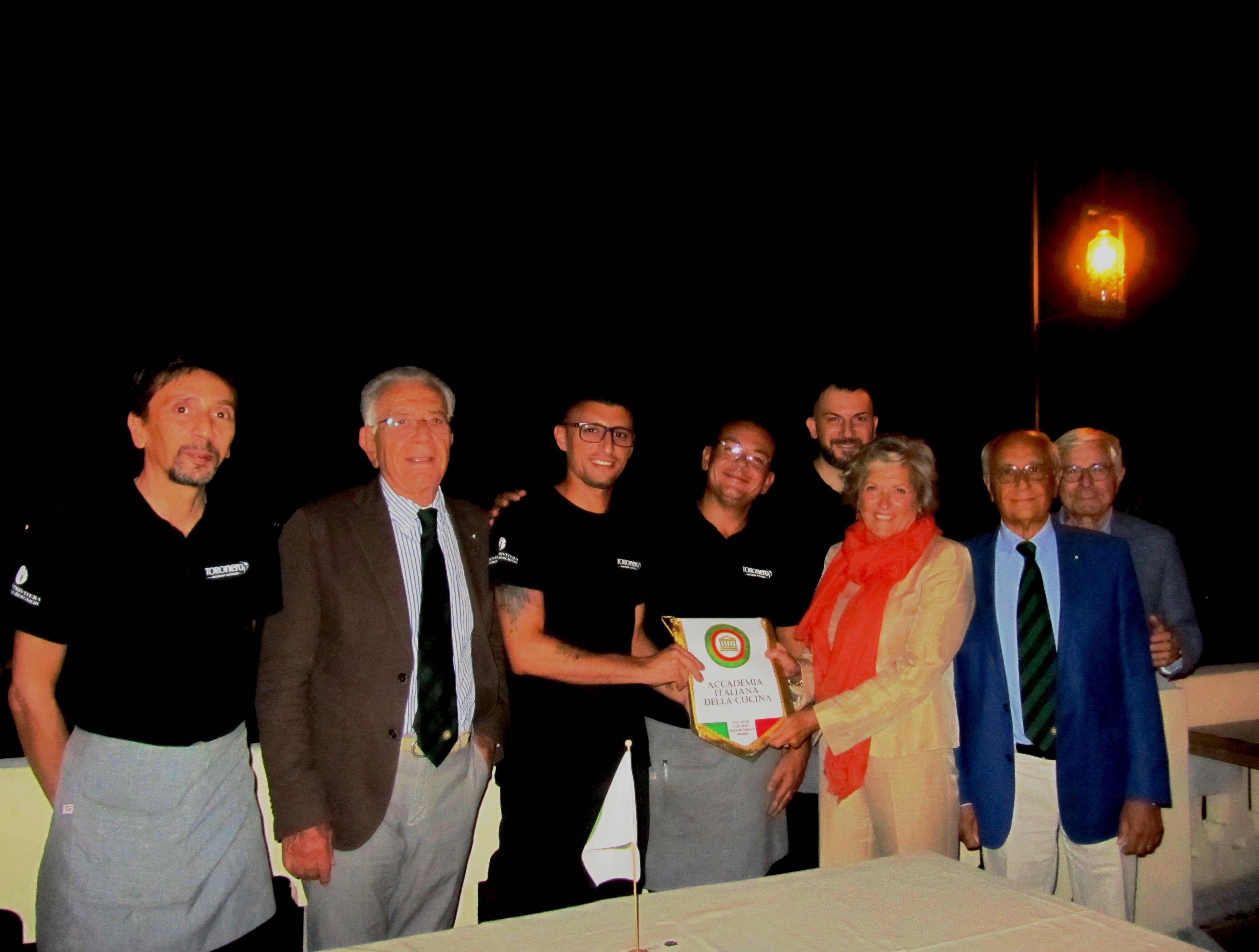 Gradita riunione conviviale, alla ripresa dopo la pausa agostana, nella sede estiva di Toro Nero-Rais che ha riservato per la Delegazione una elegante terrazza panoramica del villino liberty presso cui ha sede, con vista sullo Stretto e a pochi minuti dal centro di Messina. Il Delegato (foto 1), introducendo il convivio, ha informato gli Accademici dell’intenso programma per i prossimi mesi. Il Simposiarca Salvatore Ragusa (foto 2, primo a sinistra) ha illustrato la filosofia del giovane chef Mirko Cannata alla larga rappresentanza di Accademici che ne hanno apprezzato la proposta gastronomica, fedele alla stagione della pesca e al territorio. Festosa la conclusione della serata con la consegna del guidoncino allo chef e alla ottima squadra di sala da parte della vice Delegata Patrizia Marullo Rizzo unitamente ai Consultori Ragusa e Faranda (Foto 3).