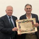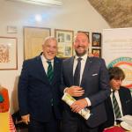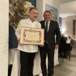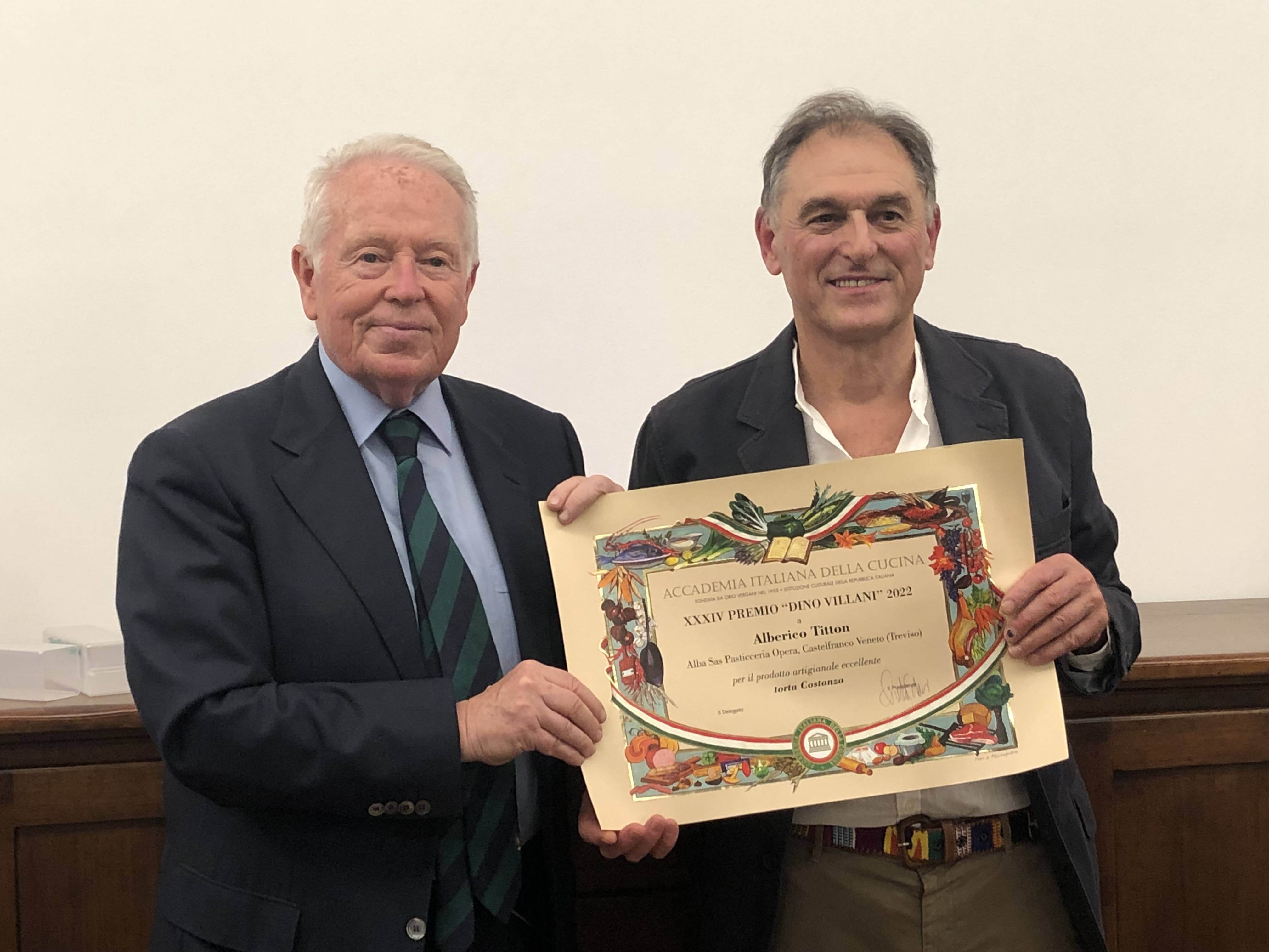Riunione conviviale dell’equinozio al ristorante “Alla Speranza” di Castelfranco Veneto con cerimonia di consegna del Premio “Dino Villani” 2022 per la Torta Costanzo prodotta dalla pasticceria Opera. Il prestigioso riconoscimento è stato consegnato al titolare pasticcere Alberico Titton che è riuscito magistralmente ad amalgamare tutti i componenti in perfetto equilibrio fra di loro. La Torta Costanzo è una piccola antologia di richiami storici che, dall’epoca di Giorgione e della Serenissima Repubblica con le sue molteplici eccellenze, arrivano fino alle produzioni contadine di Castelfranco Veneto. Ogni ingrediente presente nella preparazione vuol essere, infatti, una citazione di quell’epoca. Dopo la cerimonia di consegna, per dessert è stata servita la torta Costanzo con il gelato di vaniglia Bourbon, un abbinamento perfetto che ha permesso di percepire i vari ingredienti in armonia fra loro. Prima della degustazione, Giancarlo Saran, Accademico di Treviso e membro del Centro Studi Franco Marenghi, ha diffusamente ripercorso gli eventi storici che fanno da corollario alla torta Costanzo ed evidenziato le capacità professionali del pasticcere che è riuscito a realizzare un prodotto di eccellenza capace di conquistare facilmente i gusti di tutti, all’interno e all’esterno della Provincia. In foto. Il Delegato Nazzareno Acquistucci e il Pasticcere Alberico Titton.