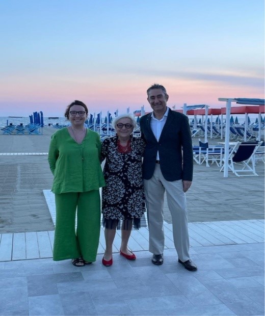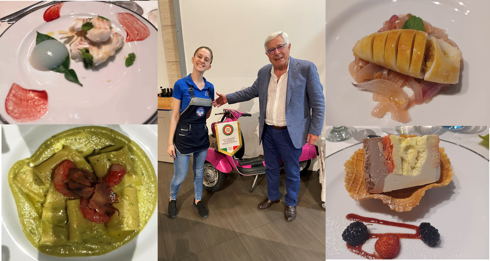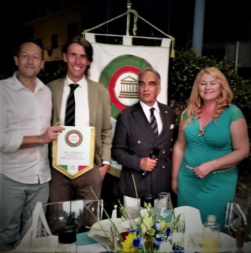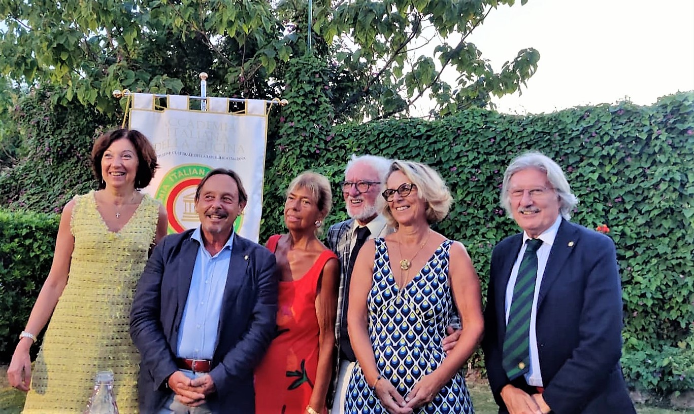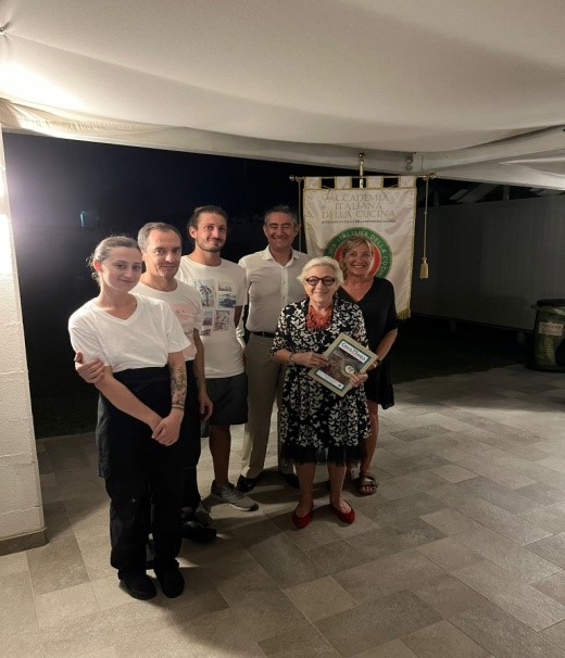 Come ormai consuetudine da alcuni anni, la Delegazione visita uno dei tanti stabilimenti balneari della costa versiliese per la riunione conviviale di luglio. Il Segretario e Simposiarca Bruno Toni, per l’occasione, ha individuato il Bagno Montecristo di Ponente, che affonda le sue radici ai tempi dei Savoia. Gli attuali proprietari Anna, Nicola ed il figlio Samuele lo gestiscono con lo stesso impegno e amore dei propri avi. Una spiaggia curata, il mare e uno splendido tramonto hanno fatto da sfondo al convivio. Dopo aver assaporato dei piccoli appetizer offerti dai proprietari, la Delegata Anna Ricci ha aperto la riunione con il tradizionale rintocco della campana dell’Accademia. È stata poi presentata la nuova Accademica Francesca Arquint che ha ricevuto le insegne accademiche (foto 1 con il Segretario e la Delegata) e sono seguiti i saluti ai convenuti e la presentazione del menu (foto 2). Molto apprezzato l’antipasto, un cestino croccante di gamberetti di fondale ed anellini di cipolle, meritevole di un bis. A seguire Gazpacho con burattina ed acciughina del Cantabrico; gnocchetti di patate con frutti di mare ai fiori di zucca; su richiesta il Baccalà alla livornese piatto tipico della zona preparato rispettando i dettami della tradizione. A conclusione, semifreddo al pistacchio (tutti i piatti in foto 4). Una piacevole conviviale, per l’atmosfera e per l’accuratezza e la professionalità della preparazione dei piatti, che si è conclusa con la consegna ai proprietari, allo chef Andrea e all’aiuto cuoco Manjolo, di alcune pubblicazioni dell’Accademia (foto 3).
