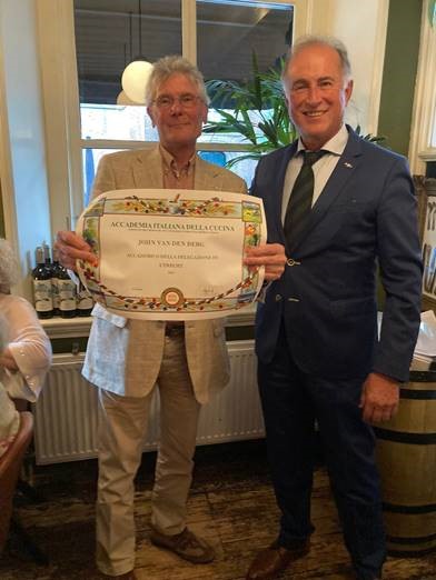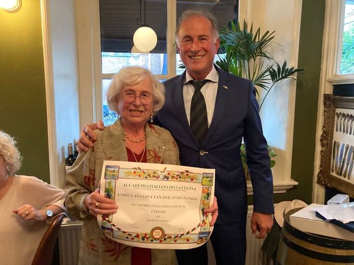 Dopo una visita guidata alla storica città di Wijk bij Duurstede, la Delegazione ha visitato, per la prima volta, il ristorante “Sempre Lui”. Chef e patron Davide Brüggeman che ha deliziato gli ospiti con un ottimo arancino di riso ai fungi e tartufo, squisito e ben caldo. Le altre portate: ravioli al burro e salvia, spezzatino, polenta fritta e, per concludere, un semifreddo molto apprezzato per la sua delicatezza e cremosità. Vini eccezionali e presentati con professionalità dalla proprietaria e maître Laura Meyer. Serata speciale per la Delegazione - a cui è stata riservata per l'occasione una sala del ristorante - per la consegna delle insegne all’Accademica onoraria Enrica van der Avort-Panigo (in foto 1 con il Delegato Spada) e al neo Accademico John van den Berg (in foto 2 con il Delegato).