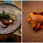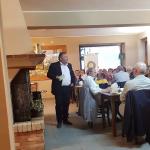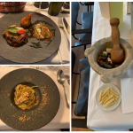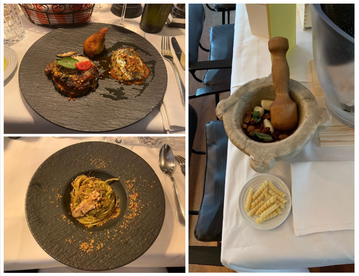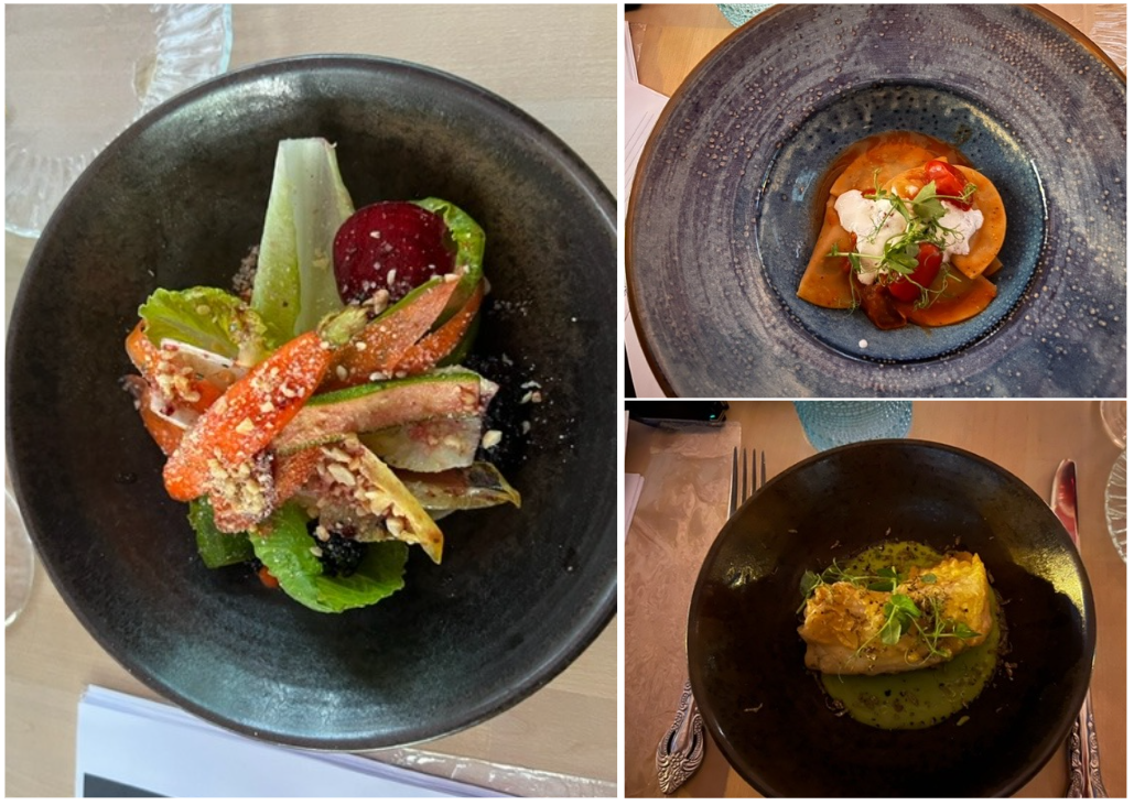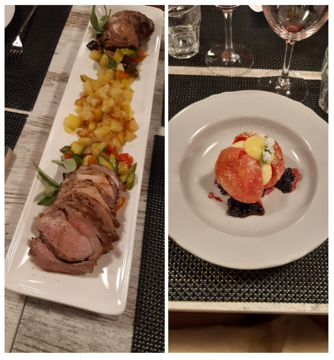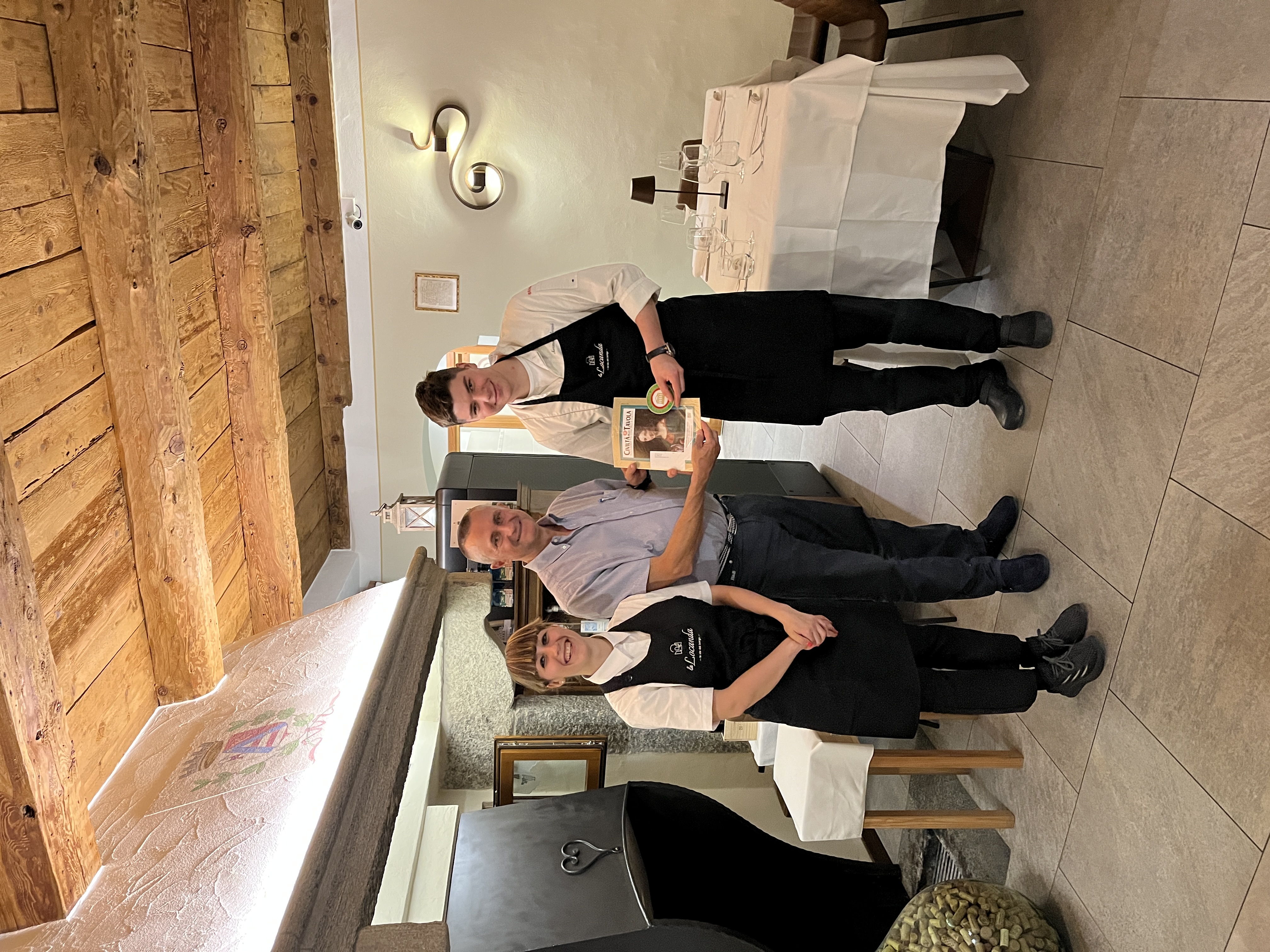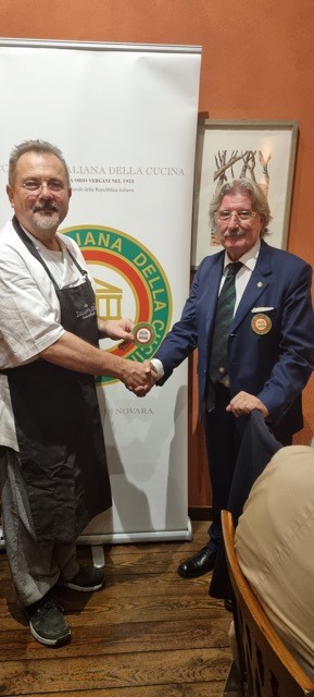 A Toceno, nella valle Vigezzo, in pieno centro storico, dal 2020 si trova il ristorante “la Locanda”, in una casa del 1800 ristrutturata in tipico stile ossolano. Il giovanissimo chef Norman, aiutato in sala dalla fidanzata Elisabetta, propone nel menu diversi piatti della tradizione locale, adeguandoli ai tempi attuali, con semplicità e buon gusto. Per la riunione conviviale della Delegazione locale, lo chef ha proposto, come benvenuto, le immancabili bollicine con stuzzichini di salame e formaggio prodotti in valle, seguiti dall’antipasto tipico per eccellenza: prosciutto di Vigezzo con burrata e chips di pane nero di Coimo. Come primo piatto gnocchi di ricotta e spinaci, scaglie di parmigiano e burro e, a seguire, un piatto gustoso e delicato: aletta di vitello cotta a bassa temperatura con purea di sedano rapa e verdure di stagione. Per finire, una golosa cheesecake al pistacchio. La piccola sala completamente a disposizione degli Accademici ha permesso di trascorrere una riunione conviviale molto piacevole e in totale serenità. A fine serata Norman ed Elisabetta si sono intrattenuti con gli Accademici, raccontando di una sorprendente realtà locale fatta di giovani loro coetanei che hanno avviato diverse attività di coltivazione e allevamento con le quali collaborano, compresa la produzione del primo gin ossolano prodotto con ingredienti locali, offerto dai gestori, molto apprezzato e gradito. La serata si è protratta oltre la mezzanotte, con la convinzione che la disponibilità, l’entusiasmo e la positività dimostrati da questi giovani saranno la garanzia per il futuro della cucina Italiana. Foto 1. Il delegato Paolo Rossi consegna allo chef la rivista dell’Accademia e la vetrofania. Foto 2. La tavolata con Delegato e vice Delegato. Foto 3 e 4. Le portate.