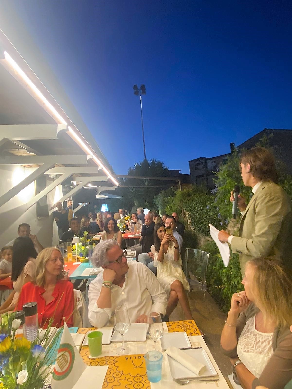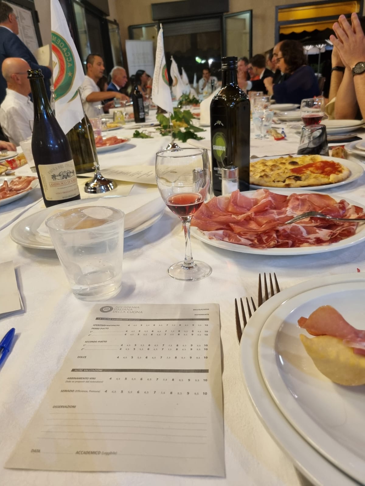 Per la riunione conviviale di luglio, la Delegazione del Valdarno Fiorentino si è ritrovata al ristorante Podere San Giusto, all’interno di un agriturismo immerso nella splendida campagna di Figline e Incisa Valdarno. Lo chef del ristorante, Federico Nencini, insieme ai Simposiarchi Roberta Ceppatelli e Giovanni Gerini, ha preparato un menu della tradizione toscana molto apprezzato sia nella qualità sia nella presentazione. Dopo l’aperitivo, servito con un assortimento di bruschette, focacce, salumi e verdure in pastella, si sono susseguiti: spaghetti alla chitarra con zucchini, pancetta croccante, timo e mandorle tostate, rosticciana disossata ripiena con il suo filetto alle erbe aromatiche al forno, verdure dell’orto, pesca all’alchermes con gelato alla vaniglia (foto 3 e 4). L’utilizzo di vassoi e terrine preparati per due persone ha favorito la spettacolarità degli impiattamenti e la convivialità tra i commensali. Tutto il menu ha ottenuto una valutazione ottima (foto 1, il momento della compilazione delle schede) . Al termine della serata il Delegato Sandro Fusari, insieme ai Simposiarchi, ha voluto ringraziare la famiglia Nencini con alcuni volumi personalizzati dell’Accademia (foto 2). Dopo il suono della campana sono seguiti i tradizionali saluti e auguri per le imminenti vacanze estive.