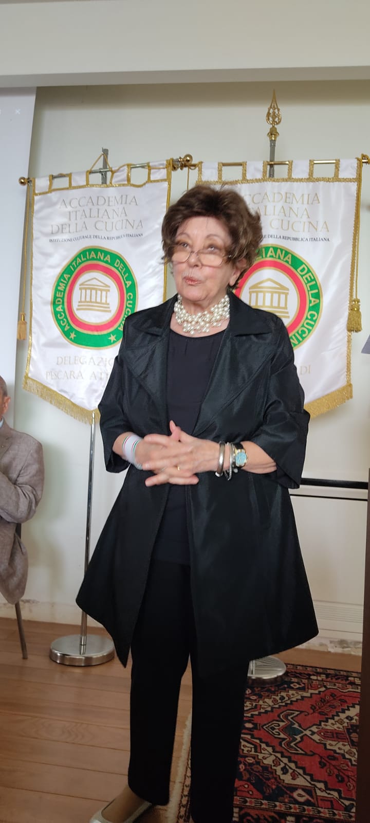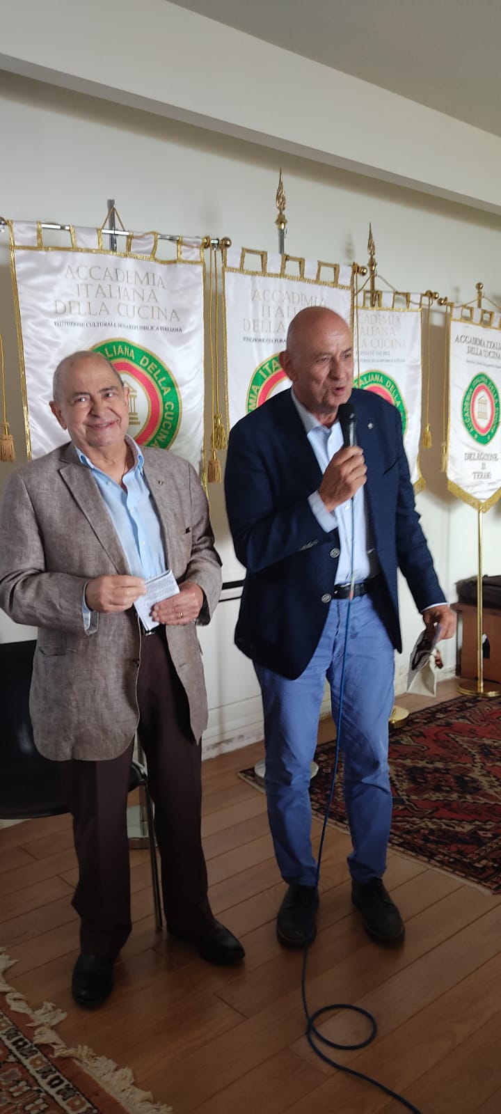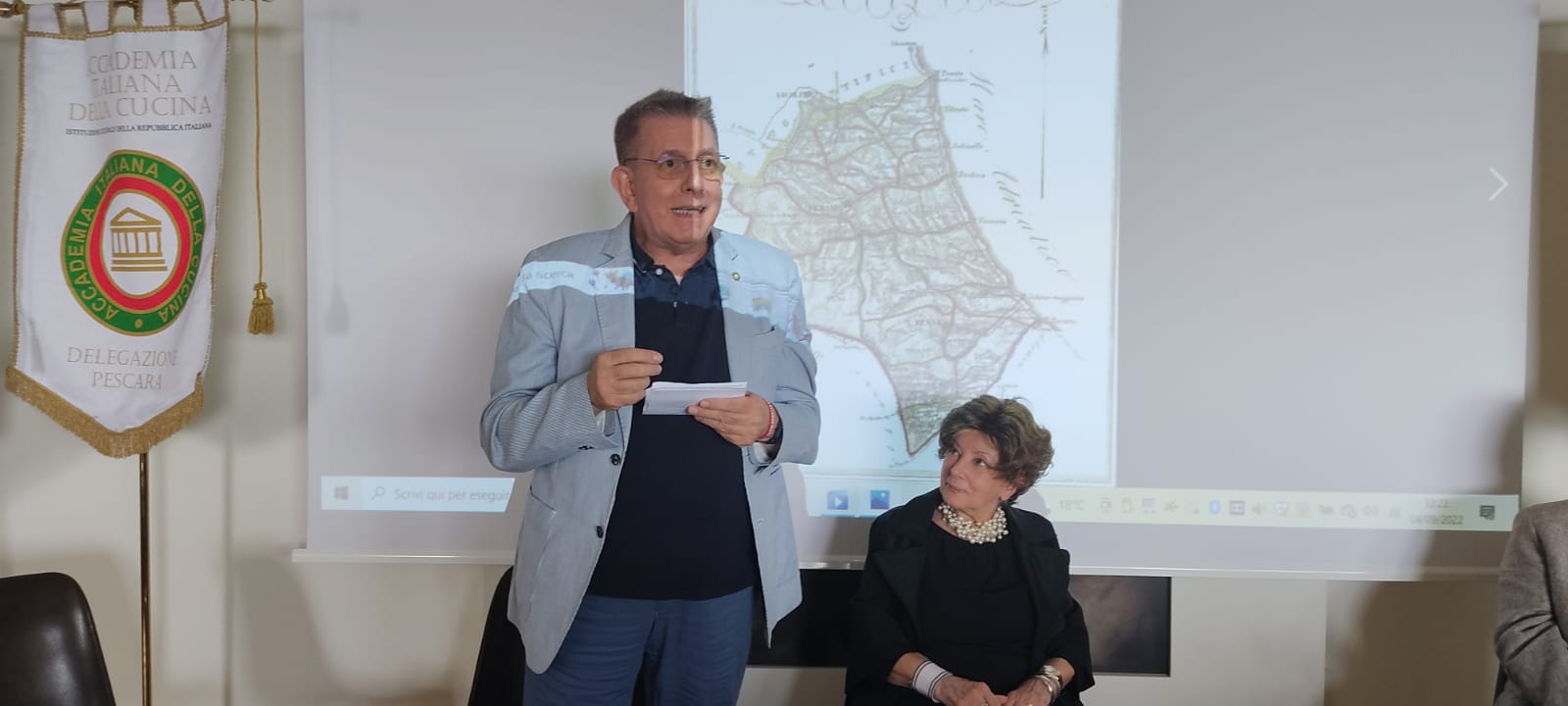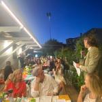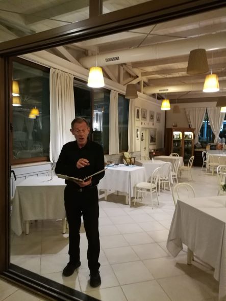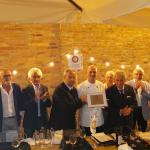 Anche per combattere la calura che in questi giorni imperversa su tutta la penisola, la Delegazione di Ascoli Piceno ha pensato bene di organizzare la seduta conviviale di luglio pressoché in riva al mare Adriatico di San Benedetto del Tronto, presso lo chalet “La lancette”. Il locale è abbastanza raffinato nel suo arredamento pur appropriato alla spiaggia prospicente. Viene gestito dalla figlia del fondatore Giorgio Papetti, Marilena, e dal marito Franco Neroni. Le vivande servite sono state preparate dalla signora Marilena e dallo chef Marco Pignati, secondo i precisi dettami della cucina locale, come il “pesto azzurro” che è una sorta di battuta al coltello di pesci azzurri, come lo sgombro e le alici, molto appetitoso e molto apprezzato da tutti i commensali (foto 1, un momento conviviale). Tra gli ospiti erano presenti alcuni Accademici provenienti da Delegazioni diverse, come l’Accademica di Teramo Silvana Di Giovanni Lamberti e l’Accademico Paolo Scarcella, proveniente, con la compagna Milena, dalla Delegazione di Messina. La serata è proseguita con vere e proprie lezioni inerenti alla pesca locale e alle varie ricette dei vari tipi di pesci dell’Adriatico con cui la signora Marilena (foto 2), con grande disponibilità, ha intrattenuto gli interessati partecipanti. In chiusura, un piacevole siparietto musicale che il marito Franco ha offerto cantando alcune romanze, con grande professionalità (foto 3). Il tutto con sincero apprezzamento dei partecipanti, per la frescura naturale e, soprattutto, per i ghiotti e prelibati piatti serviti. Foto 4. La consegna del guidoncino ai titolari da parte del Delegato Vittorio Ricci.