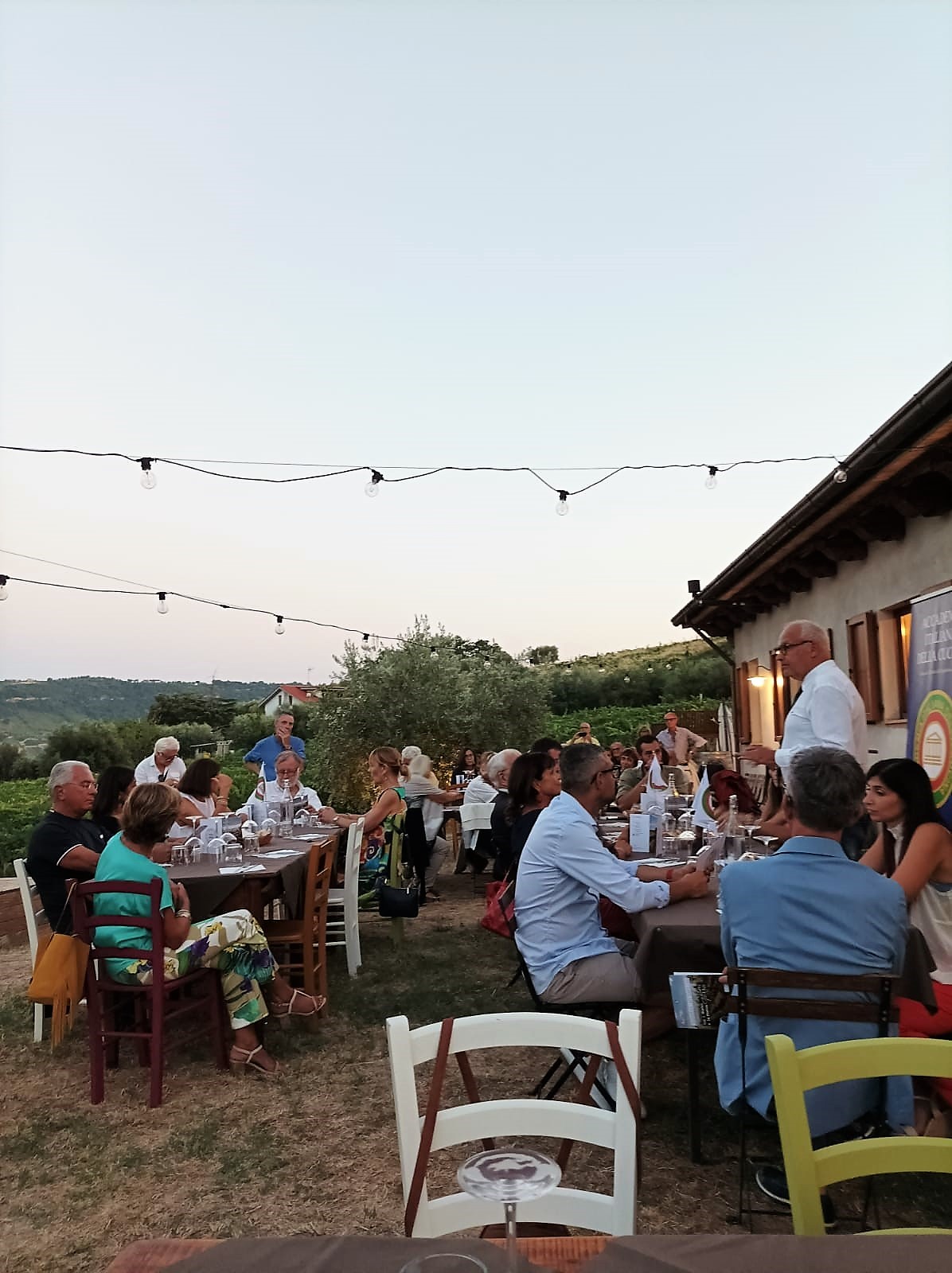 Azzeccata la proposta della Simposiarca Caterina Testa di far visita ad una delle tante Cantine del Fermano che offrono ottimi prodotti a produzione locale. La scelta è ricaduta sulla Cantina Castrum Morisci di Moresco dove, ai sette vini in degustazione, sono stati abbinati i piatti più tipici della tradizione culinaria locale. I numerosi Accademici, sotto la guida del proprietario Luca Renzi, si sono ritrovati nel tardo pomeriggio per una visita alla vigna pronta per la raccolta, per poi proseguire nei locali della cantina dove grande curiosità hanno destato le anfore di affinamento e tutto il processo di vinificazione. Il successivo convivio si è svolto all’aperto nel cortile della Cantina appositamente allestito. Lo stesso Luca Renzi si è occupato della presentazione dei sette vini, introdotti ognuno dalla lettura di aforismi in tema e accompagnati dalle pietanze, il tutto con grande apprezzamento dei convenuti in un clima di gioiosa convivialità. Dopo i saluti del Delegato, la Simposiarca ha presentato il convivio cui è seguita l’interessante relazione sul vino e sul “bere informato e consapevole” tenuta dagli ideatori di Wine Salade. Ad impreziosire la serata, un suonatore di organetto che ha accompagnato la parte centrale dell’incontro con le note del Saltarello Marchigiano. Graditissimi ospiti, il Prefetto dott.ssa Vincenza Filippi e consorte e il vice sindaco di Moresco Marzia Fares e consorte. In chiusura, i ringraziamenti del Delegato ai titolari della Cantina per l’accoglienza e soprattutto a mamma e suocera per le preparazioni che hanno saputo riproporre sentori e aromi della più vera tradizione con l’auspicio che simili eventi diventino attività complementari per le Cantine del Fermano.