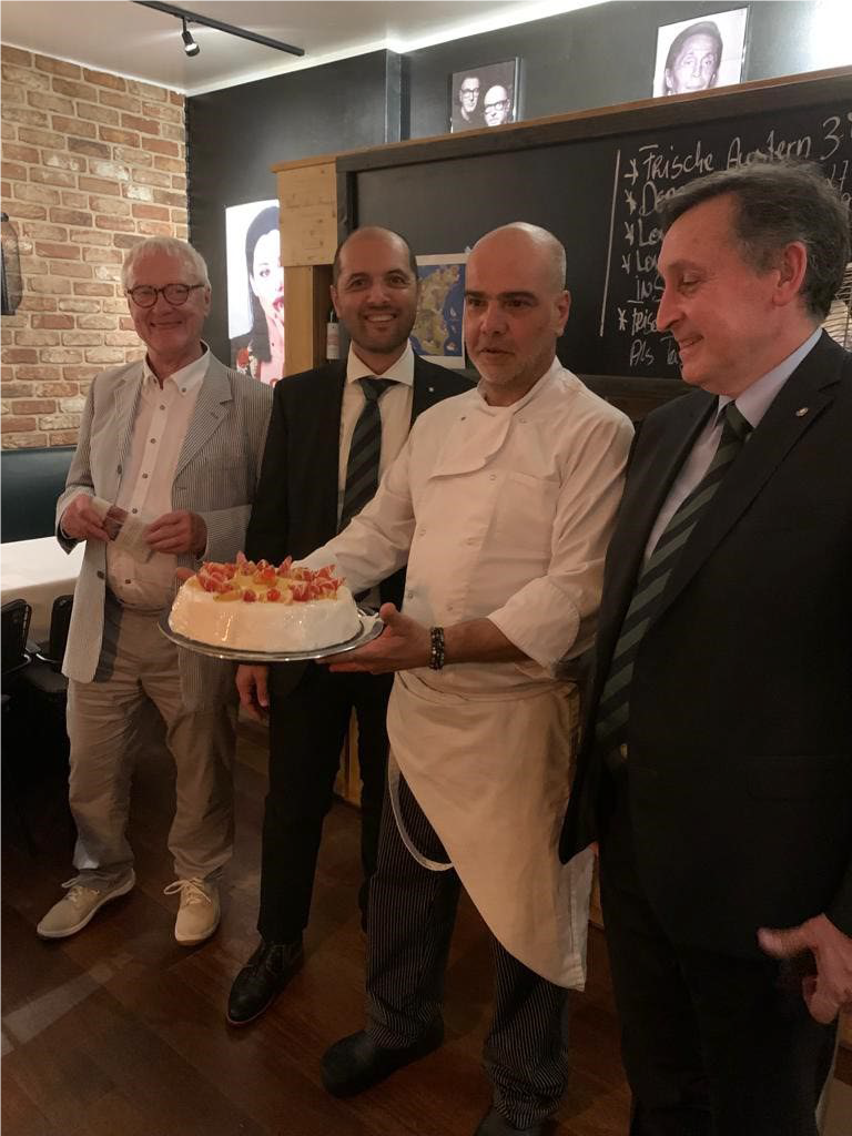 Una serata ricca di gusto e cultura organizzata dalla Delegazione di Colonia presso il ristorante “Davide” di Davide Vicario (foto 1 Accademici a tavola). La riunione conviviale organizzata dal Simposiarca Natale Di Rubbo ha avuto come tema “La cultura e la gastronomia siciliana”. È stato ricordato come millenni di storia e di influenze culturali di vari popoli hanno cesellato una cultura culinaria unica al mondo unendo e armonizzando ingredienti molto diversi fra loro. Il cuoco, Salvatore Cipriano, originario di Barcellona Pozzo di Gotto (ME), ha scelto per gli Accademici piatti tradizionali siciliani a base di pesce, molto gustosi, in abbinamento a maestosi vini bianchi. La cena è iniziata con una selezione di antipasti che includeva arancine, sarde a beccafico e parmigiana, accompagnati da un vivace Bianco di Nera. A seguire: spaghetti alla palermitana e busiate con pesto alla trapanese, annaffiati da un profumatissimo Terra della Baronia (foto 2); involtini di pesce spada e involtini di tonno con contorno di caponata, accompagnati da un fruttato Maria Constanza. Infine, come dolce, la regina della pasticceria siciliana: una meravigliosa cassata presentata direttamente dal cuoco (foto 3). Ogni piatto è stato preceduto da una descrizione delle sue origini, della preparazione e degli ingredient base. Una serata resa memorabile anche dall’accoglienza e cortesia del personale del ristorante che ha rappresentato appieno l’ospitalità tipica siciliana (foto 4. Il Delegato Vincenzo Pennetta consegna al titolare e allo staff la vetrofania AIC).