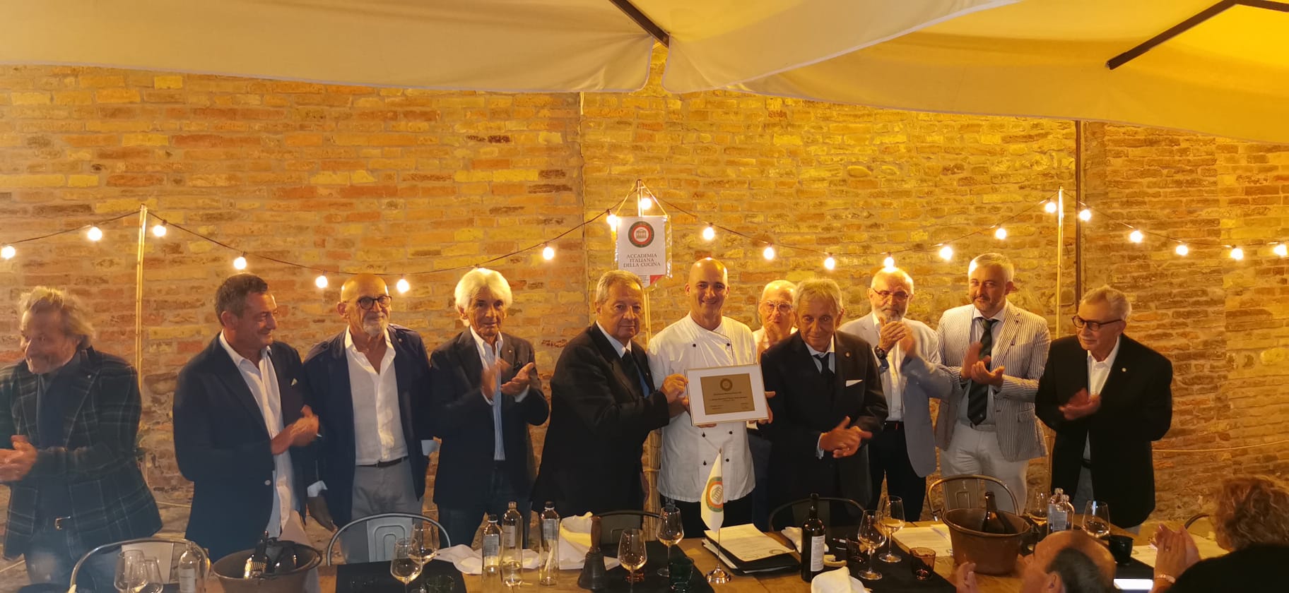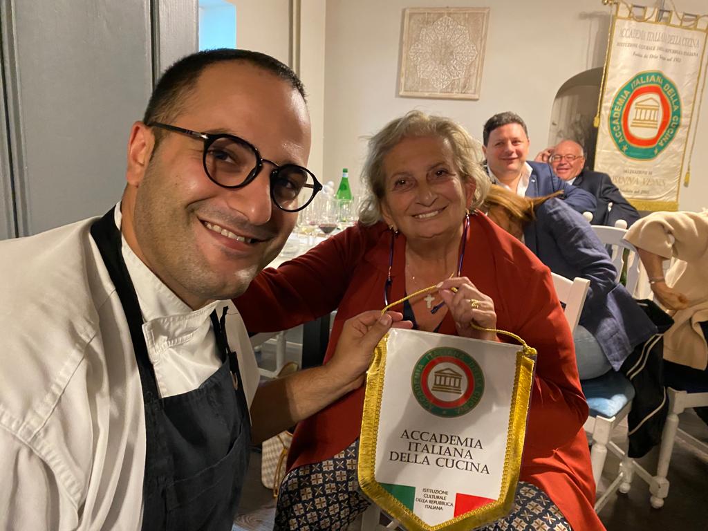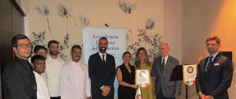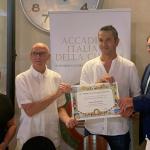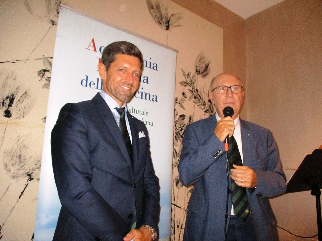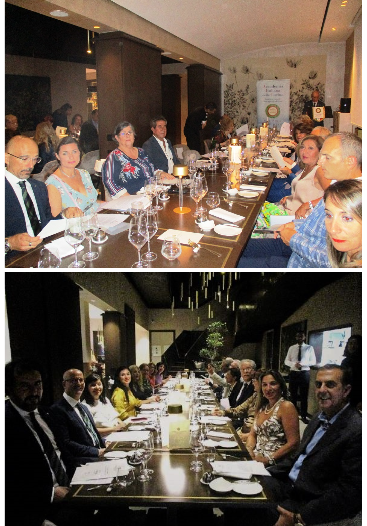 Simposio di fine estate della Delegazione di Siracusa presso il ristorante “Cortile Spirito Santo” di Palazzo Salomone-Luxury Suites in Ortigia. Ha avviato la serata il Delegato Angelo Tamburini con i saluti alle proprietarie Elisa Di Giorgio e Simona Castelluccio e, a seguire, al Simposiarca Enrico Maggi (in foto 1 con Delegato) che ha curato la sintonia delle pietanze in tavola con l’interessante tema trattato: “UMAMI: il quinto gusto”. Il termine UMAMI, in Fisiologia della Nutrizione, definisce il quinto gusto (oltre a: dolce, salato, aspro e amaro) e si basa sugli studi avviati nel 1908 in Giappone dallo scienziato Kikunae Ikeda, prof. di Chimica all’Università Imperiale di Tokyo: “un gusto sapido, piacevole e buono: presente soprattutto nelle carni, il formaggio e alimenti lungamente stagionati: pomodoro maturo seccato al sole, funghi porcini secchi, la colatura di alici (il garum) ed altri elementi ricchi di proteine.” La relazione di Enrico Maggi ha riscosso l’applauso dei presenti e i complimenti del Delegato. Le pietanze proposte con attenzione e professionalità dal maître Mariano Luca e artisticamente realizzate dallo chef Giuseppe Torrisi: vitellina e tonno rosso, salsa tonnata con caviale di tartufo, cappero di salina fritto e salsa Kabayaki; tagliolini freschi cotti in aglio, olio e peperoncino, pesto di finocchietto selvatico, gambero rosso di Mazzara del Vallo, bottarga, colatura di alìci e salsa garum; filetto di dentice in crosta di olive, su spinaci, verdure di stagione, frutti di mare e salsa champagne; dessert dello chef con salsa ai frutti di bosco. In abbinamento, i vini proposti dal sommelier Fabio d’Urso. Infine la consegna del guidoncino da parte del Delegato Angelo Tamburini con un lungo e convinto applauso degli Accademici.