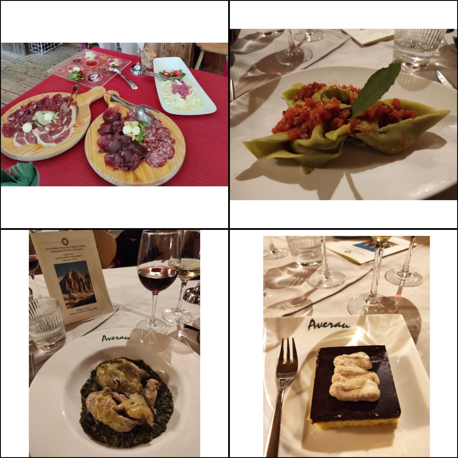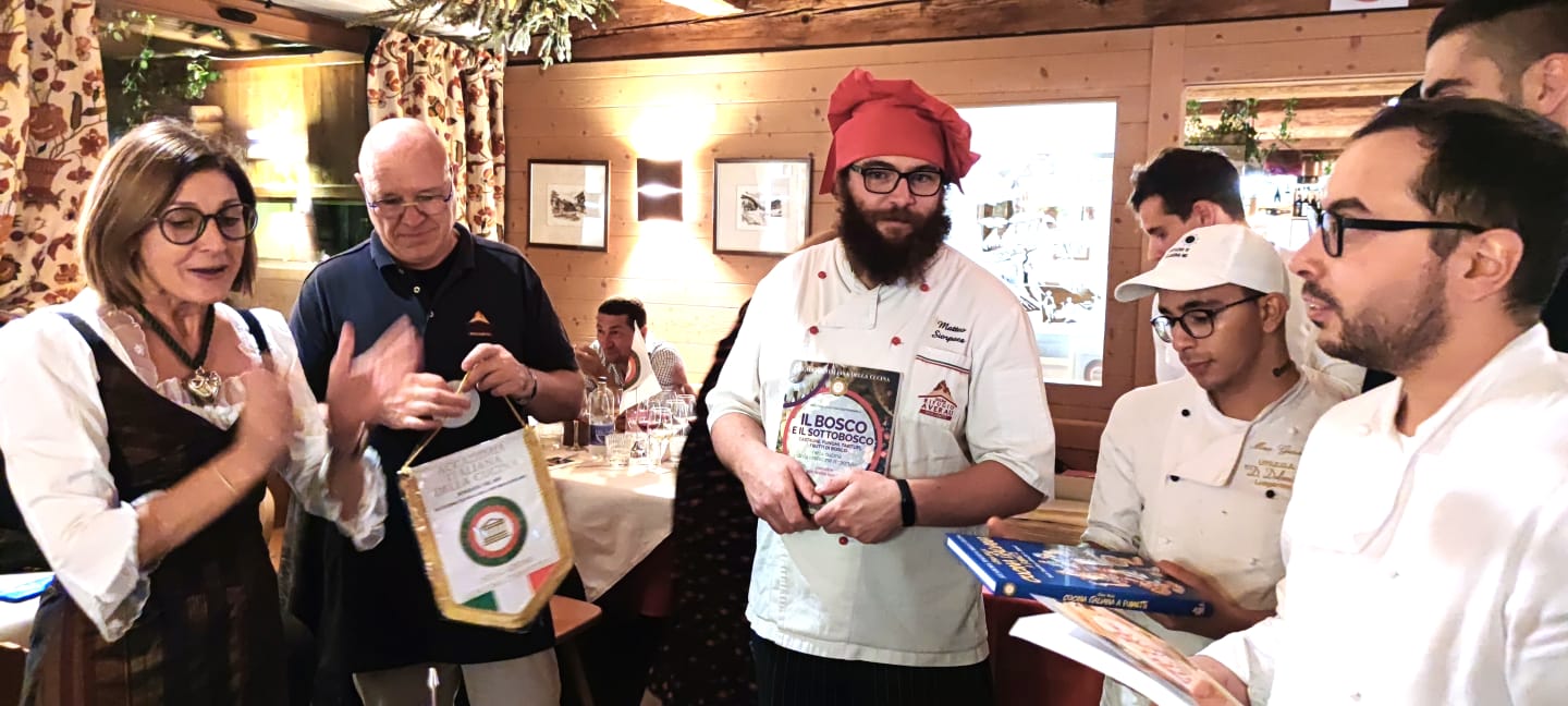 La Delegazione di Cortina d’Ampezzo prosegue il percorso dedicato alla cucina dei rifugi: il 4 agosto si è riunita presso il rifugio Averau, situato a 2413 m di altitudine. Immersi in un paesaggio fuori dal tempo, Accademici e ospiti hanno potuto godere, durante l'aperitivo in terrazza, di un tramonto spettacolare sulla forcella Averau, il cui panorama spazia su più versanti. Il tema della serata, proposto dal Simposiarca Luca Baldi in collaborazione con l’Accademica Paola Franco, era “La Tavola della Guida Alpina: com’era, com’è”. Il rifugio appartiene dagli anni ‘70 alla famiglia Siorpaes che tutt’ora lo gestisce con l’attuale nome: il proprietario e gestore è diretto discendente dell’alpinista Santo Siorpaes (1832-1900), celebre Guida Alpina ampezzana ricordata in un affresco su una delle pareti dell’edificio. Nel corso del tempo molto è cambiato nella cucina del rifugio che, accanto ai sempre graditi piatti della tradizione, affianca raffinate ed esotiche preparazioni con ingredienti che vengono da lontano. Foto 1. L'Accademica Paola Franco con la Delegata Monica De Mattia e il Vice Delegato Diego Dipol. In foto 2. La Delegata De Mattia e il Vice Delegato di Trieste Enrico Pobega. Foto 3. La Delegata, Sandro e Matteo Siorpaes e la brigata di cucina; foto 4 le pietanze servite.