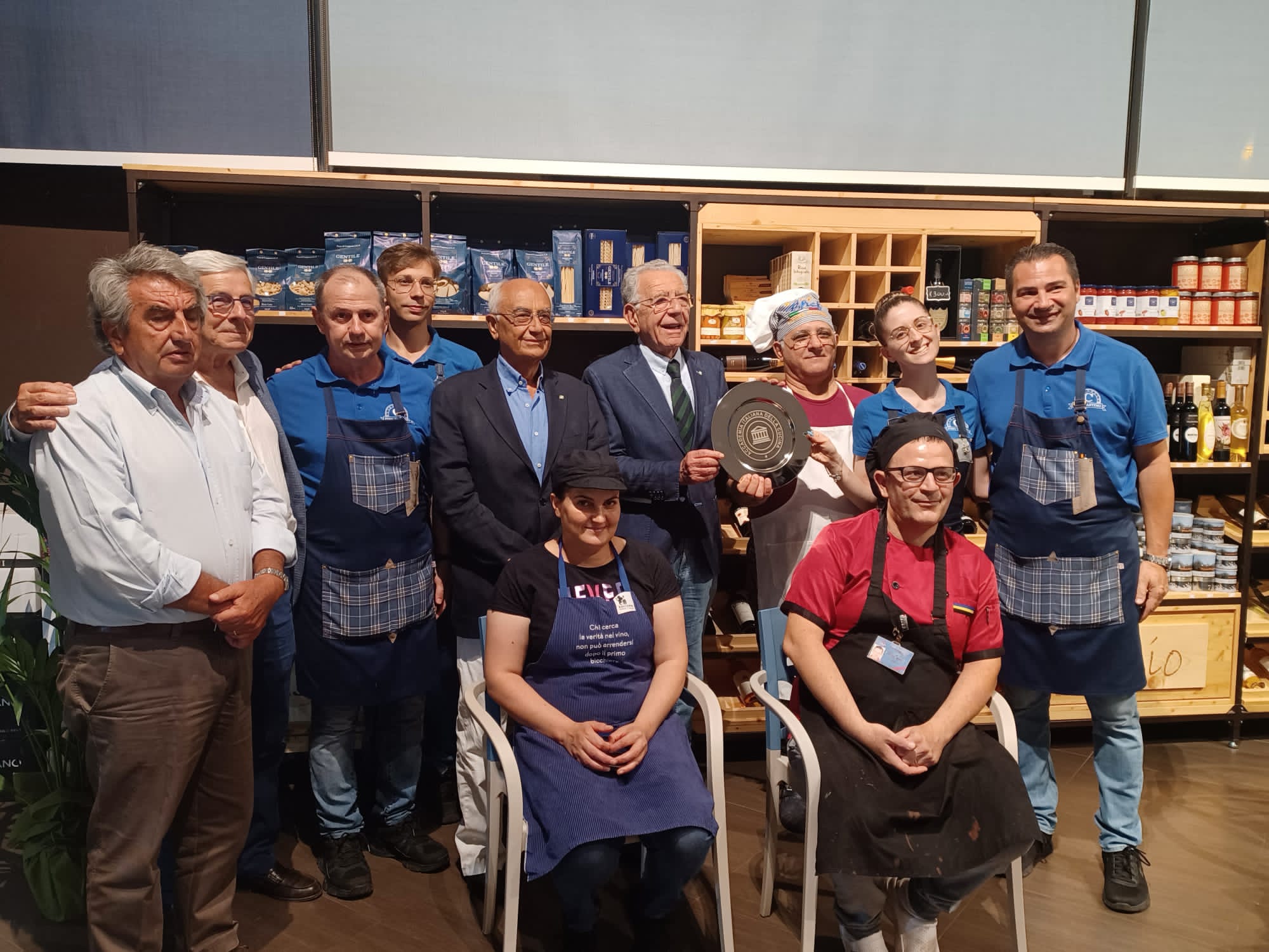 “Fish Tasting Caravello” è il giovane punto di ristorazione e degustazione annesso alla Pescheria Caravello di Milazzo, attiva da tre generazioni nel commercio del pesce del mare di Sicilia, visitato dalla Delegazione prima della pausa agostana. Gli Accademici sono stati accolti in tre tavoli elegantemente apparecchiati (foto 1) e il Delegato (foto 2) ha introdotto la riunione conviviale il cui menu è stato illustrato dal Simposiarca Tommaso Faranda (foto 3 con la rappresentante della proprietà Rita Maio). Il Simposiarca ha evidenziato la filosofia delle accurate preparazioni cucinarie basate su materie prime di eccellente qualità, fra cui spiccano il delicatissimo baccalà a vapore e il raro, antico e variopinto gelato. La consegna del piatto d’argento dell’Accademia alla eccellente squadra di sala e allo chef Carmelo Insana con i suoi collaboratori (foto 4) ha suggellato l’apprezzatissimo convivio, arricchito dal graditissimo piccolo omaggio floreale alle signore da parte di Rita.