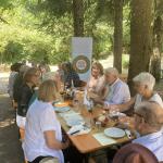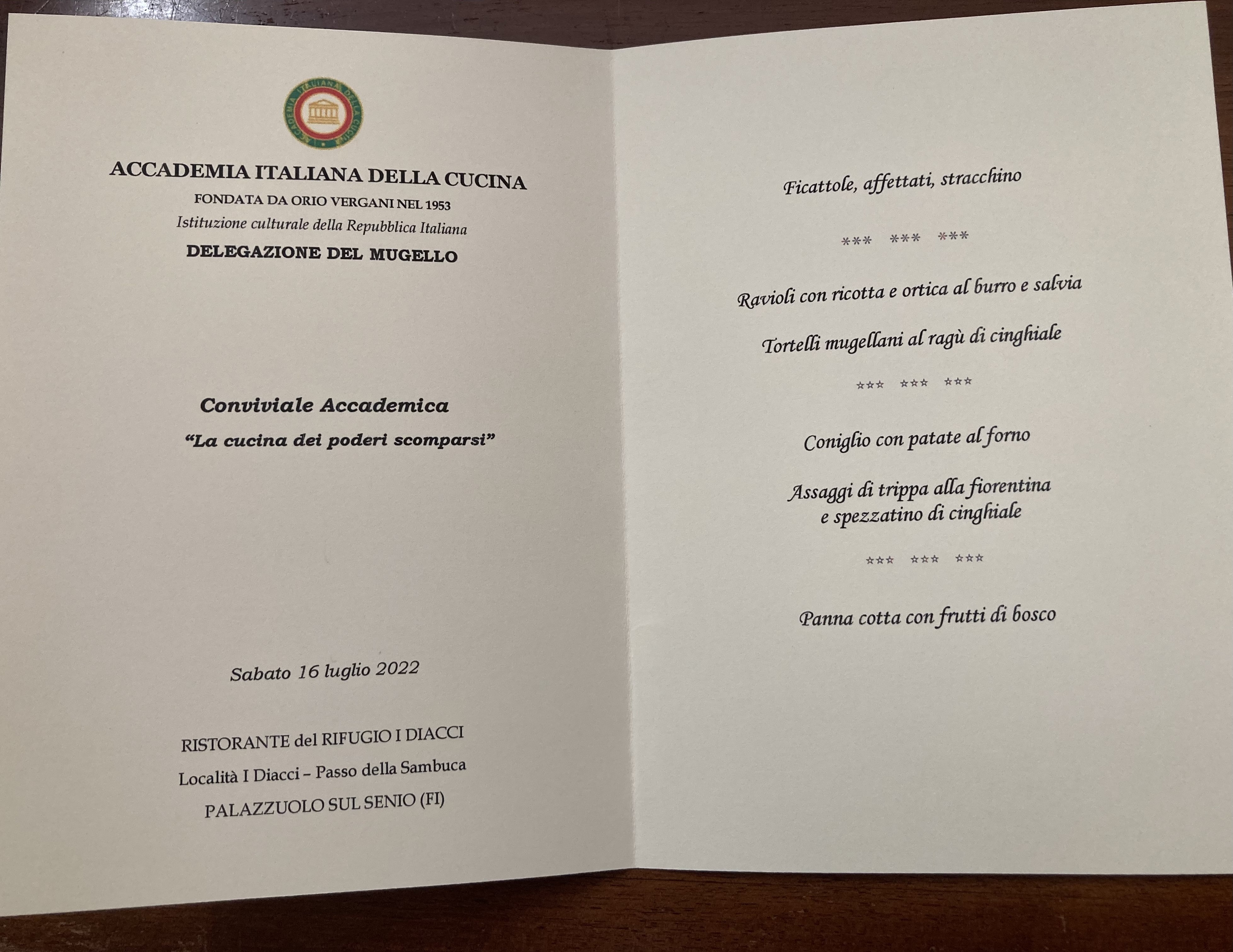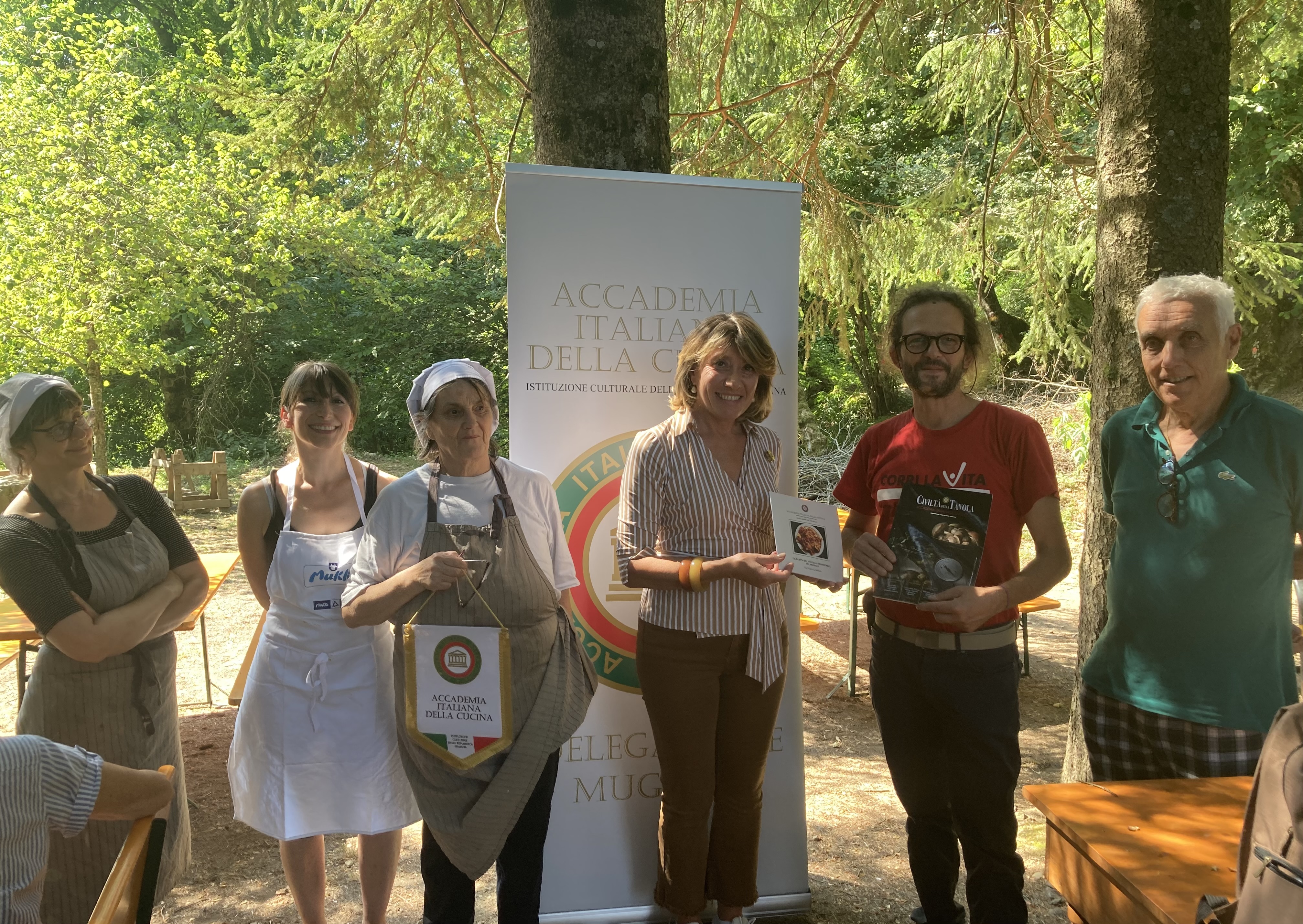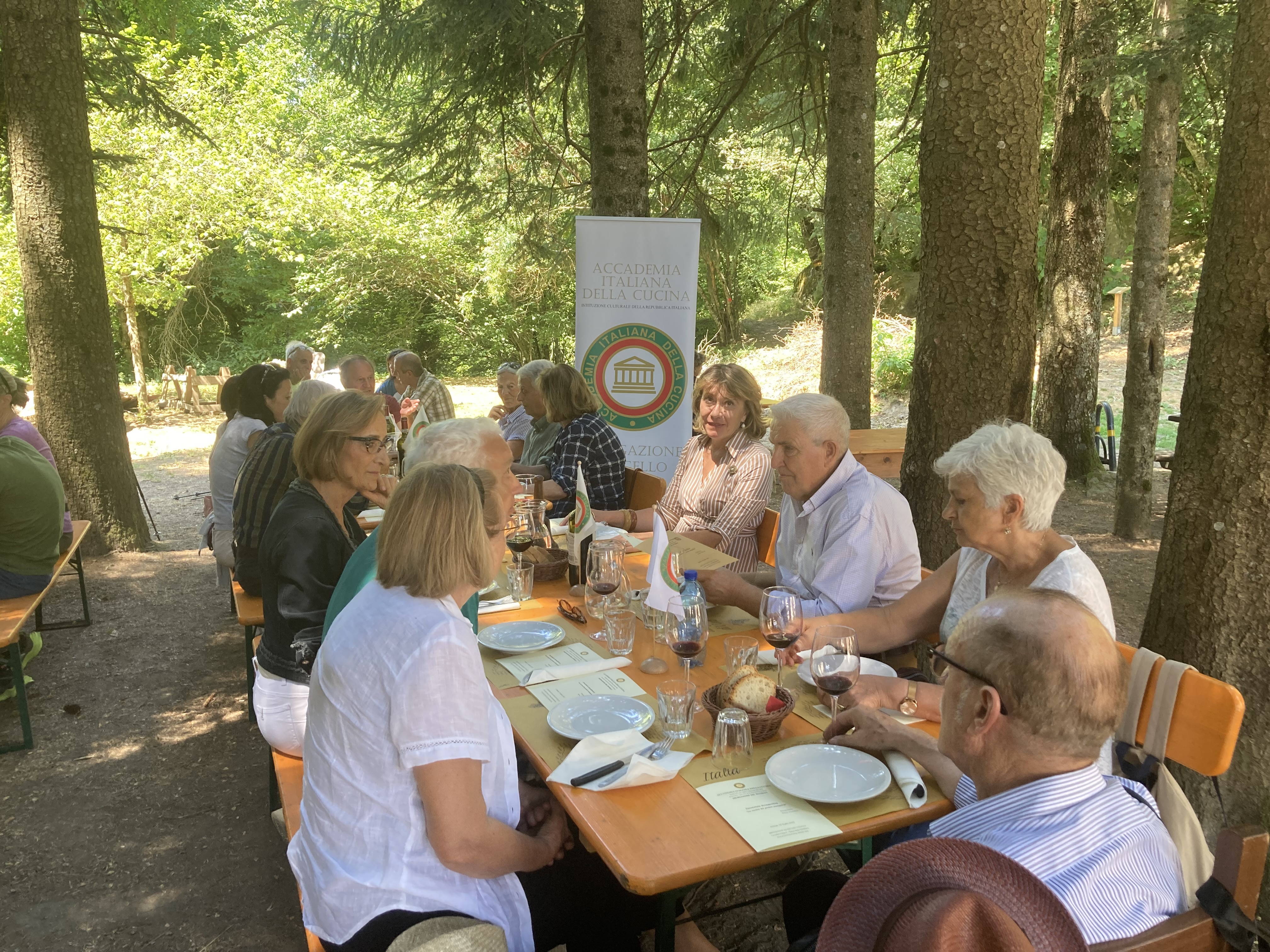 Per la riunione conviviale dei saluti prima della pausa estiva la Delegazione ha scelto il ristorante I Diacci, a Palazzuolo sul Senio (FI), situato all’interno di un rifugio immerso nelle foreste intatte dell’Appenino tosco-romagnolo. Il Simposiarca Renzo Bartoloni ha curato nei particolari il menu (foto 1) e ha illustrato ai presenti come fino alla metà del secolo scorso, quando è avvenuto lo spopolamento delle montagne, al posto del bosco attuale vi fosse un grande podere ove venivano coltivati cereali e patate e si allevavano bovini e ovini. Gli Accademici, all’ombra di faggi e abeti (foto 2 un momento conviviale), hanno potuto apprezzare i piatti preparati con cura e passione da Nadia Begliomini e da Francesca Tagliaferri, espressione di una cucina locale semplice e casalinga. Il convivio si è concluso con la consegna del guidoncino alle cuoche e di alcune pubblicazioni al gestore (Foto 1 da sinistra: le cuoche Francesca Tagliaferri, Nadia Begliomini, la Delegata Monica Sforzini, il gestore Francesco Ricci e il Simposiarca Renzo Bartoloni). Dopo il pranzo sono stati visitati un antico mulino lungo il fiume Rovigo e un essiccatoio di marroni, per poi terminare con una breve sosta presso le incantevoli cascate dell’Abbraccio.