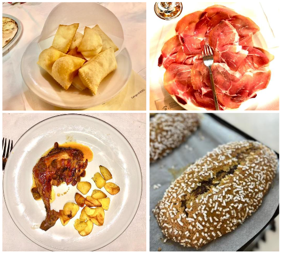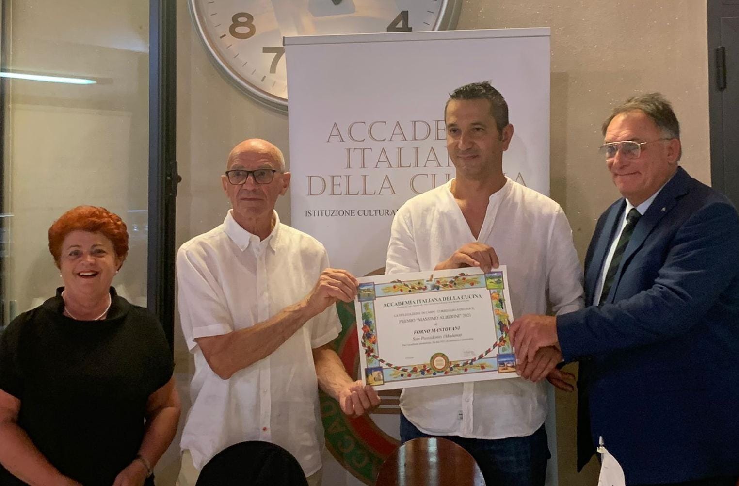 Riunione conviviale presso il ristorante “Due Barche” di San Possidonio (MO) in occasione della quale è avvenuta la consegna del Premio “Massimo Alberini" (2021) al Forno Mantovani di San Possidonio. Il prestigioso riconoscimento a Cristiano Mantovani, fornaio e panificatore di quarta generazione, è stato consegnato dal Delegato di Carpi-Correggio Pier Paolo Veroni. Presenti all’evento, il Sindaco Carlo Casari e l'assessore alle attività produttive del Comune di San Possidonio Roberta Bulgarelli. Il menu è stato molto apprezzato grazie al coordinamento della titolare, la signora Marzia, instancabile e molto attenta ai commensali. Foto 1. Da sinistra: Assessore Bulgarelli, Sindaco Casari, premiato Mantovani, Delegato Veroni. Foto 2. Tavolo. Foto 3. La titolare Marzia, lo staff di sala e Veroni. Foto 4. Dal menu: gnocco fritto con prosciutto; coscia e sovra coscia di faraona all'uva bianca con patate al forno; Bensone "al savor" del forno Mantovani.