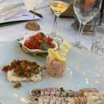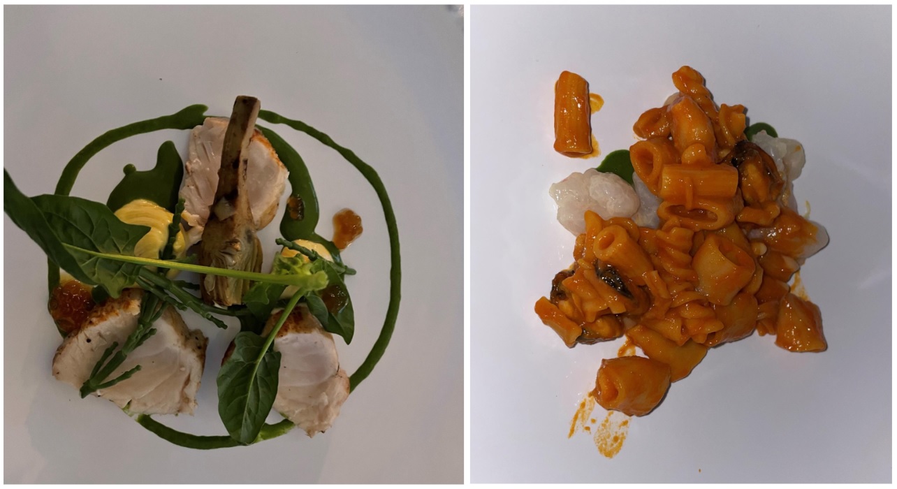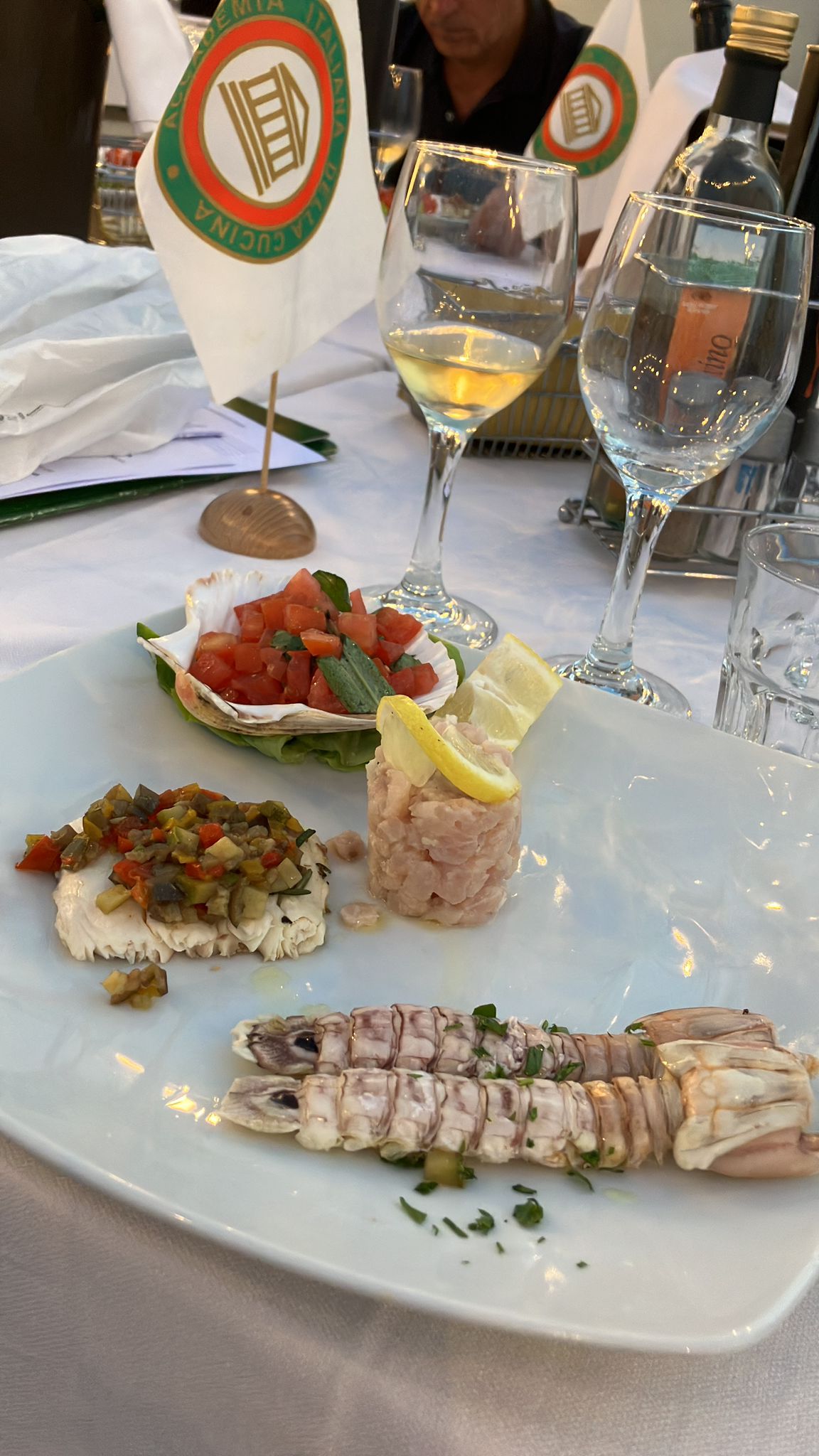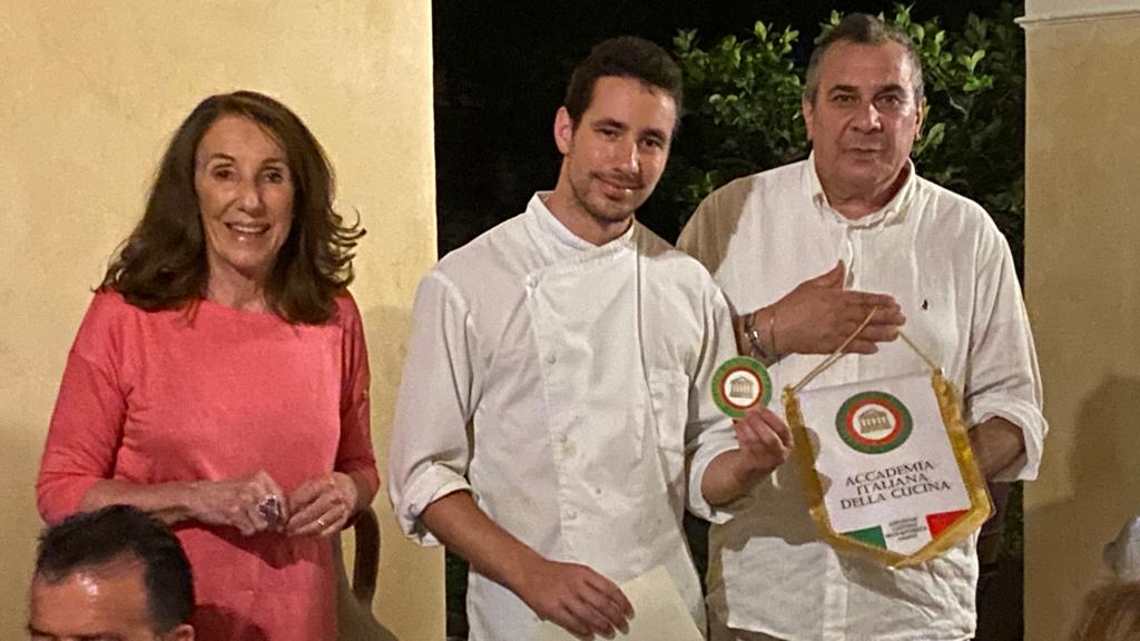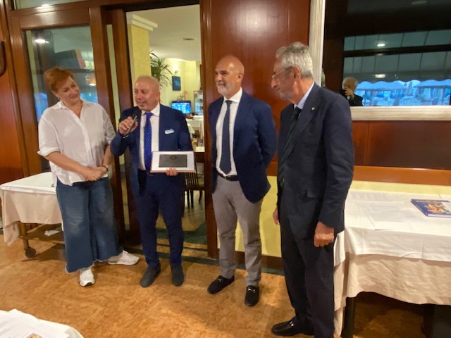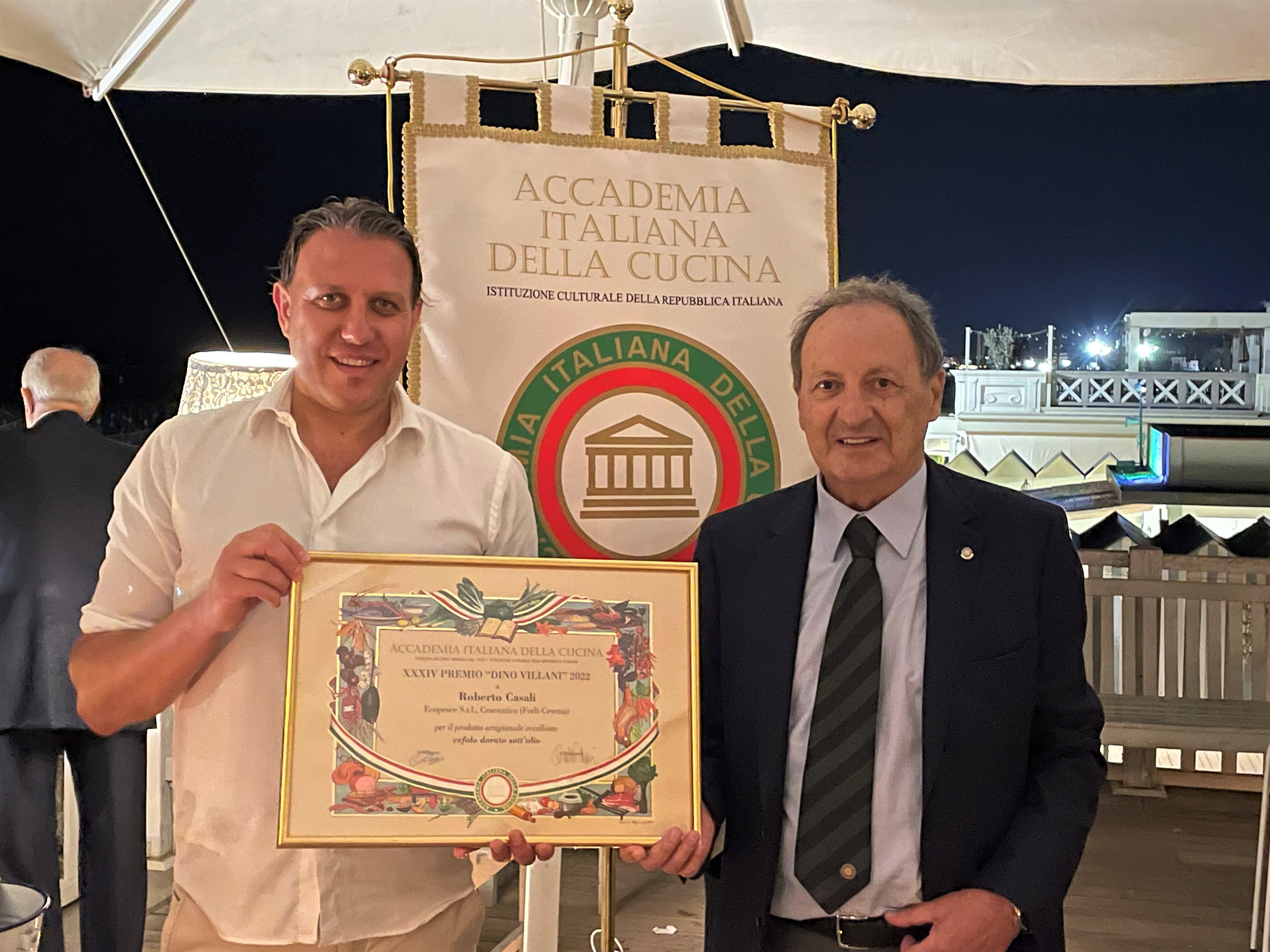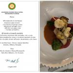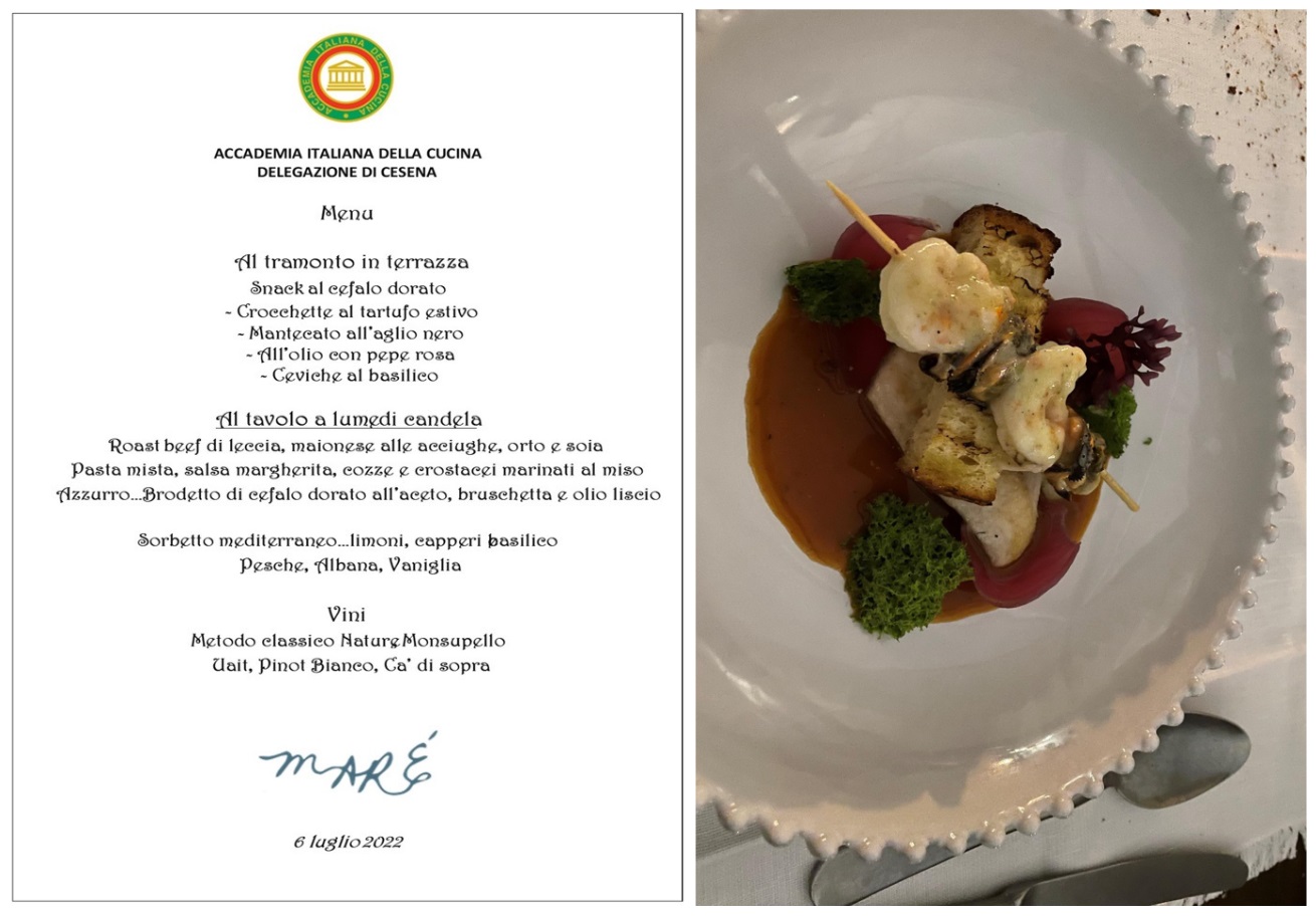 Per la riunione conviviale di luglio, l’ultima prima della pausa estiva, la Delegazione cesenate si è ritrovata sulla terrazza panoramica del ristorante Maré, in prossimità del molo di Cesenatico. È stata l’occasione per consegnare il prestigioso Premio Villani all’azienda Ecopesce di Cesenatico per il prodotto “Cefalo dorato sott’olio”. Il Cefalo dorato dell’Adriatico è stato il protagonista principale della serata con la sua presenza sia negli snack di aperitivo, preparati in 4 diverse forme, sia nel brodetto di pesce, nella versione locale all’aceto, bruschetta e olio liscio. Il menu è stato completato da Roast beef di leccia, maionese alle acciughe, orto e soia; Pasta mista, salsa margherita, cozze e crostacei marinati al miso e infine da un rinfrescante sorbetto mediterraneo limoni, capperi e basilico. La serata ha risposto pienamente alle aspettative e si è conclusa con la consegna del guidoncino della Delegazione allo chef Omar Casali, che ha curato personalmente i piatti nella cucina contigua alla terrazza. Al suono della campana, non è mancato il tradizionale brindisi augurale fra gli Accademici per le ormai prossime vacanze. Foto 1. Il Delegato Claudio Cavani consegna il premio Villani a Mattia Acquaviva, Direttore generale di Ecopesce; Foto 2 e 3. Menu della conviviale e alcuni piatti serviti; Foto 4. Consegna del guidoncino a Omar Casali, chef del Ristorante Maré.