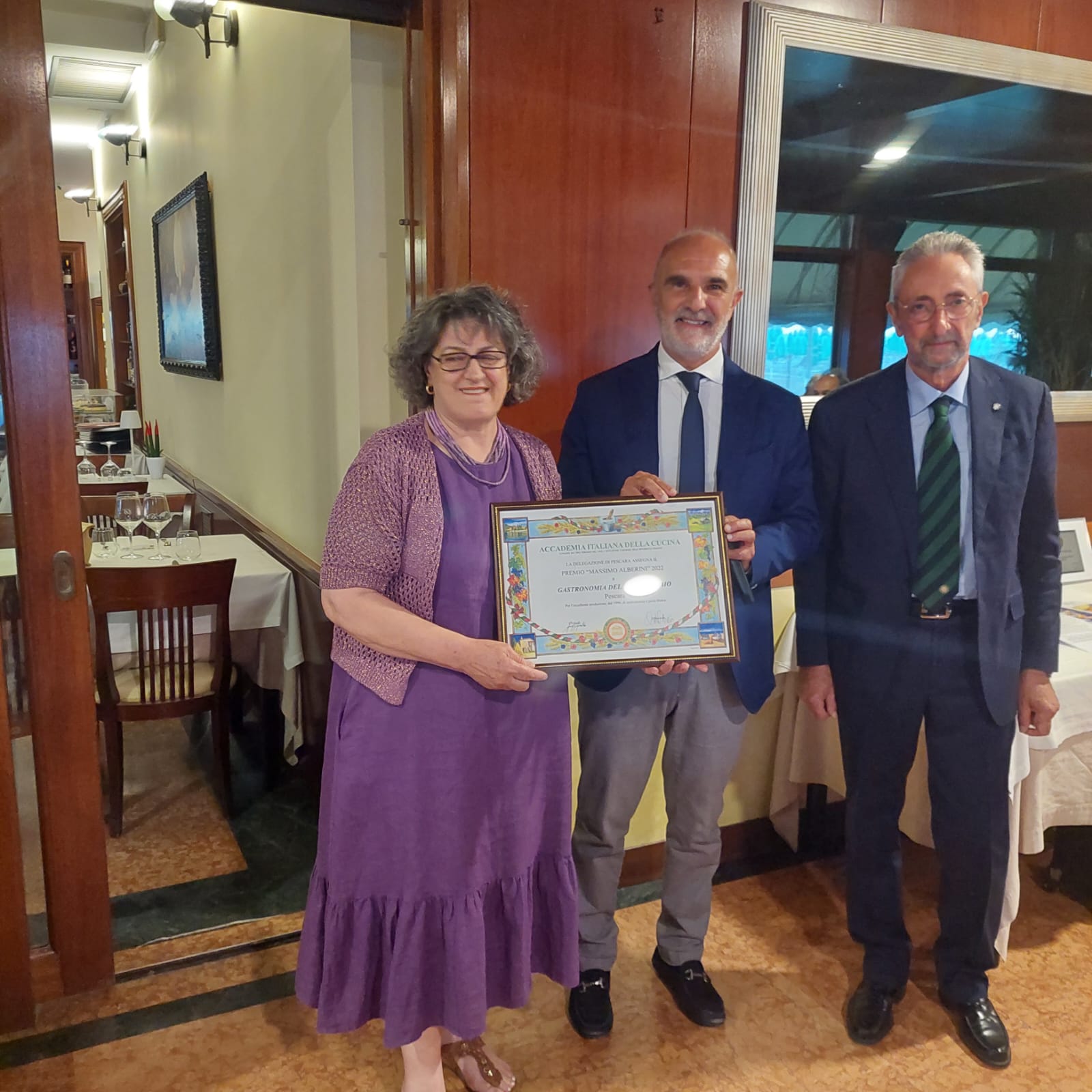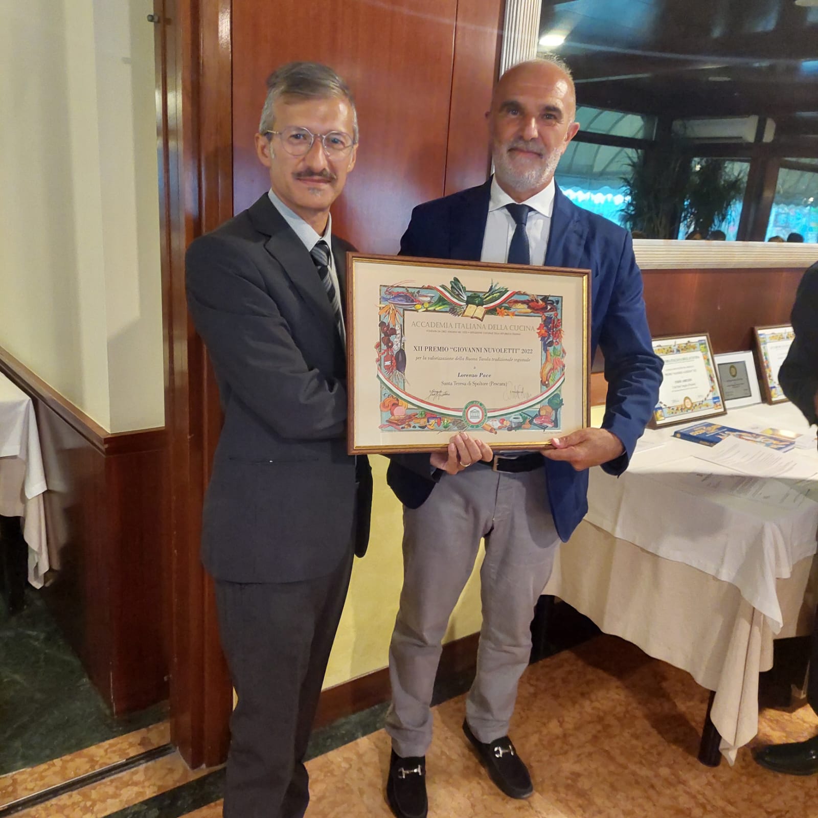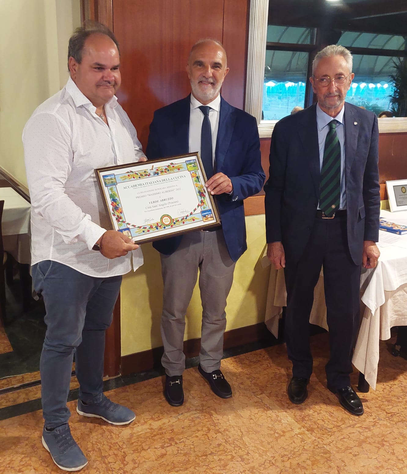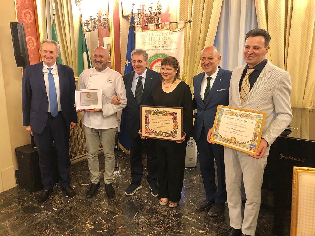 La Delegazione di Pescara si è riunita al ristorante “Marechiaro da Bruno” sul Lungomare di Pescara, fondato nel 1991 per iniziativa di ristoratori di origine napoletana e attualmente gestito da Bruno Micomonico, al quale è stato assegnato il Diploma di Buona Cucina (foto 1). Numerosi i premi elargiti nel corso della serata, per mano del Delegato Giuseppe Fioritoni e del Sindaco di Pescara Carlo Masci. Due i Premi “Massimo Alberini” assegnati per il 2022: il primo alla Gastronomia del Buongustaio di Maria Pia Bellante, che dal 1996 nel pieno centro di Pescara, propone una varietà di piatti preparati con ingredienti di prima qualità, per lo più a km zero (foto 2); L’altro a Verde Abruzzo s.r.l. in persona dell’amministratore Gianni Fragassi, azienda a gestione familiare che a Città Sant’Angelo coltiva, seleziona e lavora alcuni prodotti agricoli tradizionali, anche in regime biologico certificato (olive, pomodori, altri ortaggi e legumi). Punta di diamante della produzione è la passata di pomodoro a pera (foto 3). Il Premio “Giovanni Nuvoletti” 2022 è stato assegnato a Lorenzo Pace, Presidente dell’Unione Cuochi Abruzzesi per il quadriennio 2019-2022, docente esperto di enogastronomia abruzzese e co-fondatore dell’Ordine dei Cavalieri dei Maccheroni alla Chitarra (foto 4).