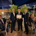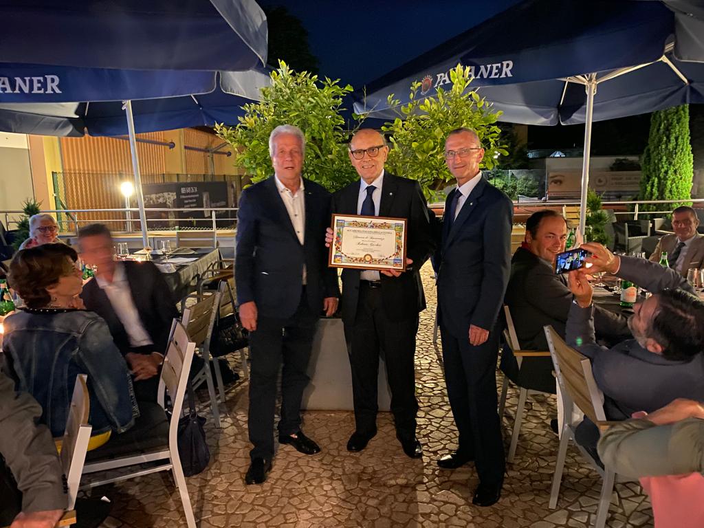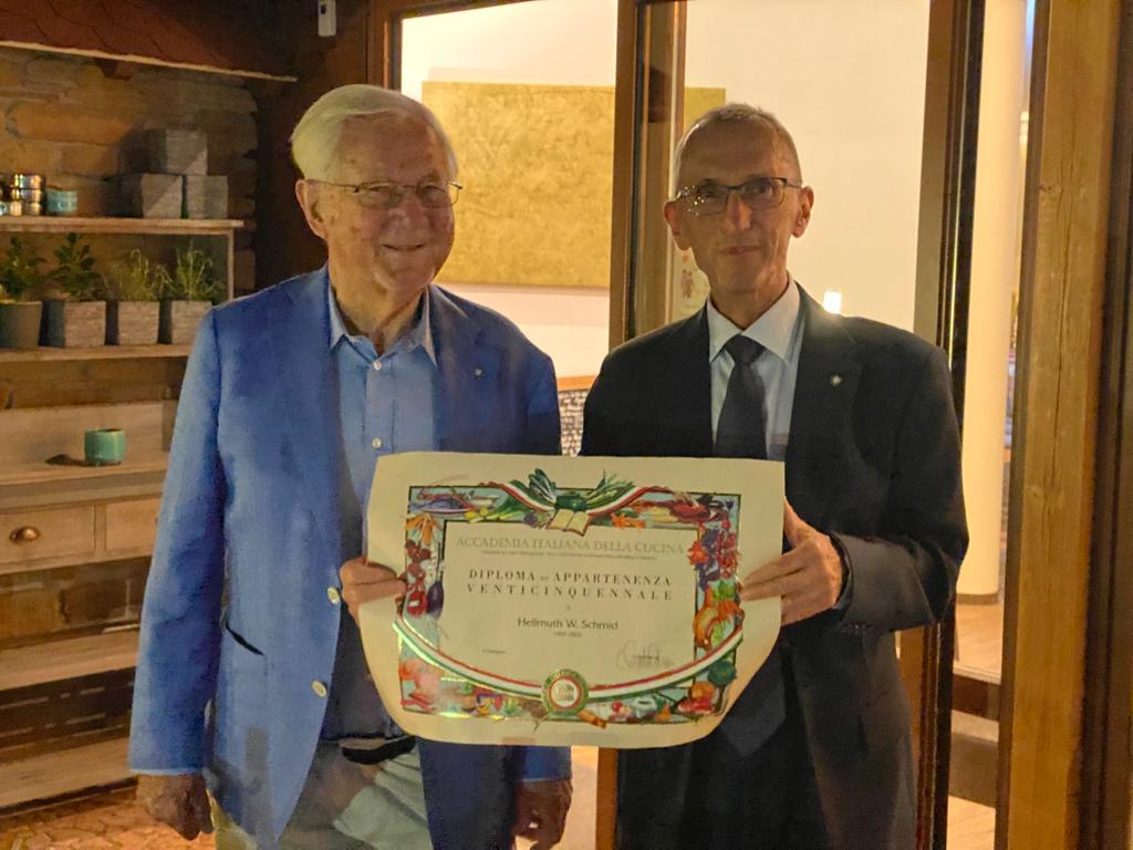 Lo splendido tramonto estivo del giorno più lungo dell’anno ha fatto da cornice alla riunione conviviale organizzata dai due Simposiarchi Uli Kreuzer e Fabrizio Ricci nel ristorante “Ettore da Elters”. Per l'occasione, ai numerosi Accademici convenuti e ai loro ospiti, è stata riservata ad uso esclusivo l'ampia terrazza. Lo chef Ettore Lindura, che gestisce da circa un anno questo locale mai visitato in precedenza dalla Delegazione, ha presentato un menu, concordato con i due Simposiarchi, che presentava all‘interno di ogni portata i sapori del mare, della terra e delle spezie. La riuscitissima e nel complesso estremamente apprezzata serata si è conclusa con la cerimonia di consegna, da parte del Delegato, dei diplomi per i 40 e 25 anni di appartenenza all’Accademia rispettivamente ai due Accademici Roberto Cecchini (in foto 1 con il Delegato onorario Bernardo Zanghi e il Delegato Claudio Pandolfi) e Hellmuth Schmid (foto 2 con Delegato Claudio Pandolfi). Questo locale si è rivelato essere una piacevolissima sorpresa, sicuramente meritevole di menzione ed ulteriore attenzione da parte della Delegazione di Monaco di Baviera.