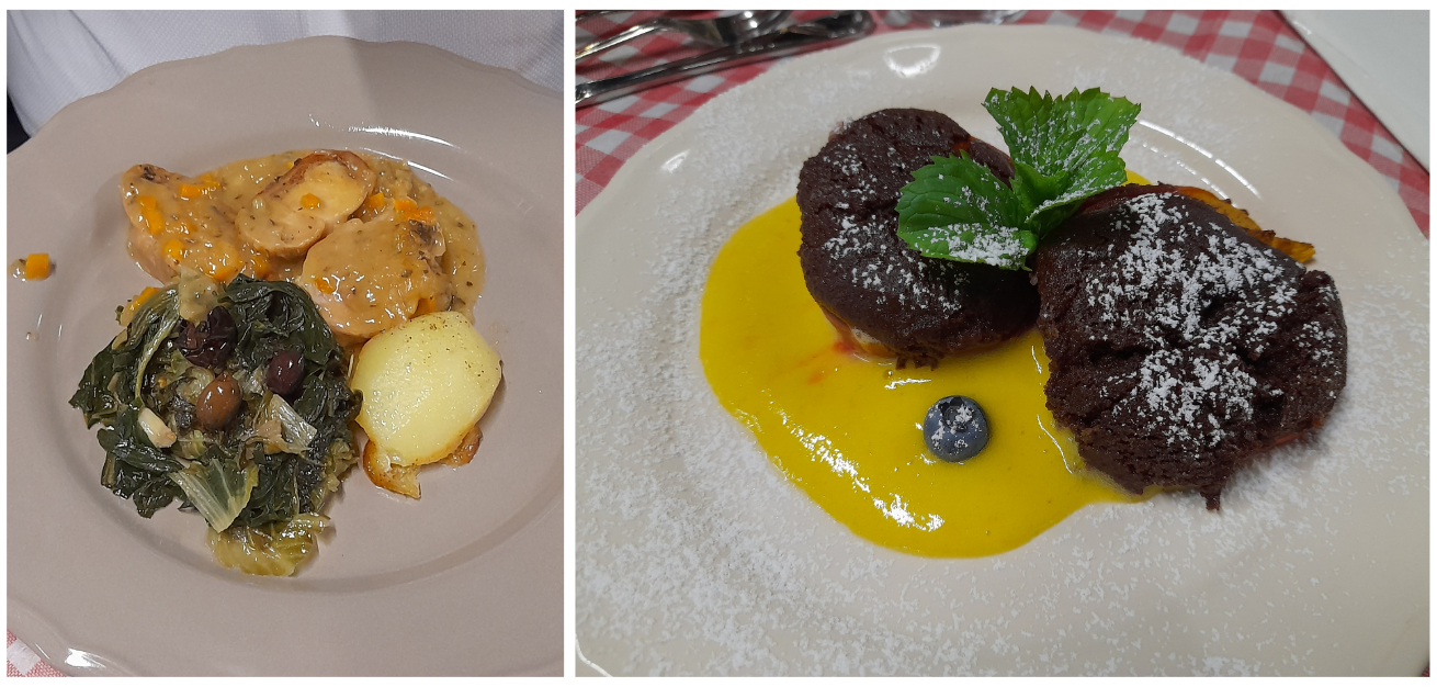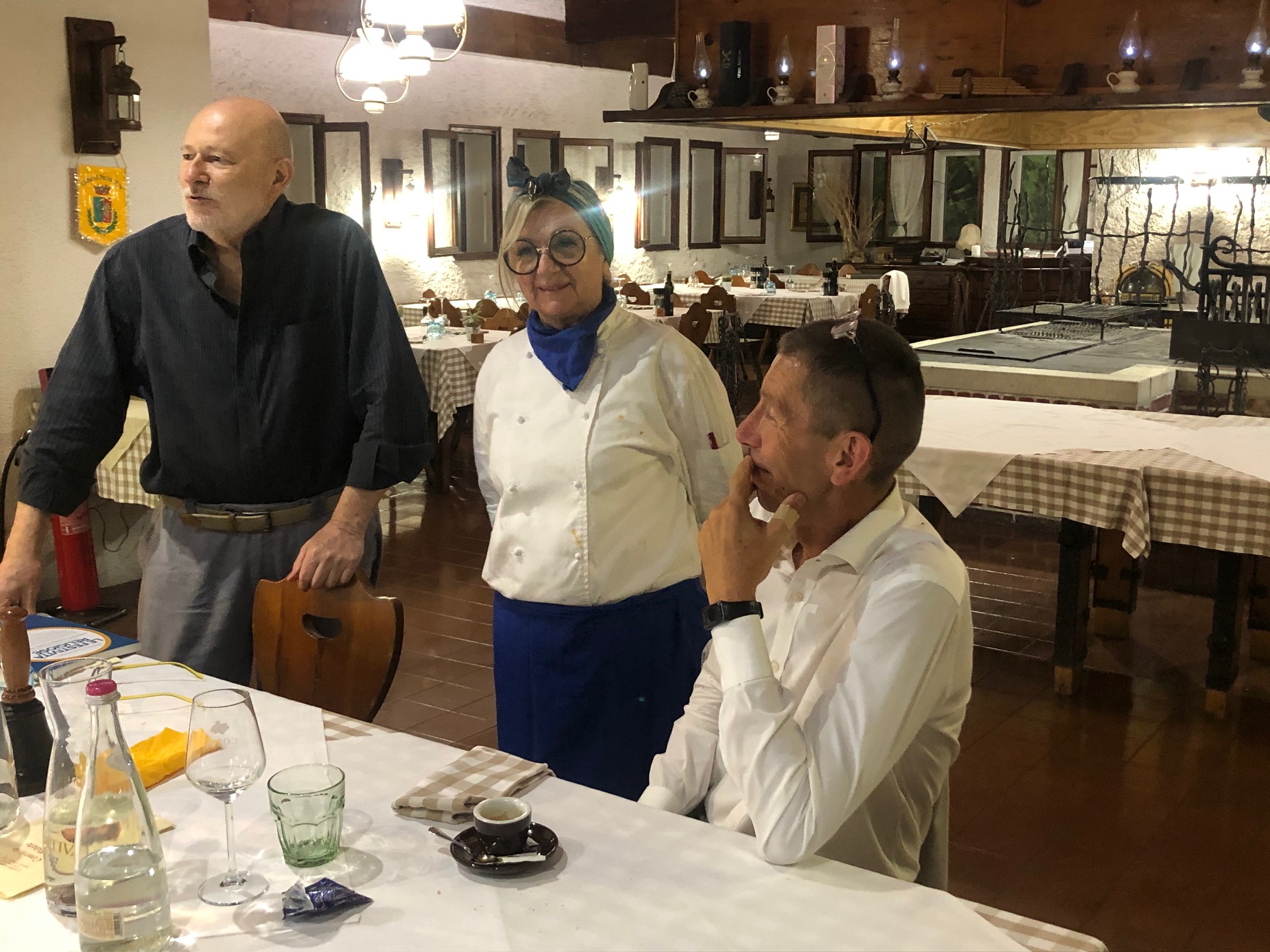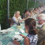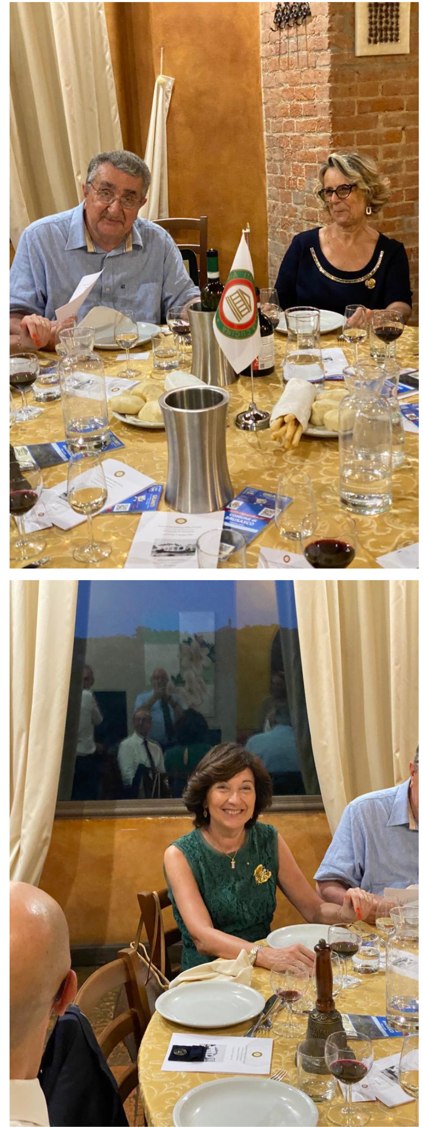Annualmente la Delegazione di Biella si ritrova in un luogo informale, al fresco, per l'ultimo convivio prima della pausa estiva. Quest’anno ha scelto la nuova gestione della trattoria Rocchi sul sentiero della Bossola di Graglia, meta di camminate o pedalate in bicicletta. Scelta felice per la bontà e genuinità dei piatti. Il menu rispecchiava la tradizione locale del territorio e della stagione. Foto 1. La sala. Foto 2. Lo chef Mimmo Fazzari e la Delegata Marialuisa Bertotto. Foto 3. Formaggino di capra di benvenuto; zuppa gratinata di punte di ortiche. Foto 4. Rolatina di coniglio con cicorietta spadellata; pesche ripiene.