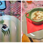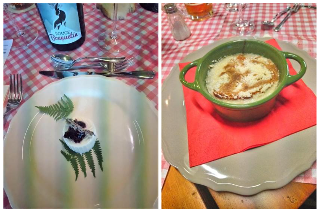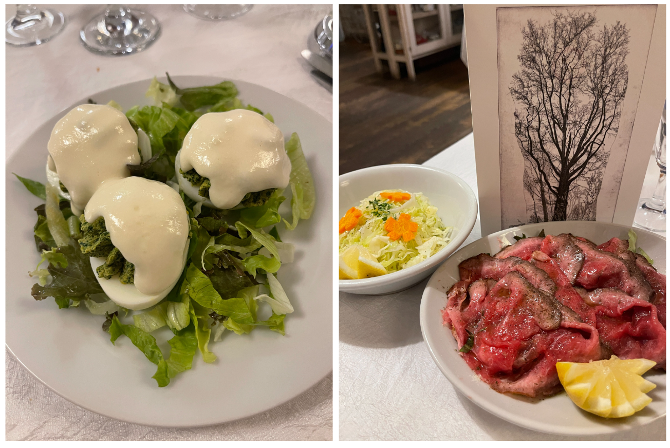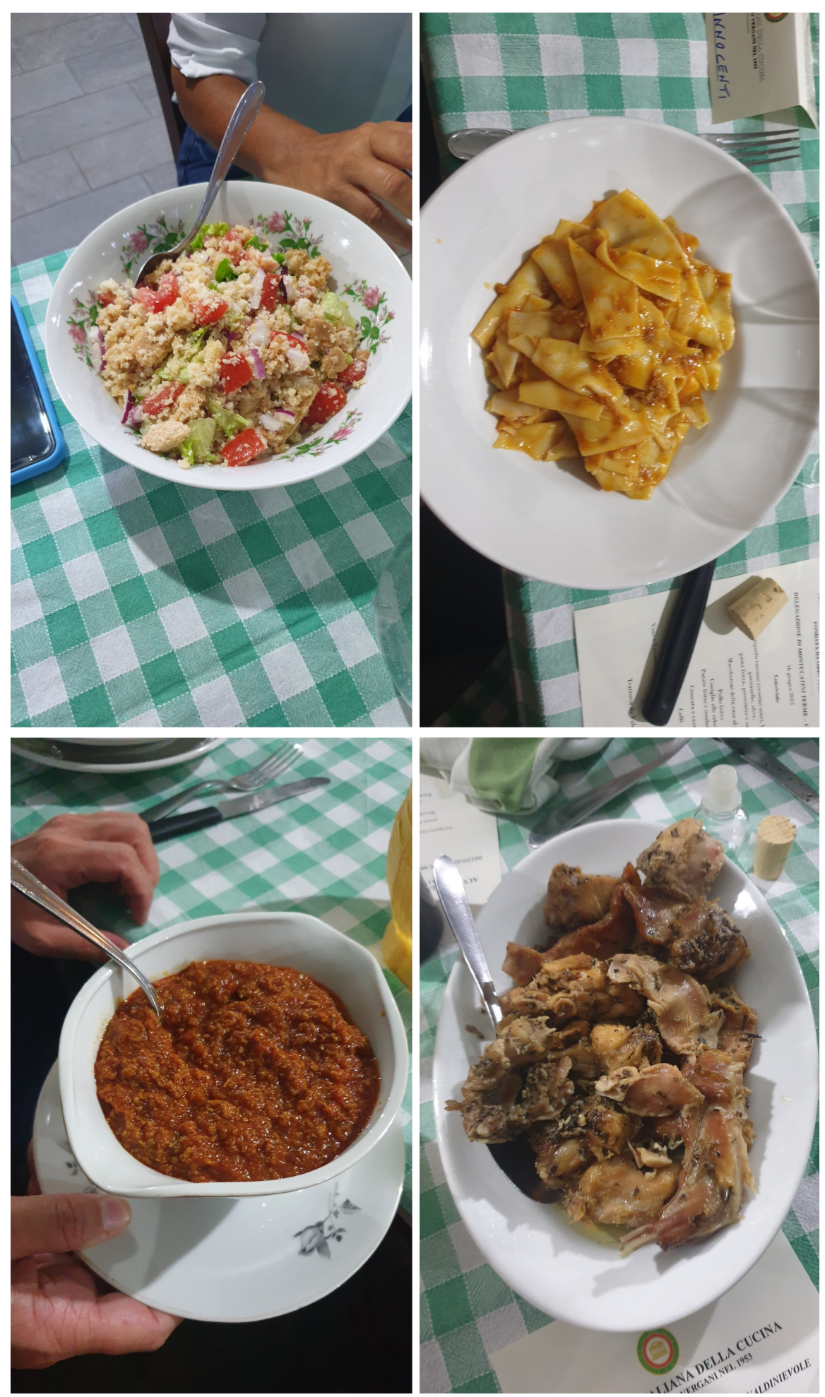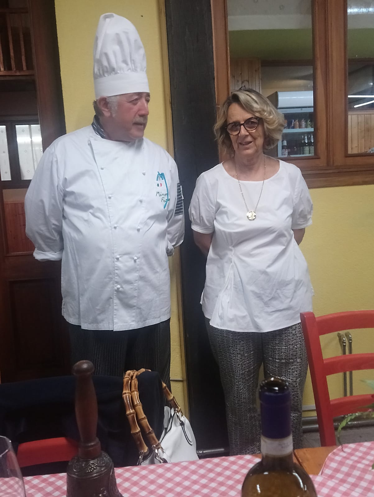Annualmente la Delegazione di Biella si ritrova in un luogo informale, al fresco, per l'ultimo convivio prima della pausa estiva. Quest’anno ha scelto la nuova gestione della trattoria Rocchi sul sentiero della Bossola di Graglia, meta di camminate o pedalate in bicicletta. Scelta felice per la bontà e genuinità dei piatti. Il menu rispecchiava la tradizione locale del territorio e della stagione. Foto 1. La sala. Foto 2. Lo chef Mimmo Fazzari e la Delegata Marialuisa Bertotto. Foto 3. Formaggino di capra di benvenuto; zuppa gratinata di punte di ortiche. Foto 4. Rolatina di coniglio con cicorietta spadellata; pesche ripiene.