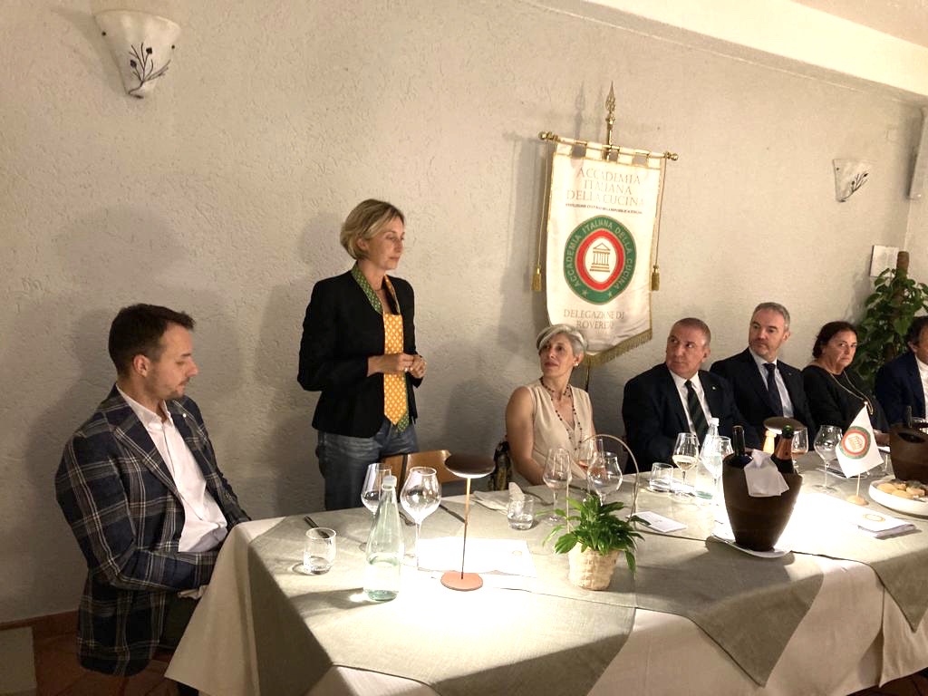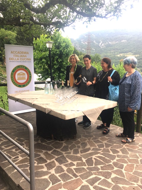 Riunione conviviale estiva della Delegazione di Rovereto e del Garda Trentino (foto 1 Accademici e ospiti) splendidamente organizzata dalla Simposiarca Francesca Manfrini presso il ristorante “La Casina” a Drena (TN). Presenti il Sindaco del Comune di Drena Giovanna Chiarani e il Sindaco del Comune di Dro Claudio Mimiola (nella foto 2, da sinistra, il Giacomo Malfer, l’avv. Silvia de’Lutti, il Sindaco di Drena, il Delegato, il Sindaco di Dro e la Simposiarca Manfrini). Dopo la degustazione all’esterno di un piacevole Trento Doc Brut Millesimato 2017 (foto 3), gli Accademici hanno molto apprezzato il menu scelto per l’occasione (in foto 4 una selezione dei piatti: zucchina farcita con speck e formaggio Fontal; pappardelle alla clorofilla con ragù di vitello e asparagi). Molto dotte e interessanti le relazioni che si sono susseguite durante la cena: Francesca Manfrini ha presentato la storia del Castelletto di Drena e Silvia de’Lutti e Giacomo Malfer hanno commentato i vini proposti in abbinamento alle portate.
