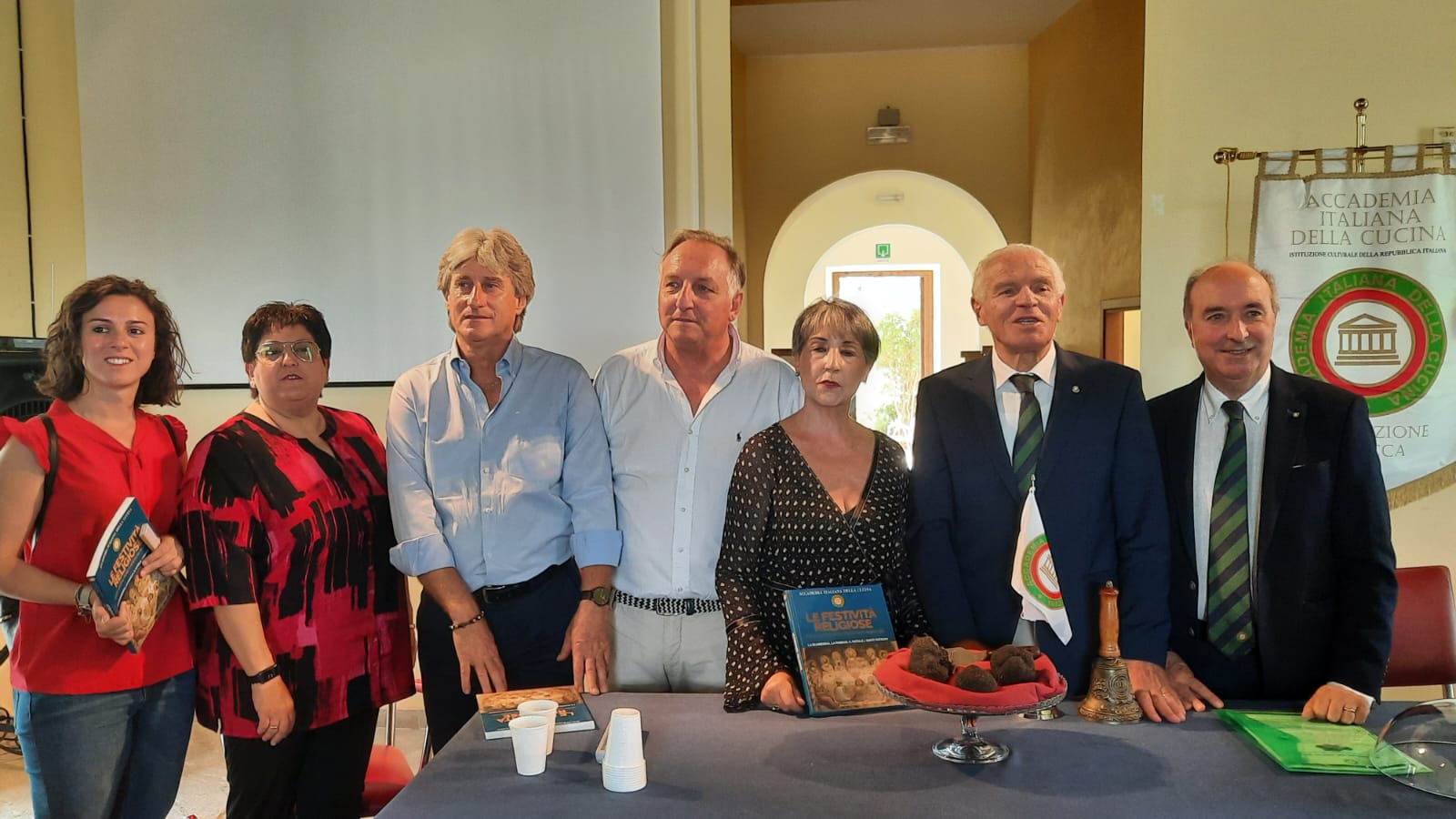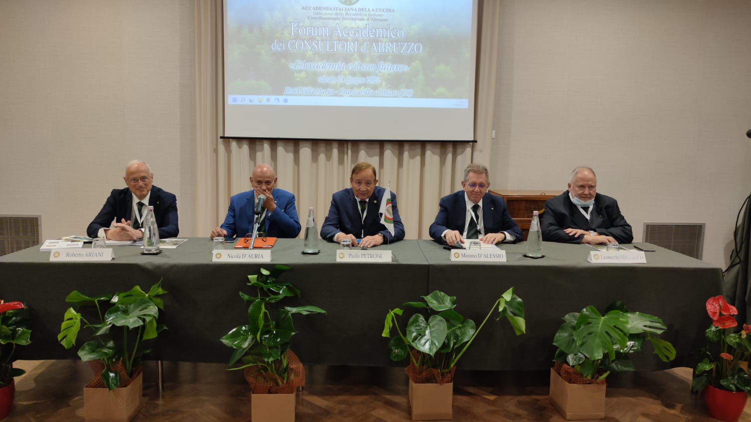 “L’Accademia e il suo futuro”: questo il titolo del "Forum regionale delle Consulte d'Abruzzo" che si è svolto sabato 25 giugno presso l’Hotel Villa Maria di Francavilla al Mare (CH), con la partecipazione di tutti i consultori delle nove delegazioni abruzzese alla presenza del Presidente Paolo Petroni e del Segretario Generale Roberto Ariani. Riuniti dal Coordinatore Territoriale, Nicola D’Auria, gli oltre 70 partecipanti hanno riflettuto su temi di importante attualità alla luce delle novità introdotte nello Statuto e nel Regolamento dell’Accademia: con la supervisione del presidente Paolo Petroni, si sono avvicendati sul podio dei relatori il Vice Presidente vicario, Mimmo D’Alessio, che ha proposto una riflessione su “Cultura accademica e conviviali”, il Segretario Generale Roberto Ariani, che ha illustrato le novità statutarie in tema di consulta accademica, e l'Accademico di Pescara Aternum Leonardo Seghetti, membro del Centro Studi “Franco Marenghi”, che ha disquisito sul tema “Gusto, sensi e valutazione accademica”. Al termine delle relazioni, il Direttore del Centro Studi Territoriale, Maurizio Adezio, ha intervistato Peppino Tinari, chef del ristorante “Villa Maiella” di Guardiagrele, che ha tratteggiato le sfide dei ristoratori in questo tempo di post-pandemia. Foto 1. Il Presidente Paolo Petroni, il Vice Presidente vicario Mimmo D'Alessio, il Segretario Generale Roberto Ariani con i nove delegati d'Abruzzo. Foto 2. Il tavolo dei relatori: da destra Roberto Ariani, Nicola D'Auria, Paolo Petroni, Mimmo D'Alessio, Leonardo Seghetti. Foto 3. L'intervento del Presidente Petroni. Foto 4. Il Coordinatore Terrritoriale D'Auria e il Vice Presidente vicario D'Alessio consegnano il guidoncino dell'Accademia alla brigata di cucina.