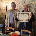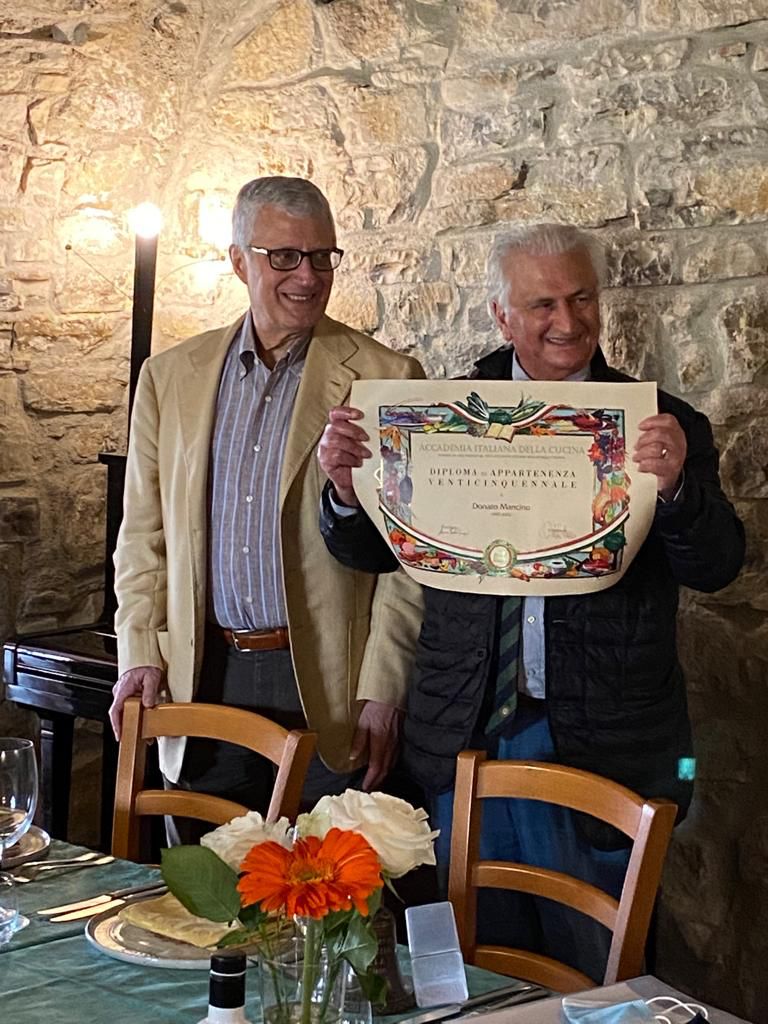 Il menu della memoria. Questo il titolo della proposta messa in tavola per la Delegazione potentina dalla famiglia Guarini-Allegretti, proprietari e gestori della Foresteria di San Leo a Trivigno (PZ). Antico eremo benedettino del 1300, comprendente i resti dell'Abazia di San Leone e oltre centocinquanta ettari di terreno coltivati di proprietà dalla famiglia Guarini da circa un secolo, la Foresteria diventa una struttura ricettiva apprezzata dai turisti in cerca di tranquillità circa vent’anni fa, quando Peppino Guarini e sua moglie Maria Giovanna, scelgono di “condividere i silenzi, i colori e i profumi di questo pezzetto di storia”, affacciato sulle suggestive Dolomiti lucane. Il ristorante è riservato agli ospiti della Foresteria, ma si apre all'esterno per piccoli numeri. Sotto la direzione attenta di Maria Giovanna, instancabile ricercatrice di ricette e sapori della tradizione, arrivano nel menu l'uovo alla purgatoria, la minestra di cicerchie, i ravioli con ricotta e noci, i bocconcini di maiale con peperoni in agrodolce, i dolci delle occasioni speciali. Il tutto, dalla carne ai formaggi, prodotto nell'azienda annessa, alla cui gestione si è aggiunta oggi la figlia Andreana. Ingredienti di una conviviale molto partecipata e allegra, durante la quale è stato consegnato il diploma di appartenenza venticinquennale all'Accademico Donato Mancino.
