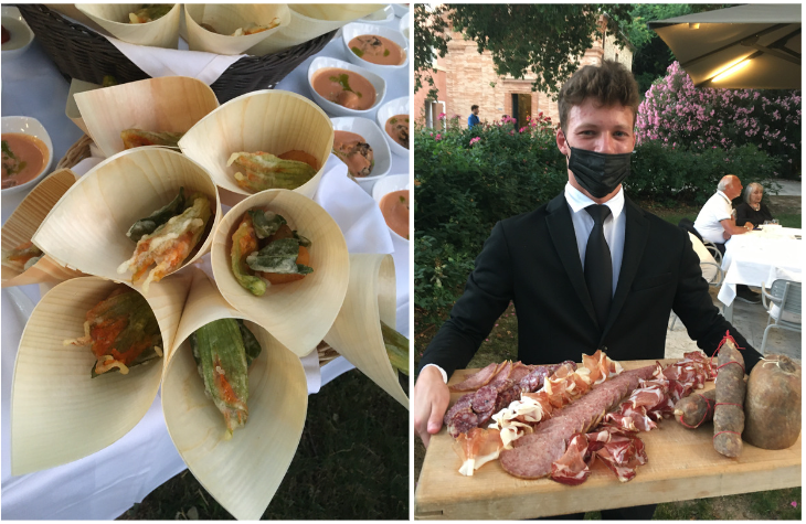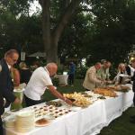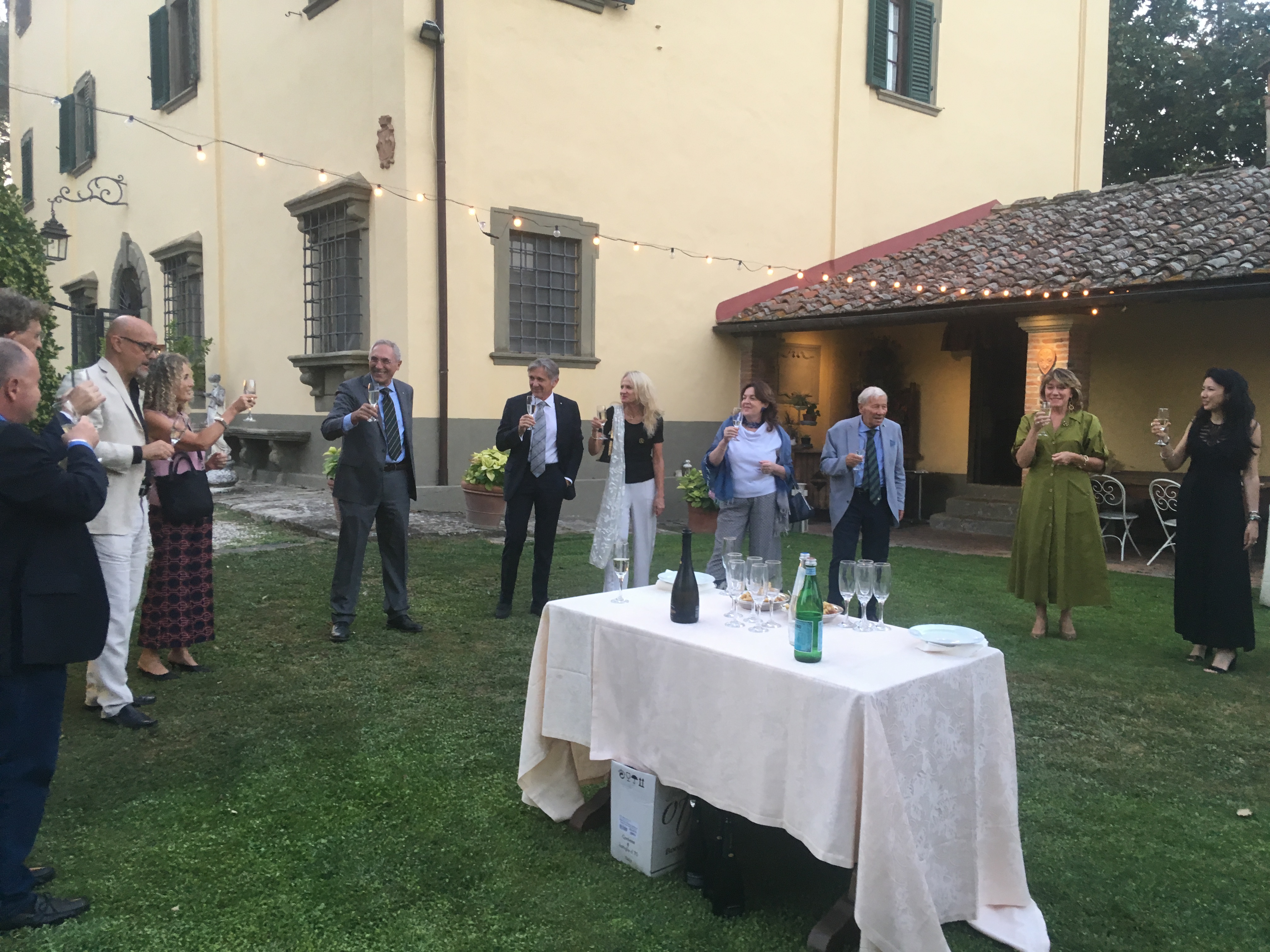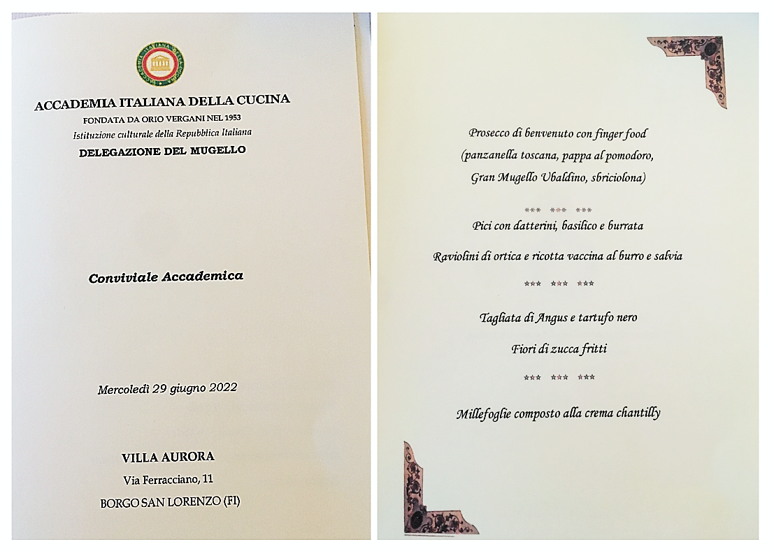 La Delegazione si è ritrovata per la riunione conviviale di giugno negli eleganti ambienti di Villa Aurora, a Borgo San Lorenzo (FI), dove Pierluigi Tagliaferri con la sua famiglia ha accolto gli Accademici con grande entusiasmo (foto 1 l’aperitivo all’aperto). Riuniti intorno ad un raffinato tavolo imperiale (foto 2) gli Accademici, i coniugi e gli ospiti hanno potuto apprezzare alcuni piatti della tradizione realizzati con una attenta selezione della materia prima e con grande cura, come la pasta rigorosamente fatta in casa. Il menu proposto ha offerto lo spunto per riflettere sulla storia di alcuni piatti, sulle eccellenze del territorio, sull’arte del riuso e infine anche sulle mode in cucina (foto 3). Una serata assai piacevole, organizzata nei minimi particolari dal Simposiarca Desiderio Naldoni, durante la quale è stato fatto il punto sulla programmazione dell’attività accademica dei prossimi mesi. Il convivio si è concluso con la consegna al patron del guidoncino e di alcune pubblicazioni accademiche (foto 4, la brigata di cucina e di sala con a sinistra Pierluigi Tagliaferri, la Delegata Monica Sforzini e il Simposiarca Desiderio Naldoni).