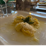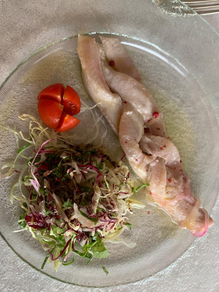 Il breve temporale estivo al momento dell’aperitivo non ha turbato la bella riunione conviviale della Delegazione Val d’Ossola dedicata al pesce di lago, svoltasi presso la terrazza panoramica del ristorante la Quartina con una splendida vista sul lago di Mergozzo (VB). In apertura di cena, un’ottima treccia di salmerino marinata con cipolla rossa, bacche di ginepro, pepe rosa e citronette, molto apprezzata dai commensali; a seguire dei buoni ravioli vegetariani alle ortiche con burro, nocciola e parmigiano e, infine, filetti di pesce persico dorati alla salvia. Conclusione in dolcezza della piacevole serata con il millefoglie con fragole, gelato alla crema e panna abbinata ad un Moscato. Inevitabili i complimenti di tutti alla chef Laura Profumo, oltre che per la buona cucina, anche per la cortesia e la disponibilità. Foto 1. Un momento conviviale. Foto 2 e 3 Treccia di salmerino; ravioli vegetariani.
