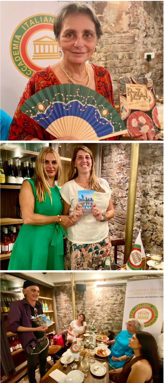 La Delegazione di Tel Aviv, dopo una pausa dovuta di nuovo alla situazione sanitaria, si è riunita per il convivio al ristorante Rustico Basel di Tel Aviv di recente rinnovato. Una serata piacevolissima, organizzata per i saluti prima delle vacanze estive, in cui l'Accademica Nessia Laniado ha parlato dell'importanza della pizza per la cucina italiana e ha presentato il suo libro sull'argomento, mentre la giornalista Fiammetta Martegani e il fotografo Mario Troiani hanno presentato due libri su Tel Aviv pubblicati di recente (in ordine in foto 1). Alla serata, divertente e movimentata, hanno partecipato vari personaggi della cultura israeliana e diplomatici (in foto 2 la Delegata Cinzia Klein con il primo segretario dell'Ambasciata d'Italia dott.ssa Sarah Castellani). L’ottimo menu è stato preparato dallo chef Gabi (foto 3, 4 piatti). Un vero successo culinario e culturale.