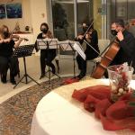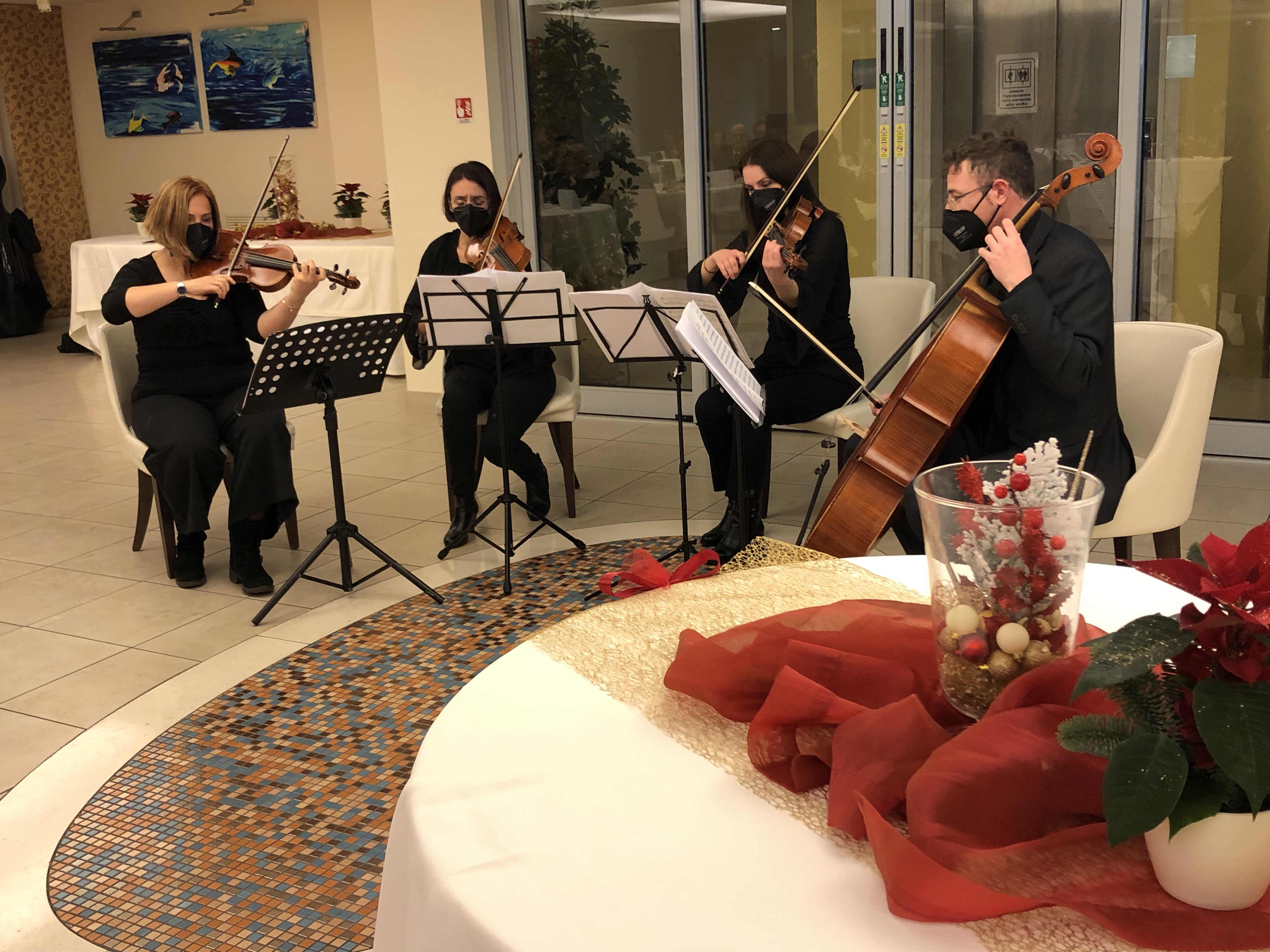 Gli Accademici di Pescara, in compagnia di familiari e ospiti, si sono ritrovati al ristorante "La Polena" di Montesilvano (PE), per la tradizionale festa degli auguri di Natale. La serata è stata allietata e impreziosita dal concerto di un quartetto d’archi (foto 1) composto da Dana Stancu ed Eleonora Di Lodovico (violino), Violeta Stancu (viola) e Federico Orlando (violoncello), che ha proposto brani classici e colonne sonore di grandi film, oltre agli immancabili canti natalizi. I Simposiarchi Paolo e Alberta Toppetti (foto 2) hanno scelto un menu di magro, assolutamente consono alle tradizioni del capoluogo adriatico per la vigilia di Natale, impeccabilmente interpretato dalla brigata di cucina guidata dalla signora Maria, titolare e chef del ristorante (in foto 3 con il Delegato Giuseppe Fioritoni).