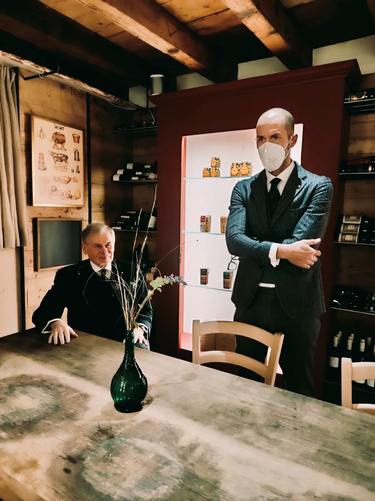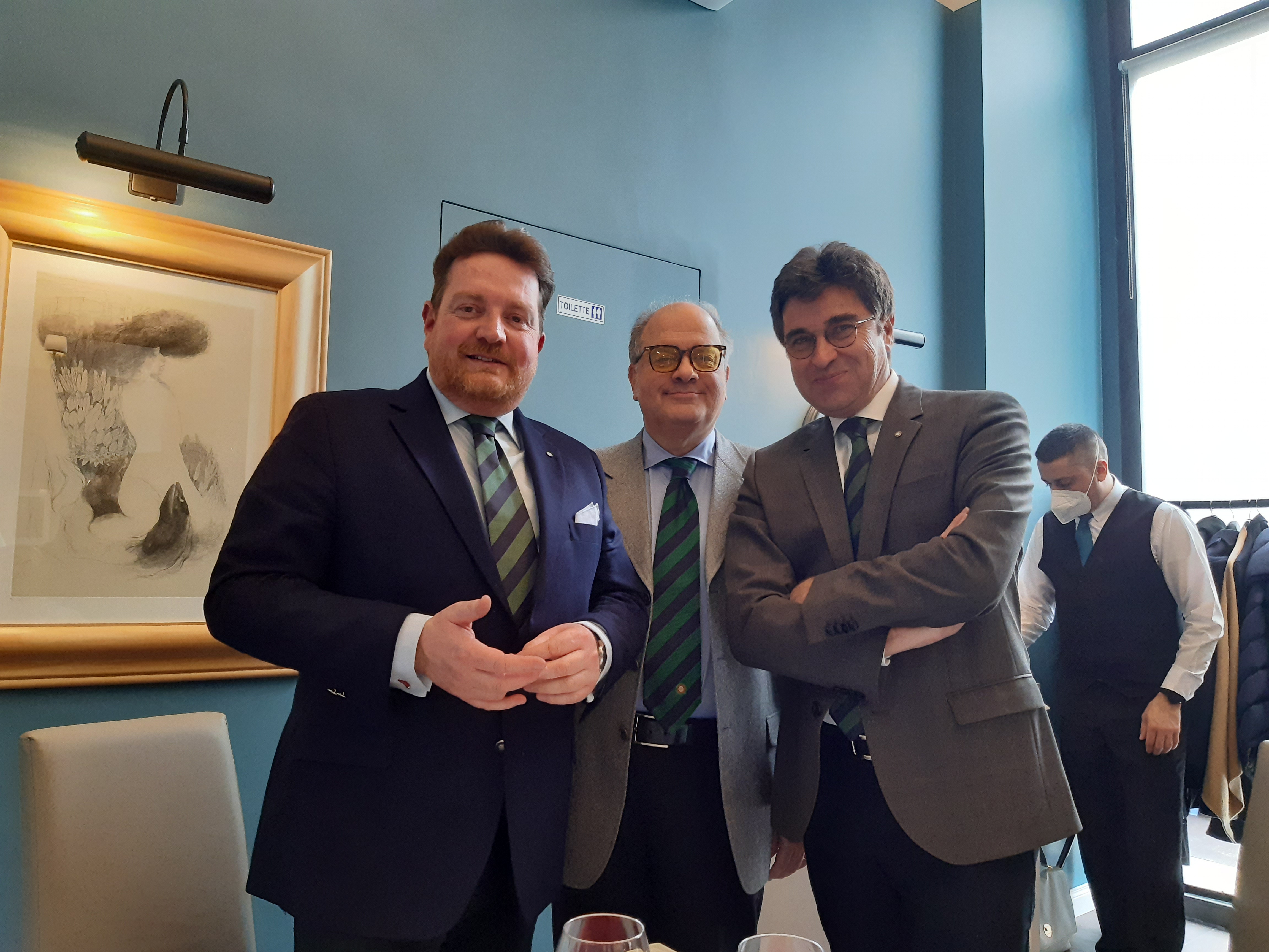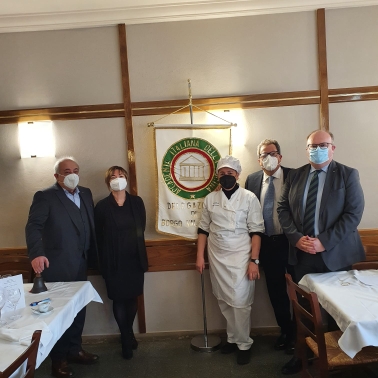 Prima riunione conviviale della Legazione di Strasburgo e Metz, istituita nel gennaio 2021, che ha scelto per la speciale occasione il ristorante “Nebbiolo” nel Comune di Peltre, contiguo a quello di Metz. Vi è stato un consenso generale, sia da parte degli Accademici sia degli ospiti, sull'eccellente qualità degli ingredienti e della loro preparazione e cottura. Il susseguirsi delle portate è parso tracciare un viaggio ideale dall'Europa settentrionale (antipasto a base di salmone) all'Italia del Nord (risotto di Vercelli, polenta), fino alla Sicilia (dolci a base di pistacchio di Bronte). Gli abbinamenti dei sapori di ogni singolo piatto sono stati audaci, forse talvolta non tipicamente italiani, ma, al tempo stesso, quasi sempre ottimamente riusciti. La scelta dei vini e l'abbinamento con i piatti è stata ritenuta perfetta. Ambiente e servizio meno soddisfacenti. Non si può definire il Nebbiolo di Peltre un ristorante tipicamente italiano ma un creativo laboratorio di sapori dove, utilizzando prodotti di qualità provenienti in buona parte dal nostro Paese, si elabora una riuscita sintesi fra la raffinata ricerca della cucina francese ed il gusto genuino di quella della Penisola. Foto 1. Da destra: Legato Emilio Lolli, l’Accademica Maria Sarnelli in Triacca, lo chef Philippe De Cuyper e la moglie Céline Rossi (titolari del “Nebbiolo”), il sommelier Philippe Aubert e l’Accademico Philippe Brunella. Foto 2. Da destra: il Legato Emilio Lolli, l’Accademica Maria Sarnelli in Triacca e l’Accademico Philippe Brunella.
